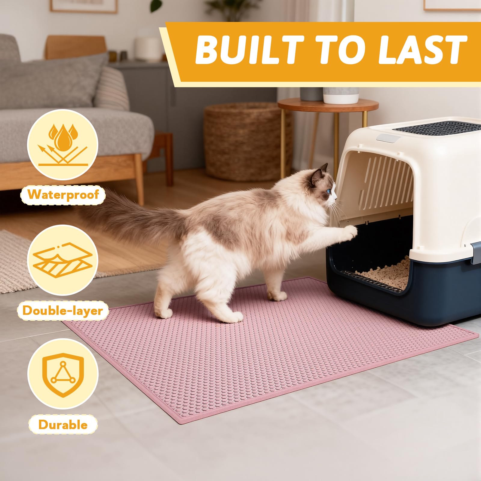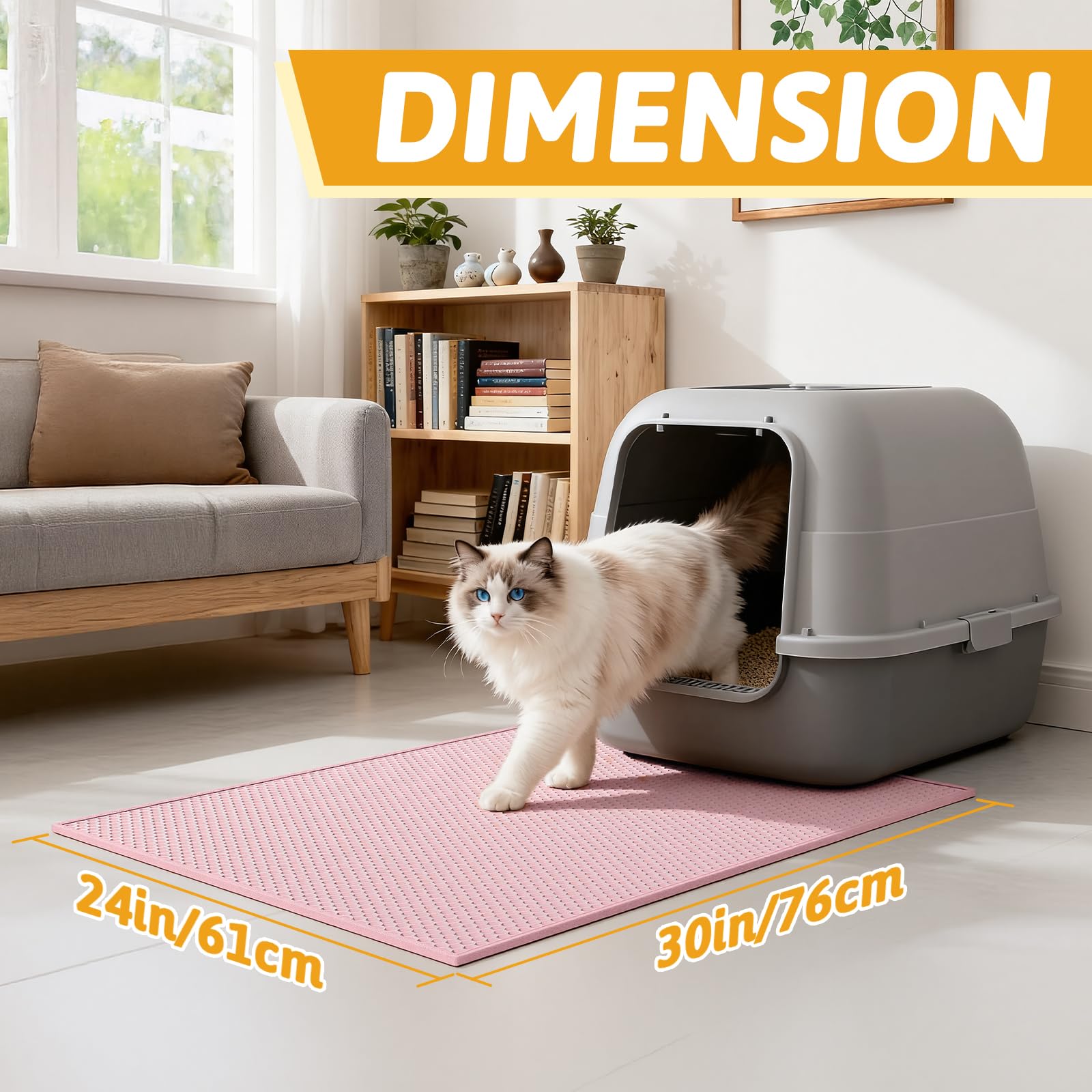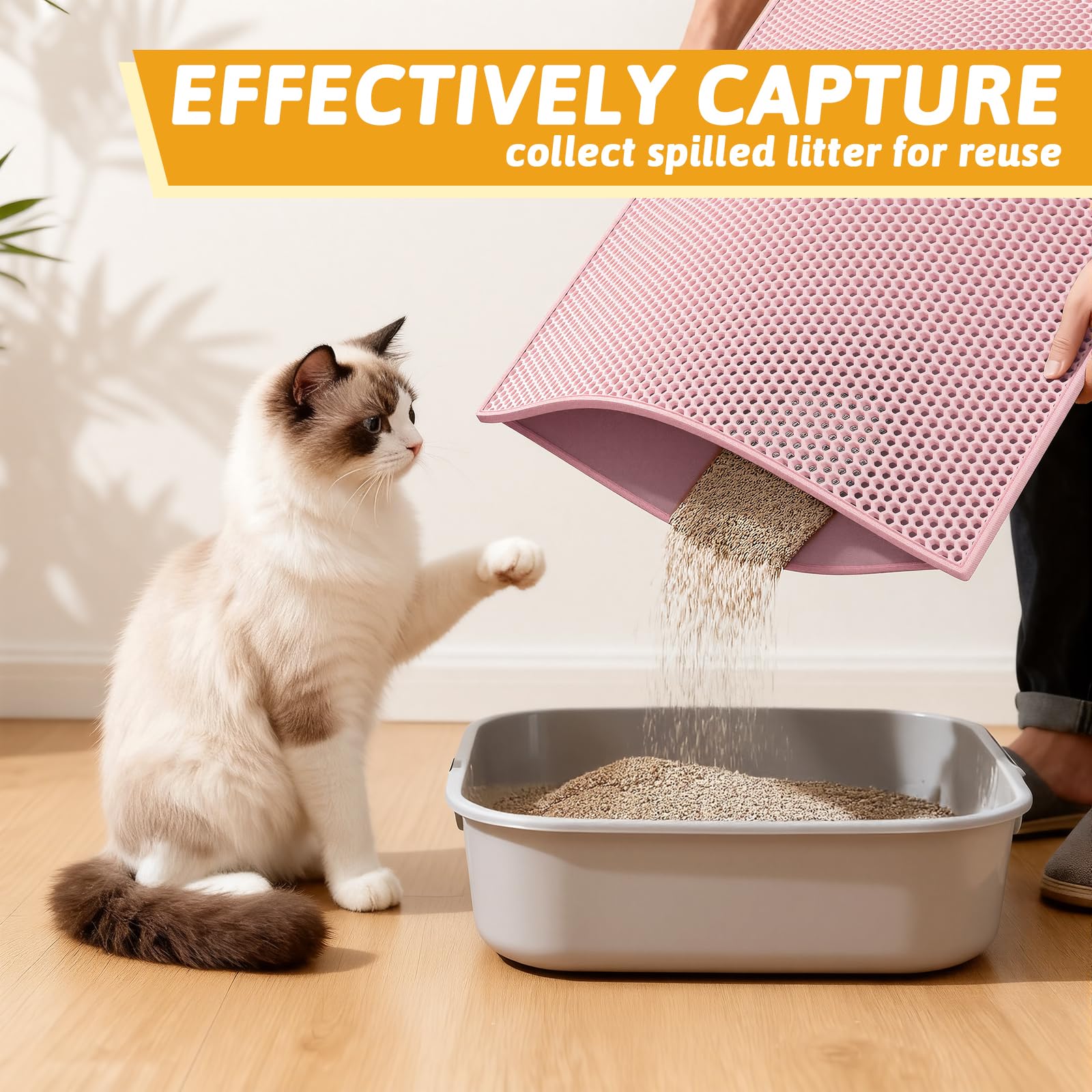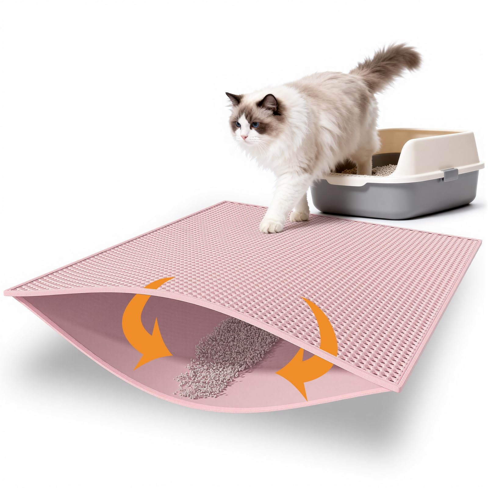 Anti Tracking EZ Open Edge Litter Mat: Double-layer honeycomb design helps you gather the litter. You just pick up the mat and all the litter falls through and then dump it back in the litter box make it recycling. BEST MAT EVER! No more getting litter stuck to my feet on a daily basis! Large holes is large enough to catch and trap litter. Suitable for lots of type of litter, and kitty litter boxes,hooded,self cleaning litter box.
