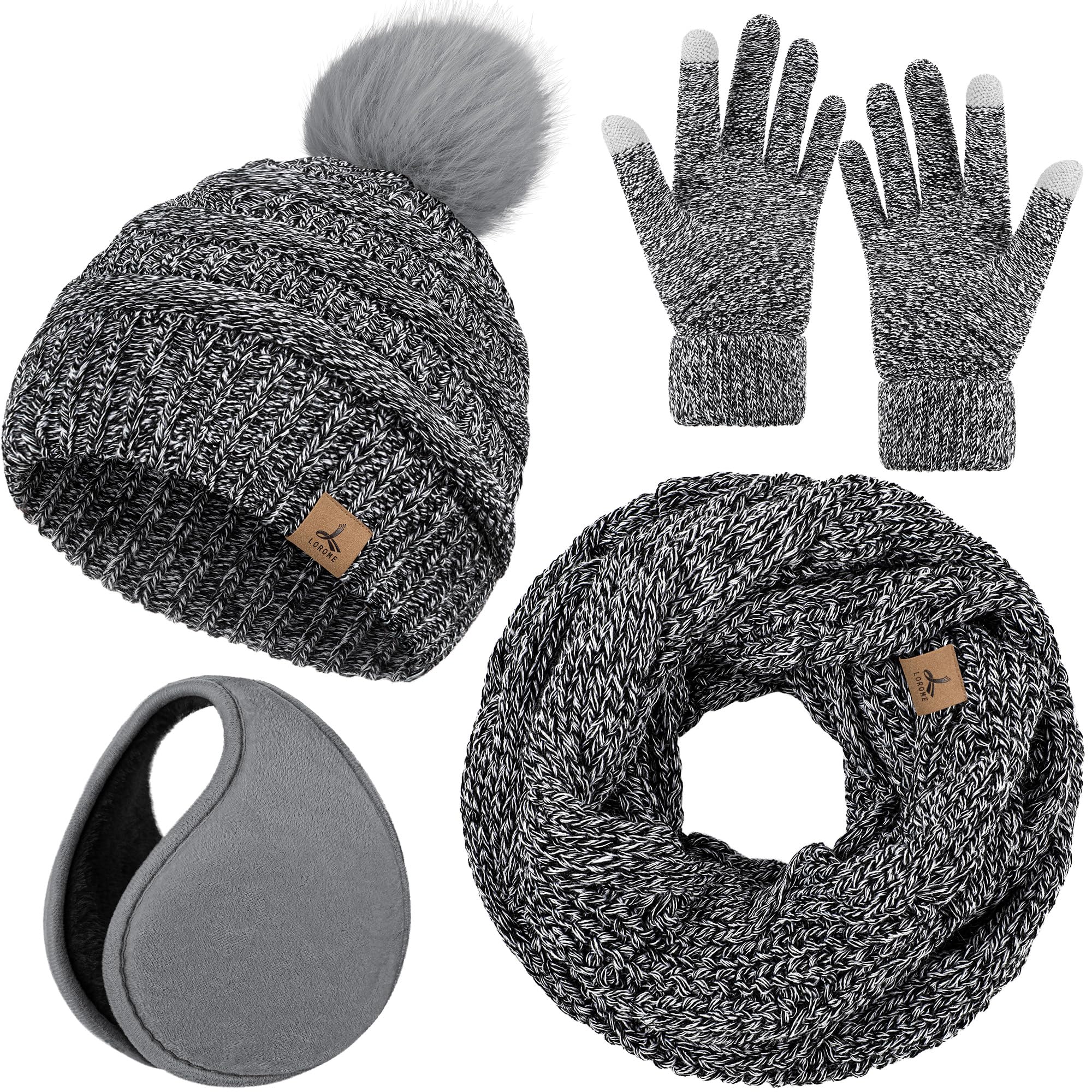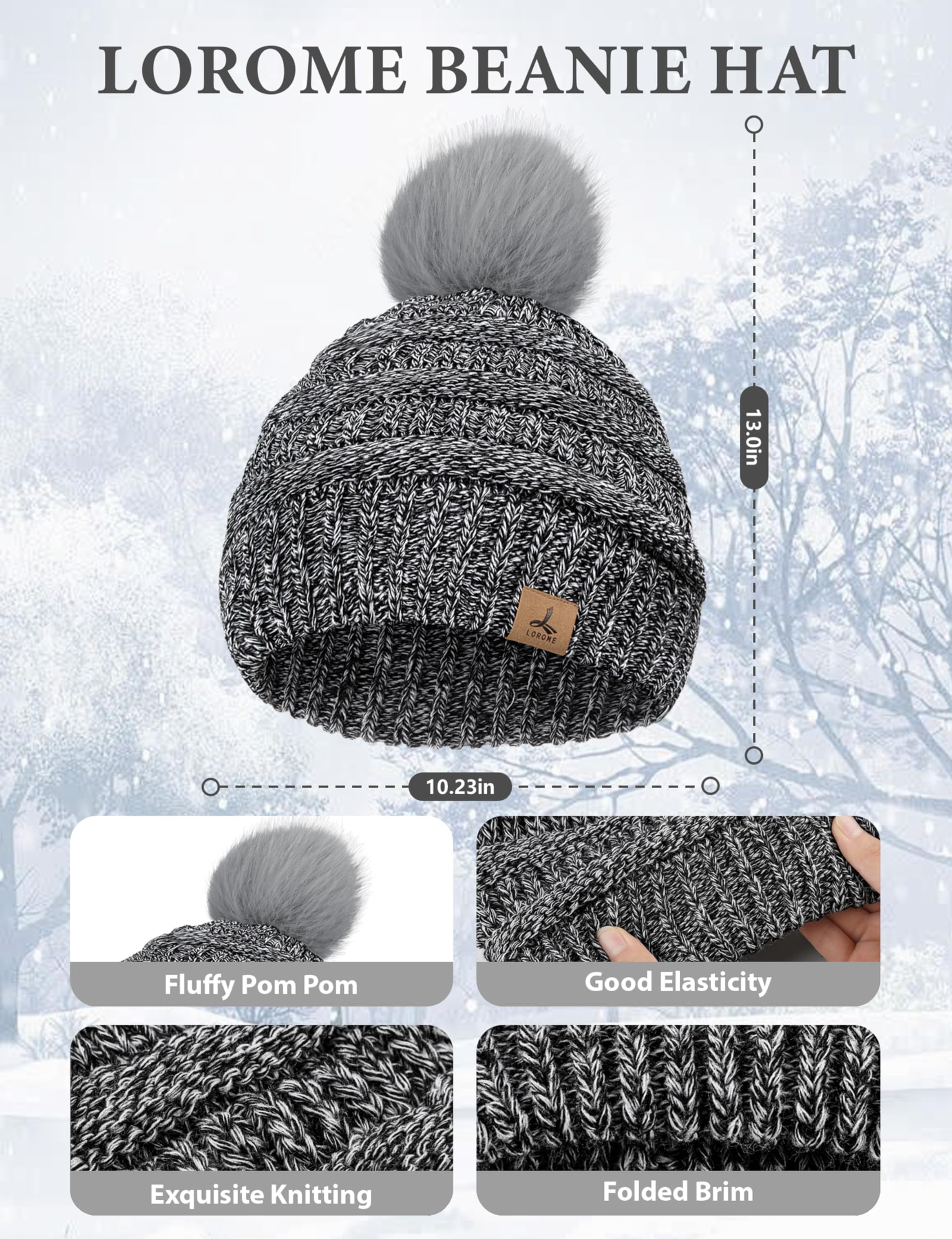 Special Design - Featuring knitting tech, soft pom pom, fine LOROME tag, black and white color, double layered and flanging brim design, thick cuff gloves with touchscreen design on thumb and index fingers, our hat and glove set is your wonderful choice for winter.