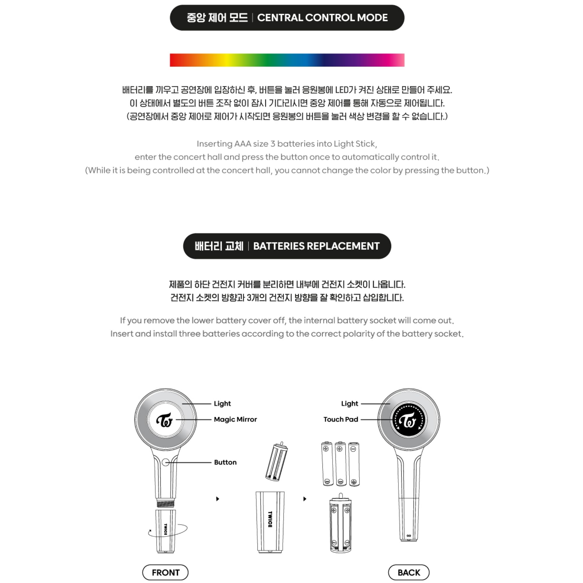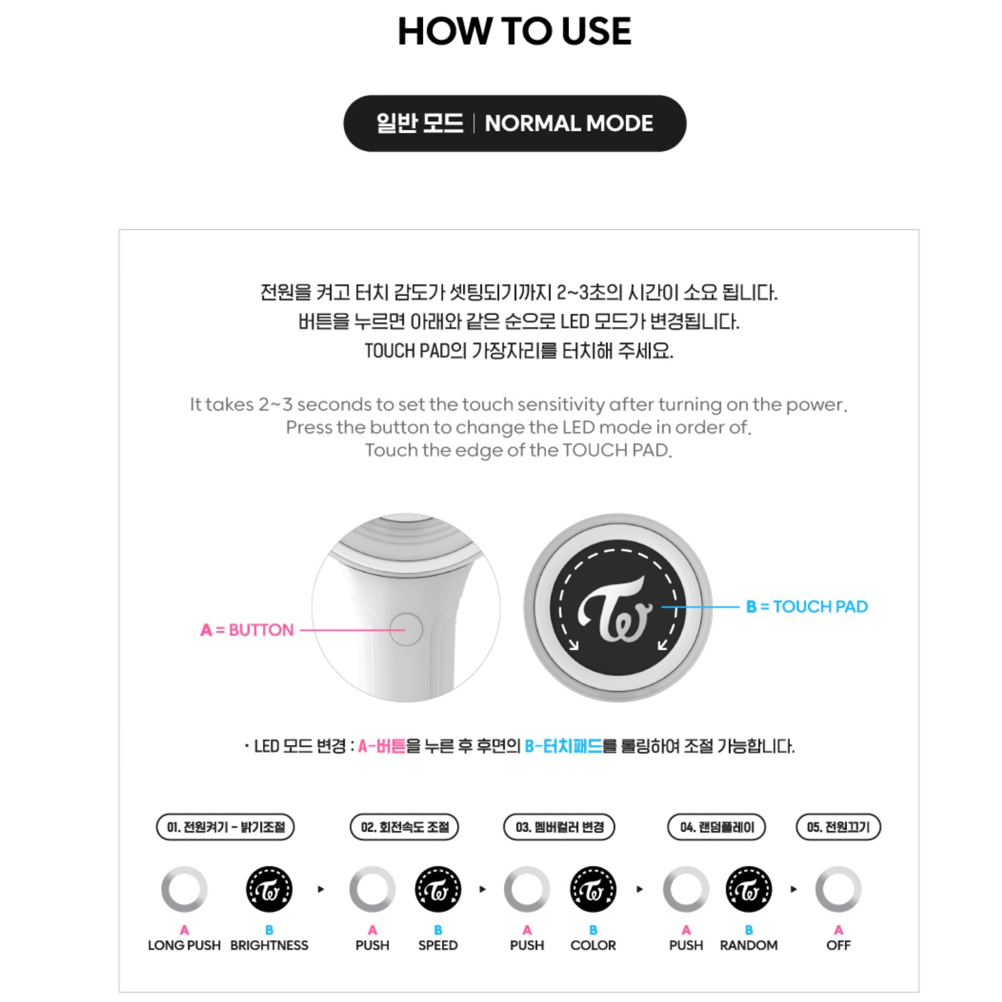 "[How to use] It takes 2~3 seconds to set the touch sensitivity after turning on the power. Press the button to change the LED mode in order of. Touch the edge of the Touch Pad. [Central Control Mode in the Concert] Enter the concert hall and press the button once to automatifcally control it. (While it is being controlled at the concert hall, you cannot change the color by pressing the button.) ※ The outer case is to protect goods. (Please note that slight scratches and discoloration of the case is not a defect of the product.) "