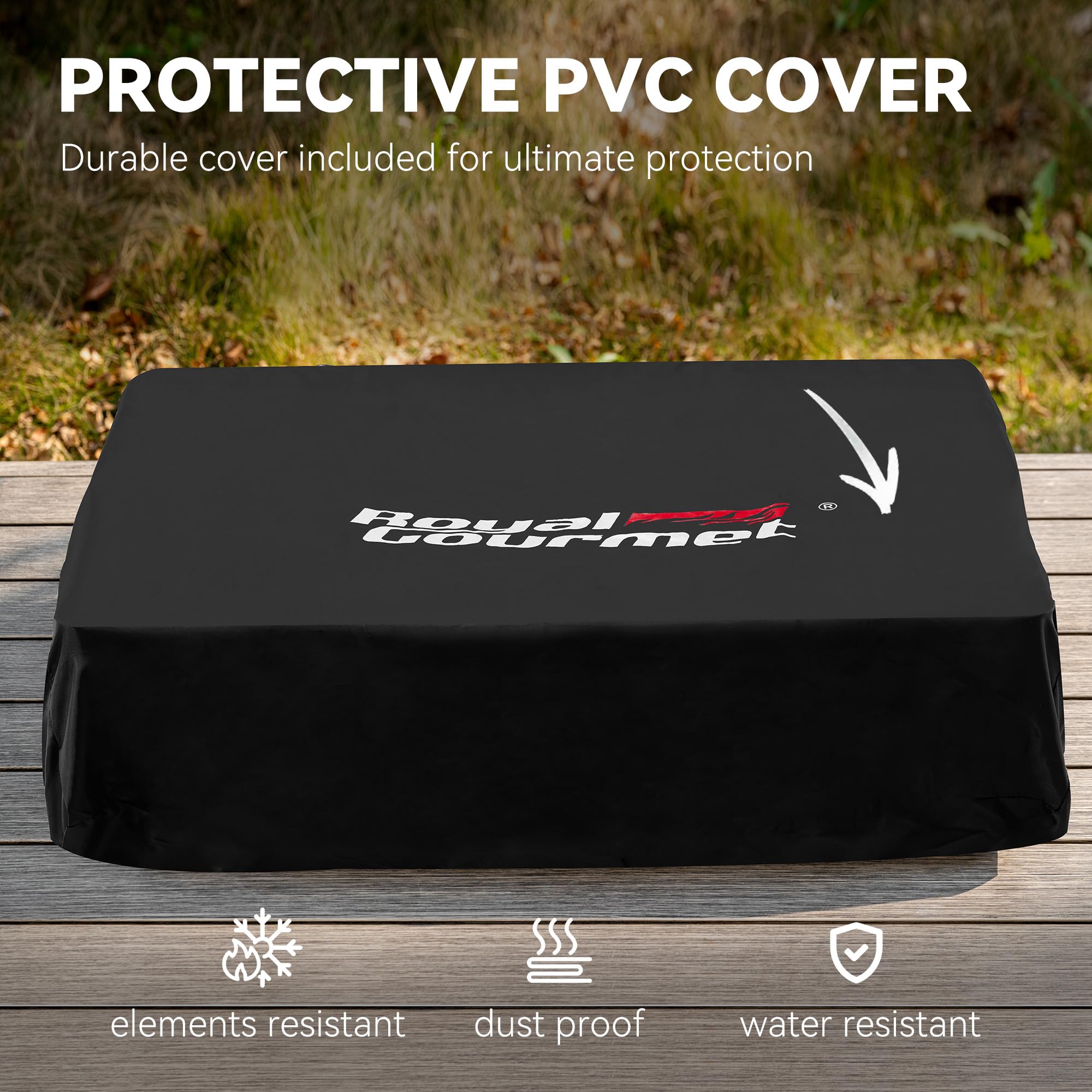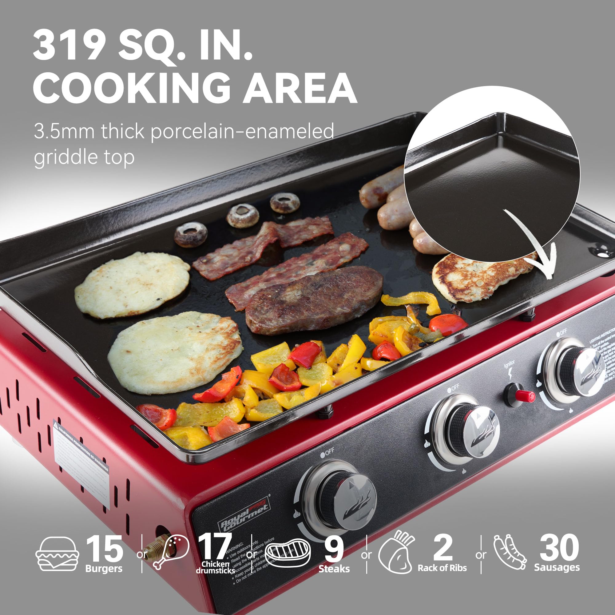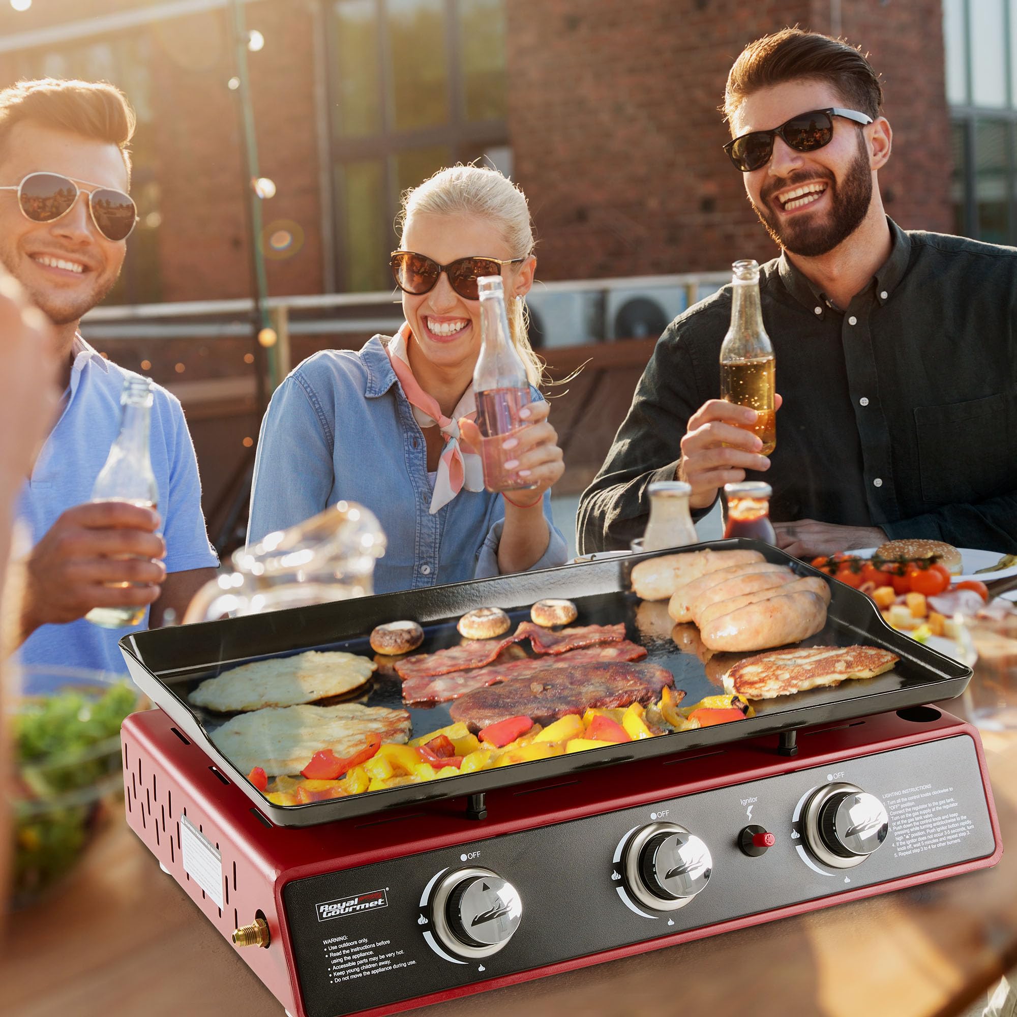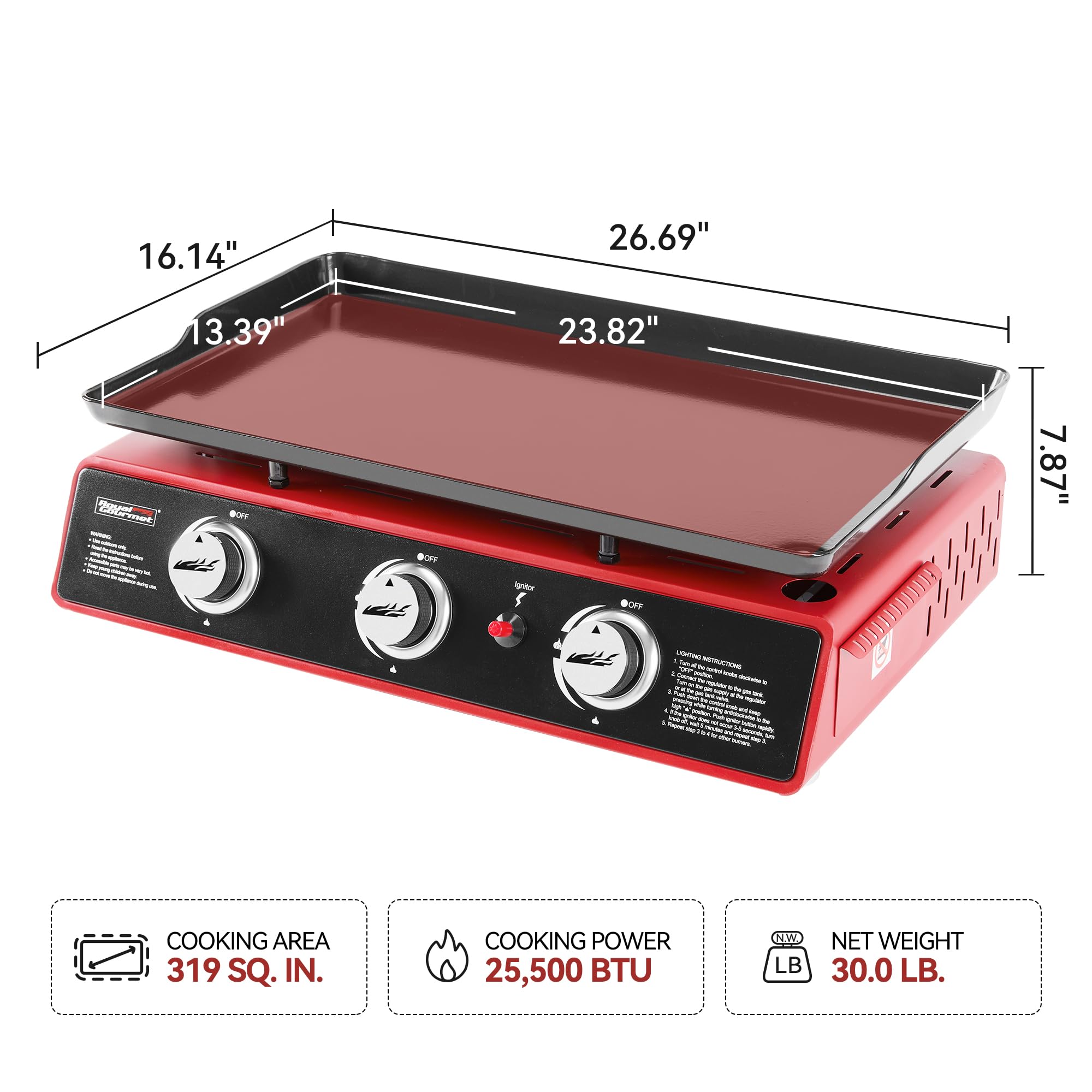 Stop manhandling those heavy, bulky backyard griddles, and show off this new grill master, Royal Gourmet® PD1301R 3-Burner Portable Gas Grill Griddle, for your family outings. This griddle has 3 round, stainless-steel burners, which provide a total of 25,500 BTUs output. It comes equipped with a porcelain enameled griddle top that offers 316 square inches of cooking area. Large space is perfect for frying rice, eggs, hash browns, French toast, bacon and hamburgers. Durable control panel with piezo ignition system enables quick start-up, making barbecue easier than ever before. Large oil cup collects grease residue for easy cleanup after use. The portable design provides much convenience for picnics, tailgate party, camping, or nights BBQ on the patio. In addition, we offer a specially designed grill cover featured with an extra thick PVC coating that is waterproof.
