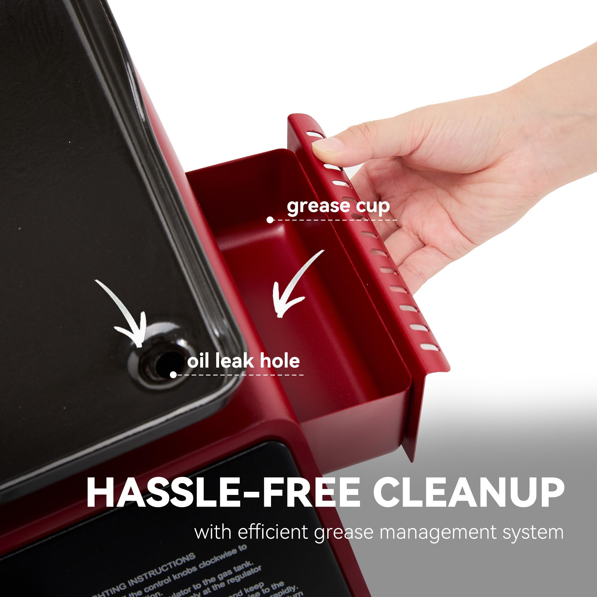 NO FUSSY CLEANUP: Removable, slide-out grease cup collects oil residue while cooking, and is easy to clean up after use. Griddle top is also detachable for washing.
