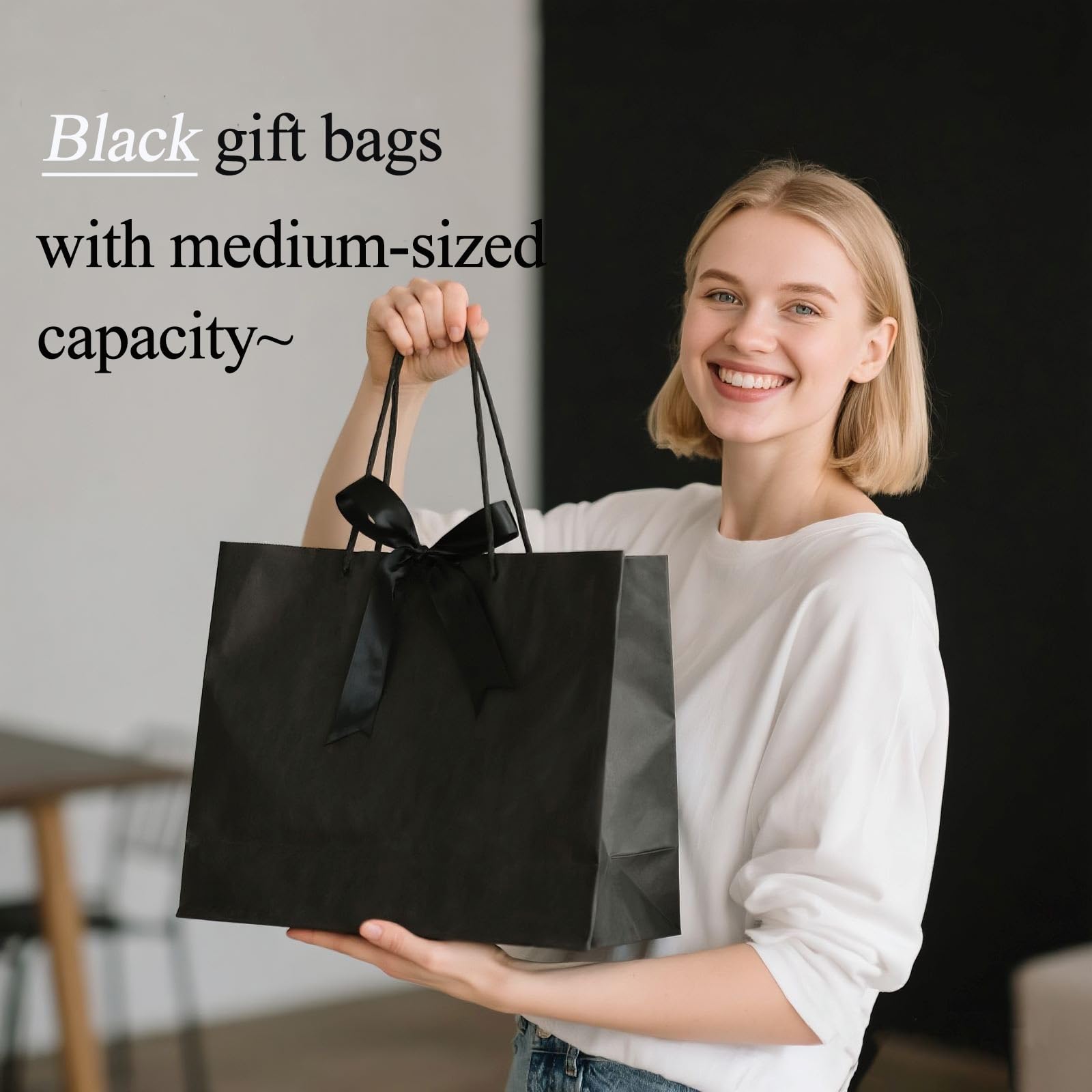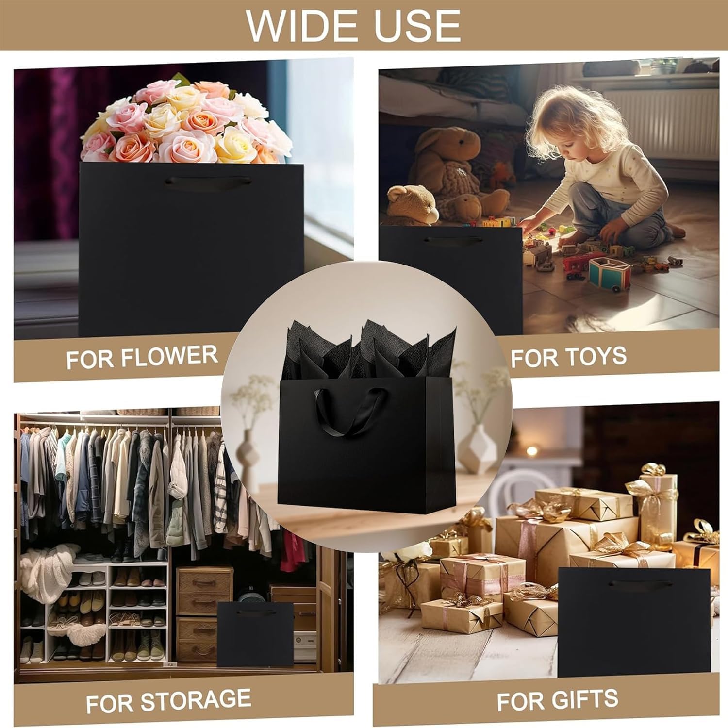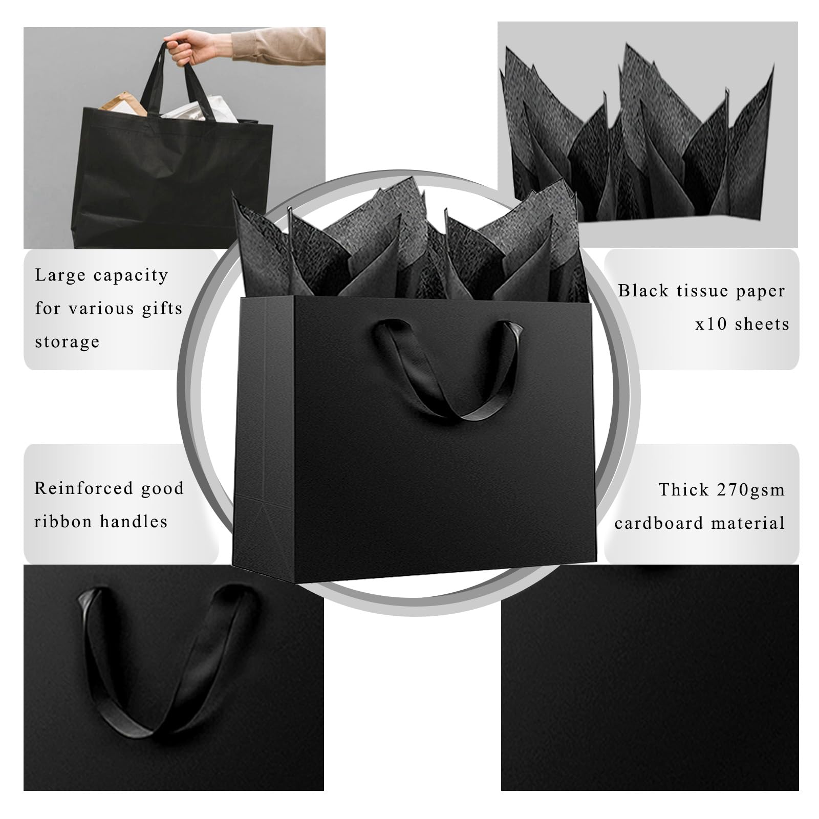 Quality: Made of 280gsm kraft paper, easy to fold and use, our black paper bags can well pack various presents. Its cardboard bottom also help your bags stand well!