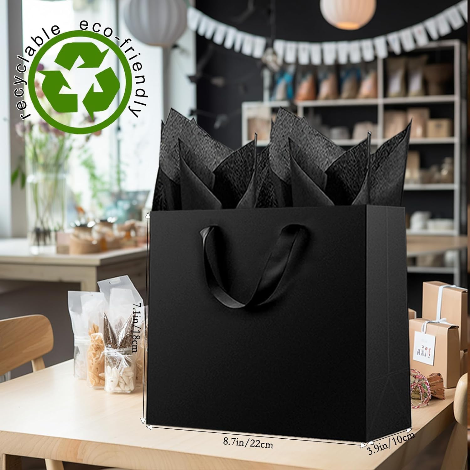 Measurement: Small size for you. The 6-pack set includes 6 pieces of 8.7x3.9x7.1in/22x10x18cm gift bags, and 10 sheets of black tissue paper.