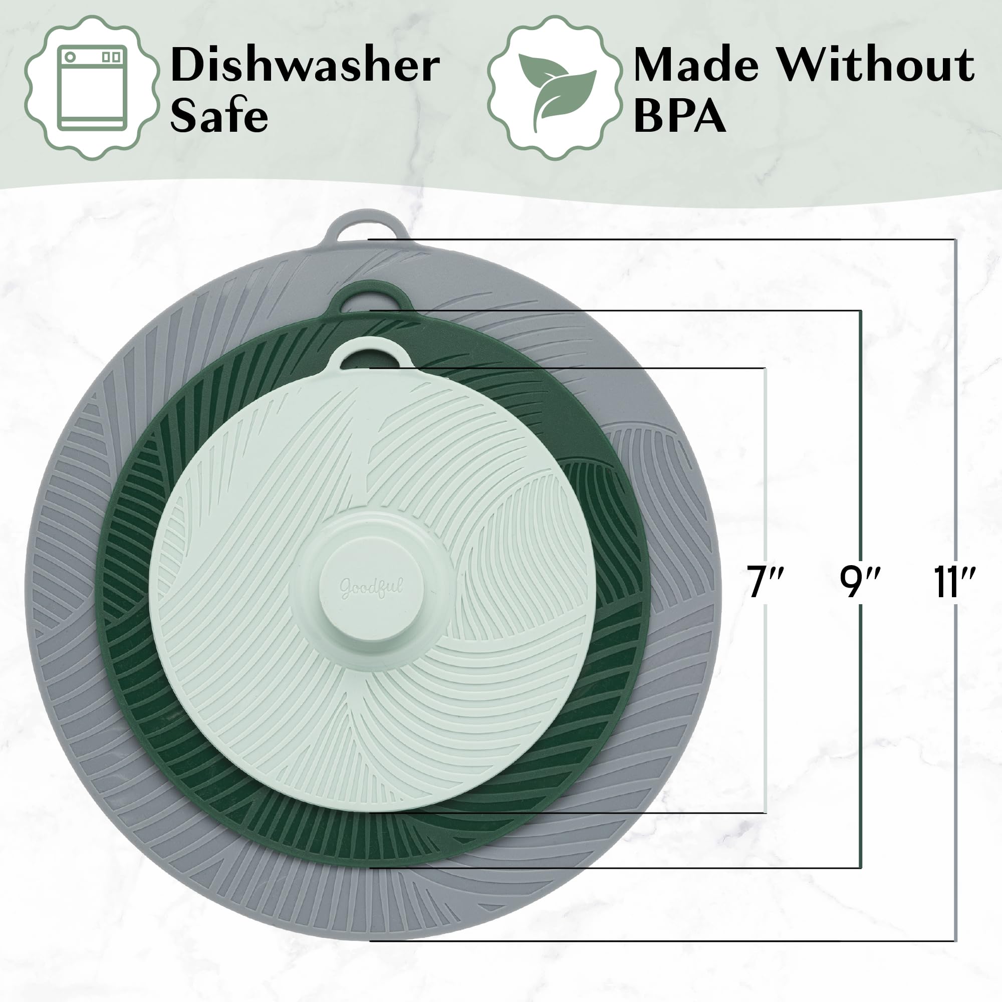 SET INCLUDES: 7" diameter silicone universal lid, 9" diameter silicone universal lid and 11" diameter silicone universal lid.