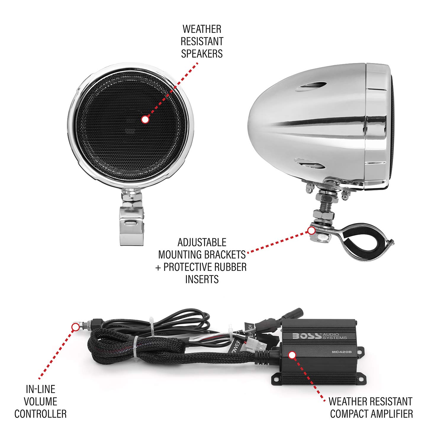 BOSS Audio Systems MC420B 3 Inch Motorcycle Speakers and Amplifier Audio Sound System – Class D Compact Amplifier, Weatherproof, Volume Control, ATV UTV Compatible, For Stereo, Tweeters