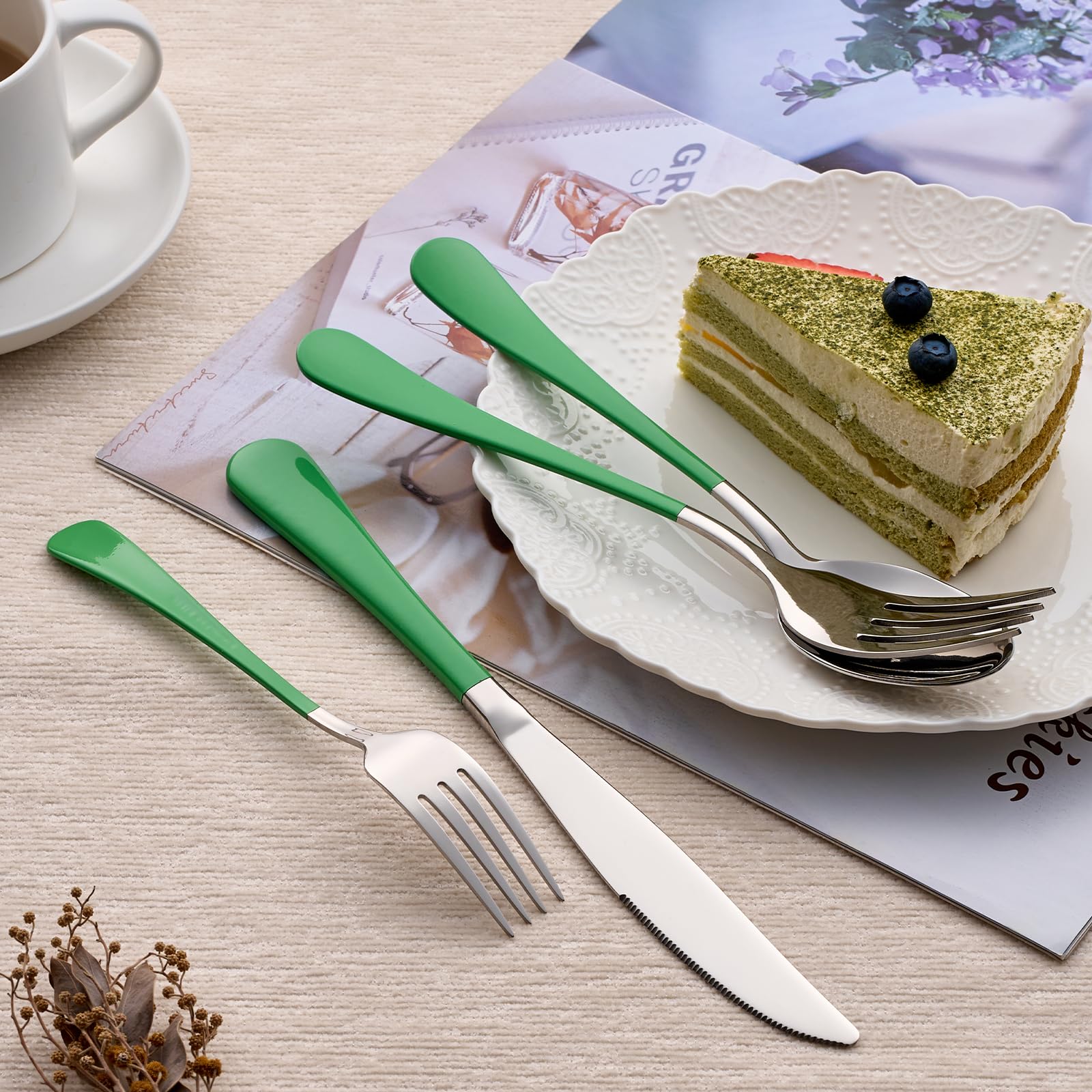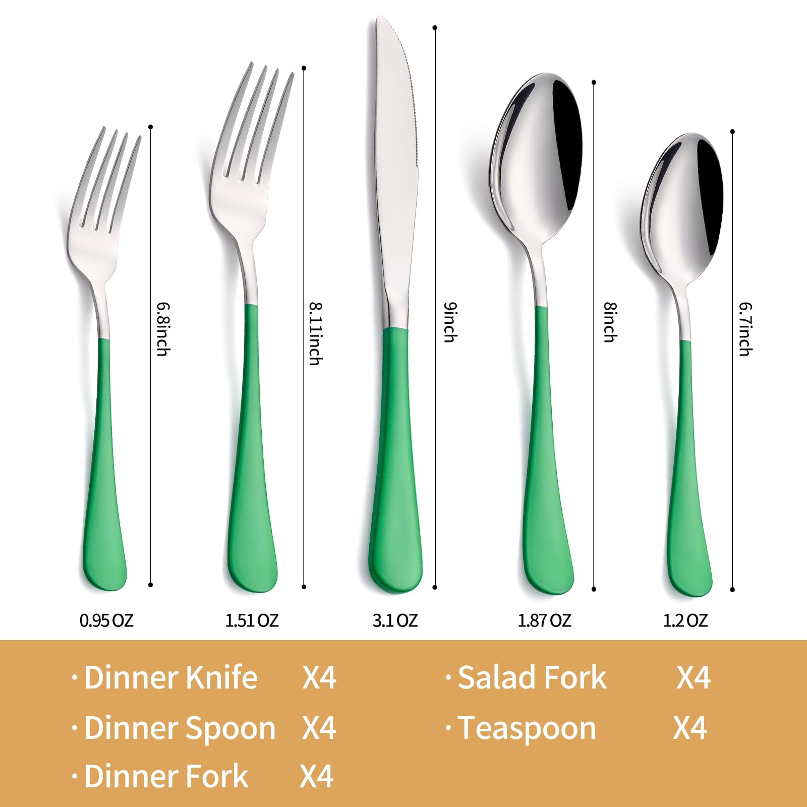 【COMPLETE SET】: Contains include 4 Dinner Knives, 4 Dinner Forks, 4 Dinner Spoons, 4 Salad / Dessert Forks, 4 Teaspoons - all you need to set a beautiful table for meals.