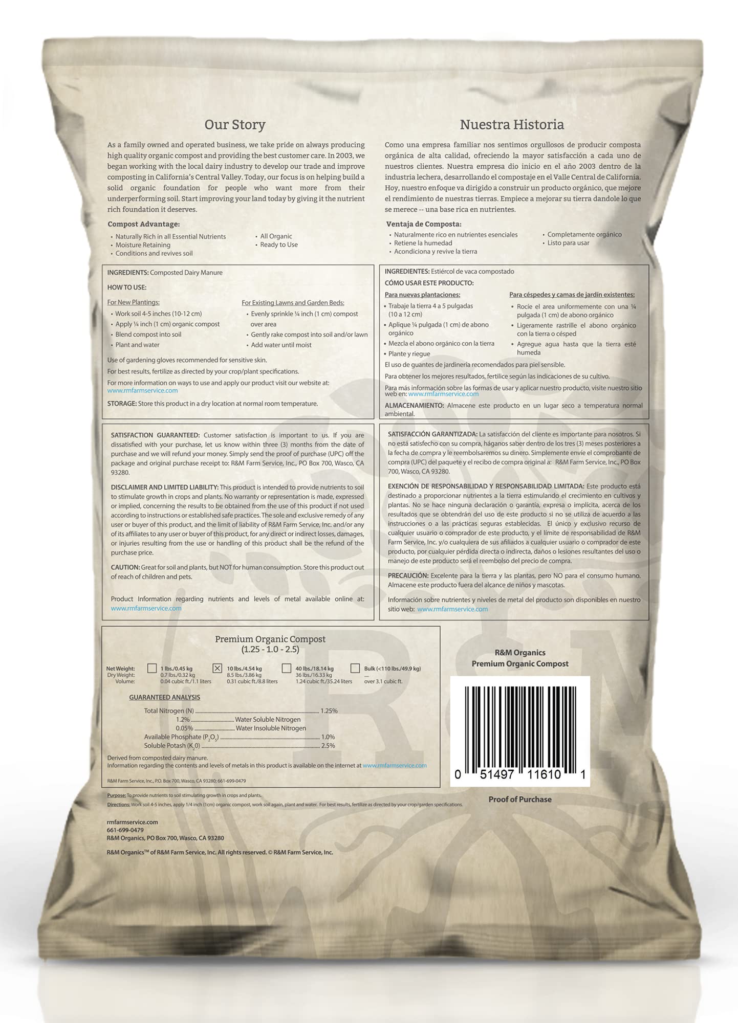If you have ever wondered why your vegetables, fruit trees, shade trees, flowers, lawns, or anything between are taking so long to reach their potential it could be from a lack of nutrients. R&M premium organic compost will help take your next project to a new level one green thumb at a time. Enjoy the use of adding our nutrient-rich compost to your indoor and outdoor projects. Don’t worry about any manure smells when you use it indoors, Due to the complete composting process the end result has a fine earthy, and soil scent that not even your pets will detect. The organic compost also does a great job of retaining moisture for the project at hand which can help lead to less frequent watering, saving you time and money. Our 10lb bag covers roughly 15 sq. ft. and can be reapplied after each harvest, whatever you don’t use just roll up and store somewhere shaded and it will be ready for the next project. A quarter inch and it’s a cinch. If you have existing gardens, trees, flowers, etc. you only need to apply roughly a quarter inch across the roots of the plant or until you cover up the existing soil then you simply add water. If you are repotting or starting a new project you can add slightly more and mix in with the soil, then plant and water. We recommend a 5:1 ratio. 5 parts of the soil of your choice and 1 part of our compost. Reapply after every harvest or every quarter for the best results.