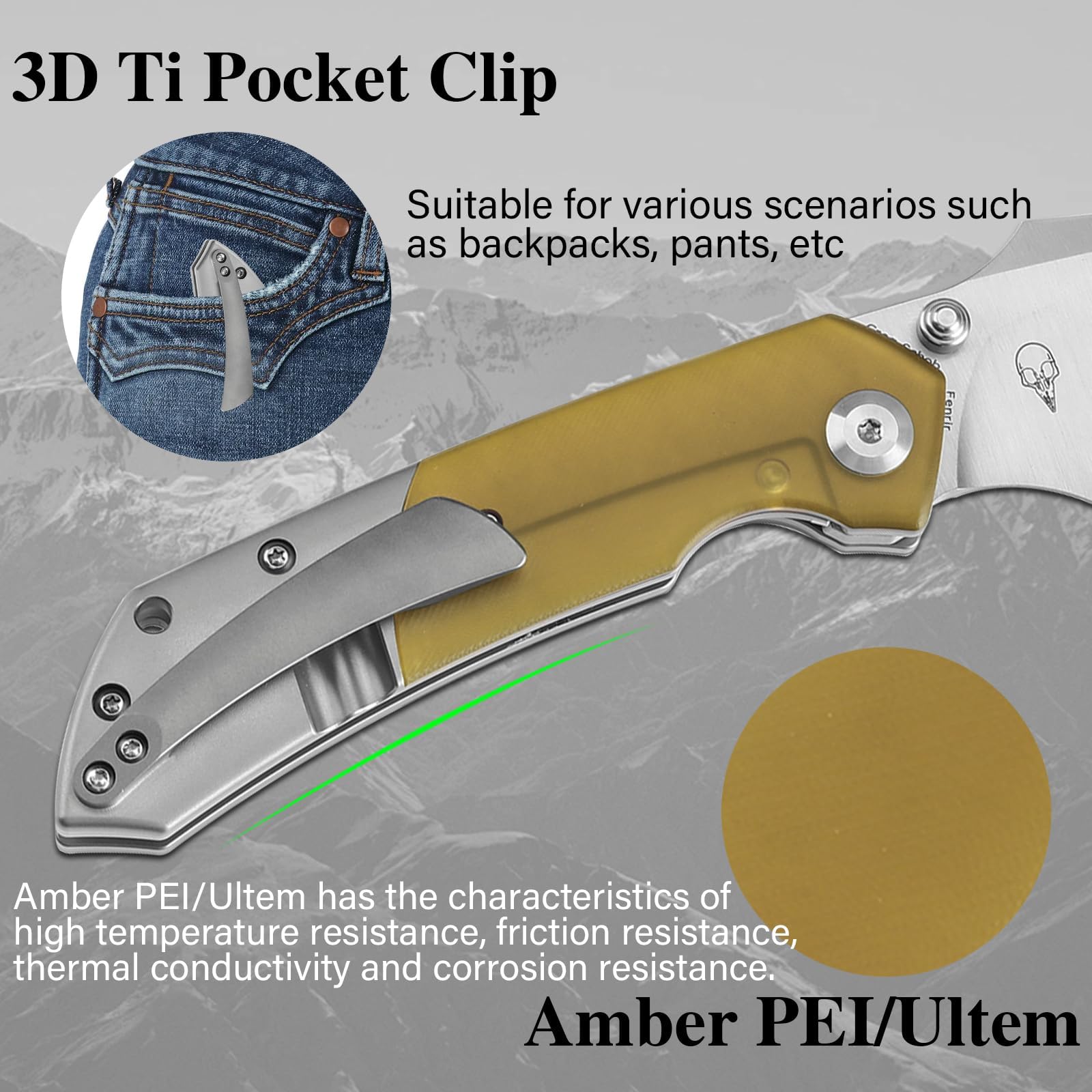 Ergonomic Handle Grip: Multitool pocket knife with Plain Titanium + Amber PEI/Ultem handle is chamfered for secure and comfortable grip