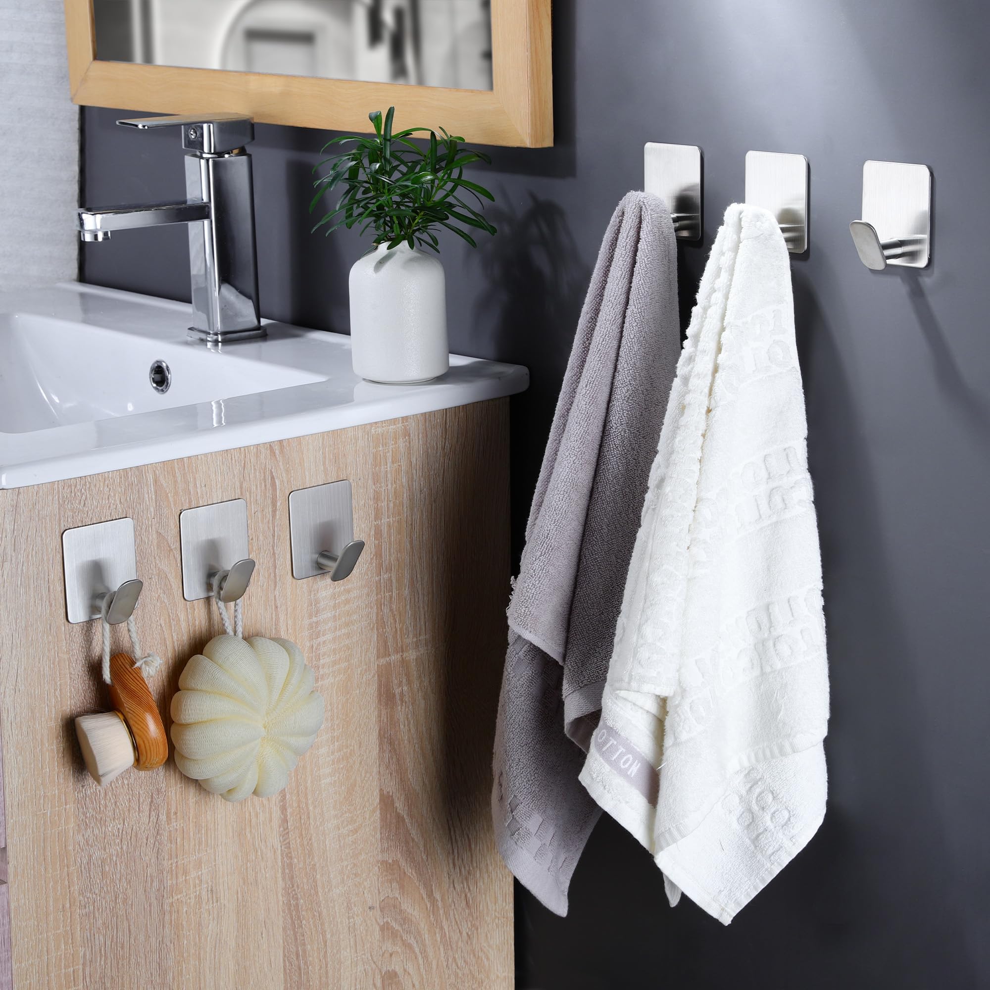 DELITON Sticky Hooks for Hanging Adhesive, Silver Wall Hooks for Bathroom Kitchen Office Stainless Steel Heavy Duty No Damage, Brushed Nickel, 6 Pack