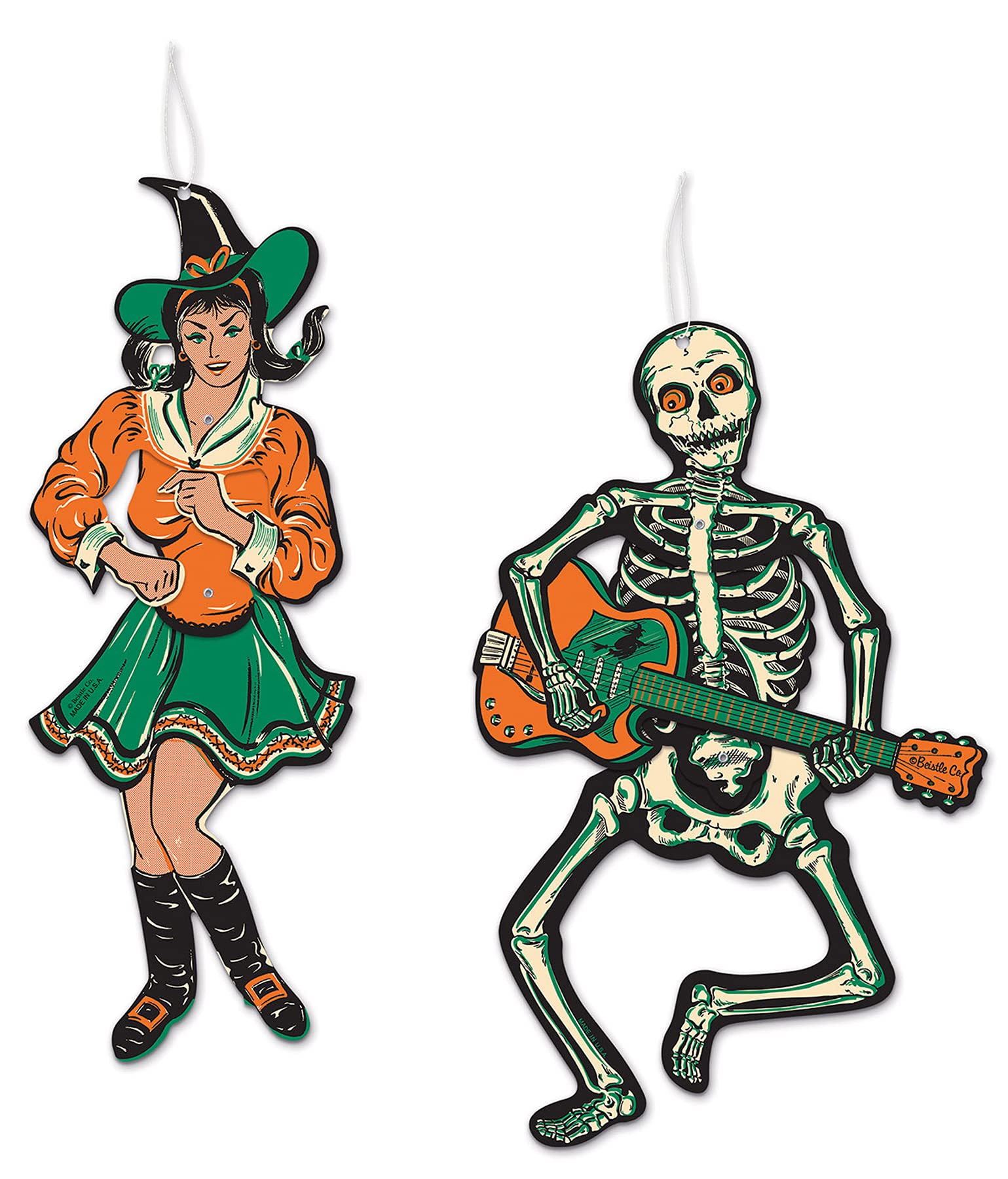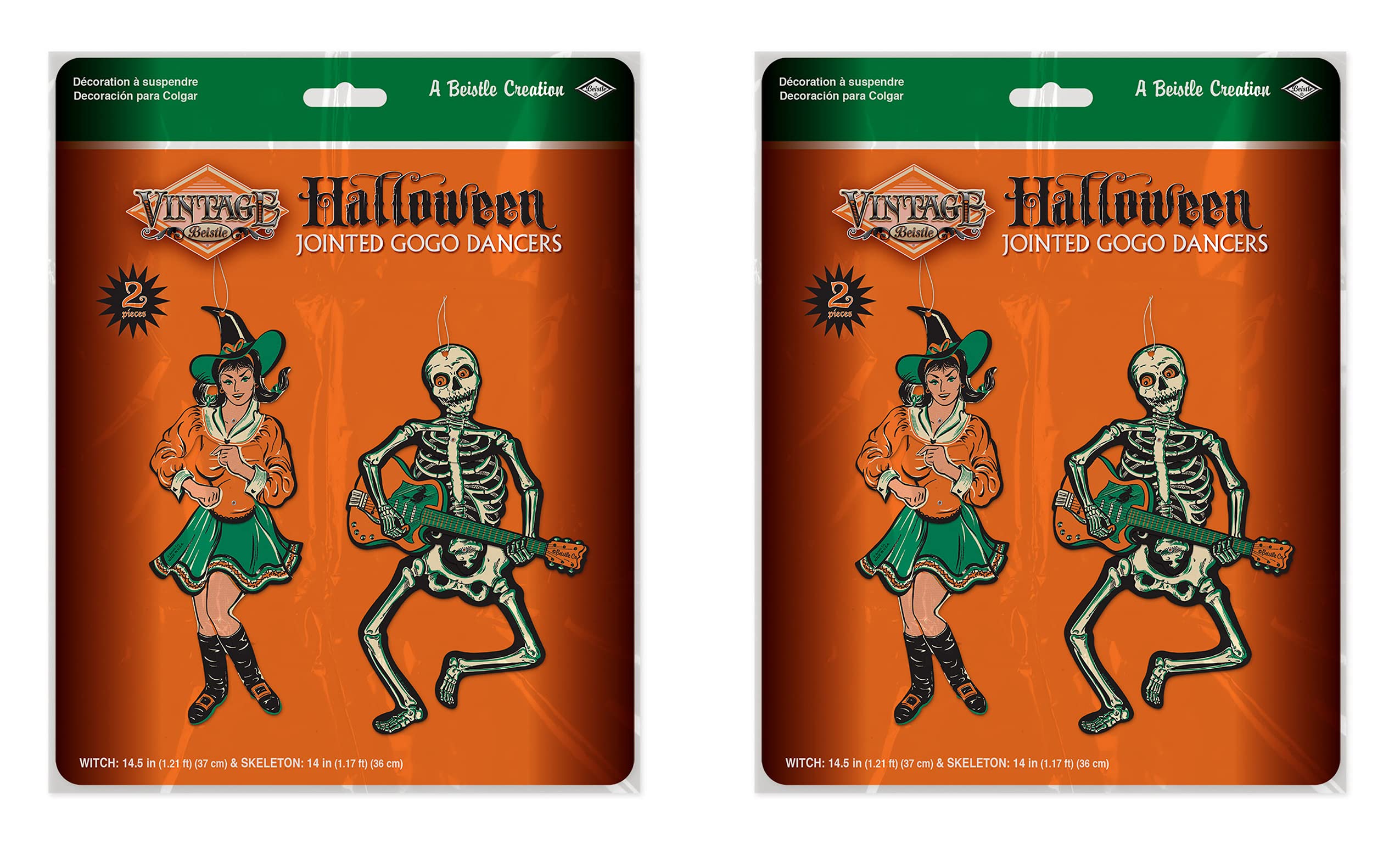 If you are decorating with the vintage style look for Halloween This year, make sure to get these four jointed gogo Dancer decorations. Two Skeletons measuring 14 inches tall and two witches measuring 14. 5 inches tall are included. They are printed on 1 side of durable cardstock paper and have loops at the top for hanging. These vintage Halloween decorations are a hit and they are a must have for Halloween party decor.