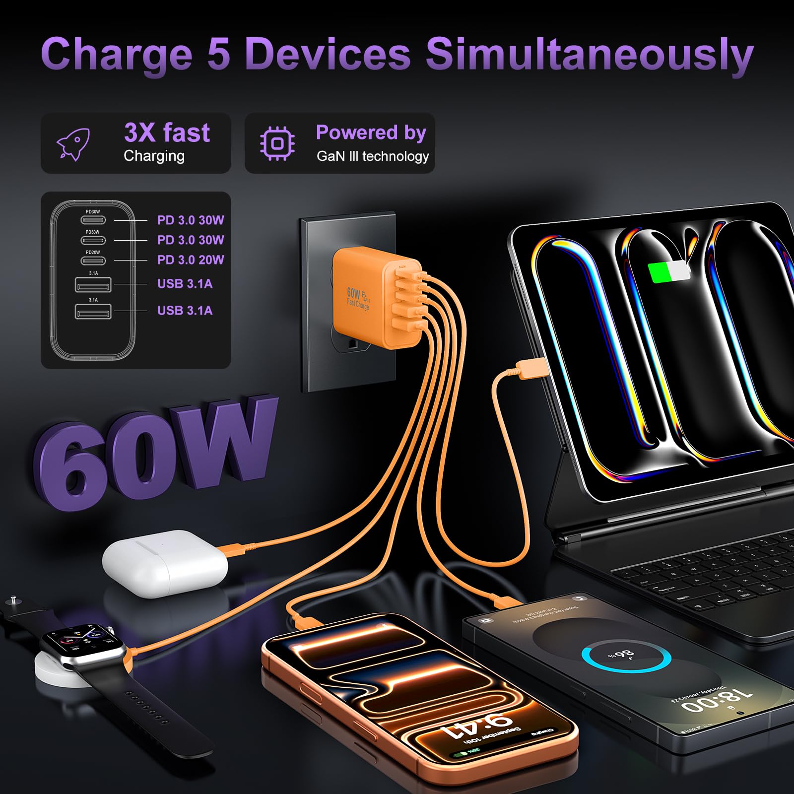 Compact and Portable Phone Charger Brick: Designed with the pocket-friendly compact body and 5-port charging cube, the USB C box is integrated to charge multiple devices at home, office and travel. Small size saves you space and fits perfectly into pockets, handbags, travel cases. Packaged with dual 60W 5-port usb c wall chargers (cable not included). If you have any problems with the c type charger block, please contact us