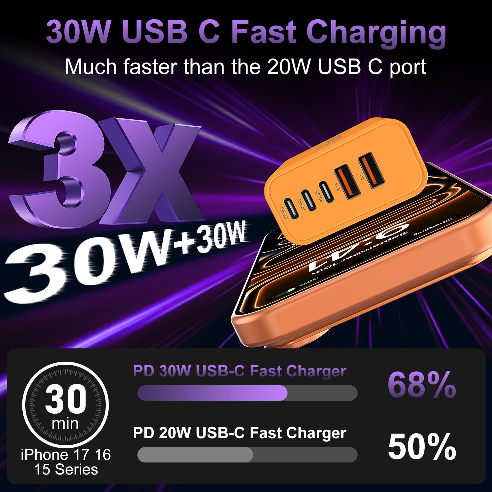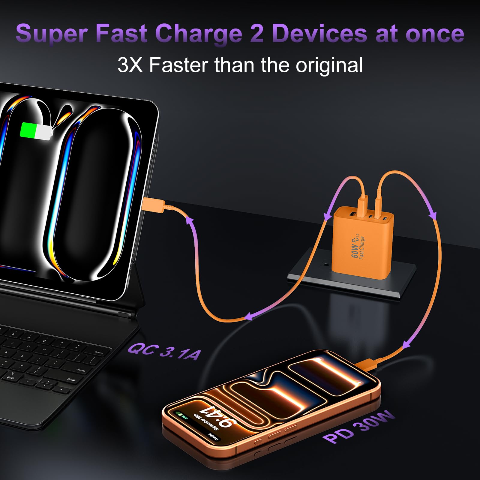 2-Pack 60W USB C Charger Fast Charging Blocks: Auorld 60W USB C Fast Charging Blocks support the Power Delivery and Quick Charge 3.0 fast charging functions with a total power of up to 60W. The USB-A port offers an output power of 3.1 A/5 V, while each USB-C port provides Max 30W output power, charge your Phone 16 15 Pro Max up to 65% in just 30mins, 10% faster than the original 20W USB C charger