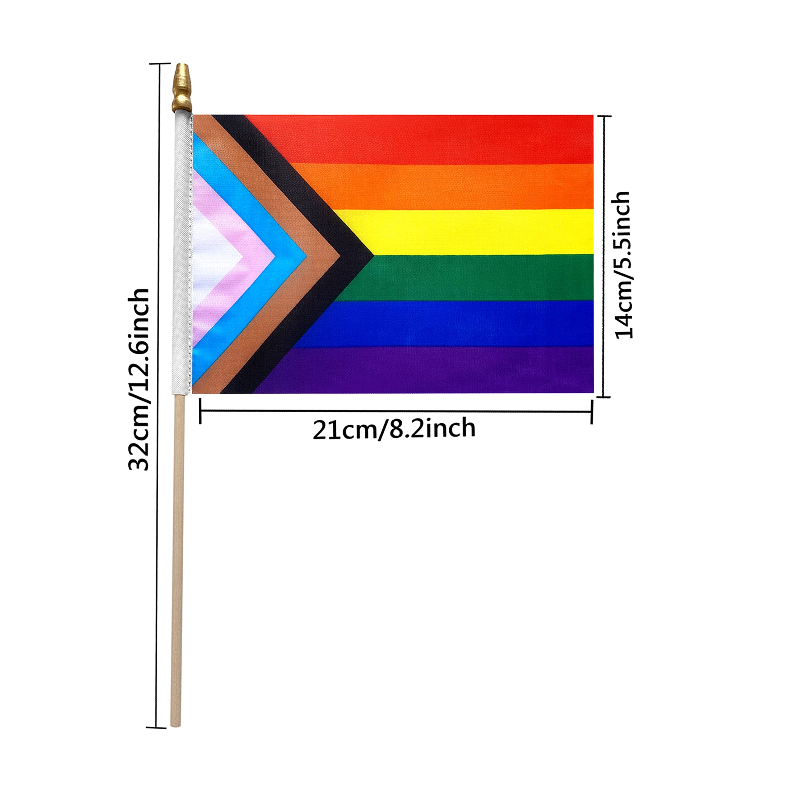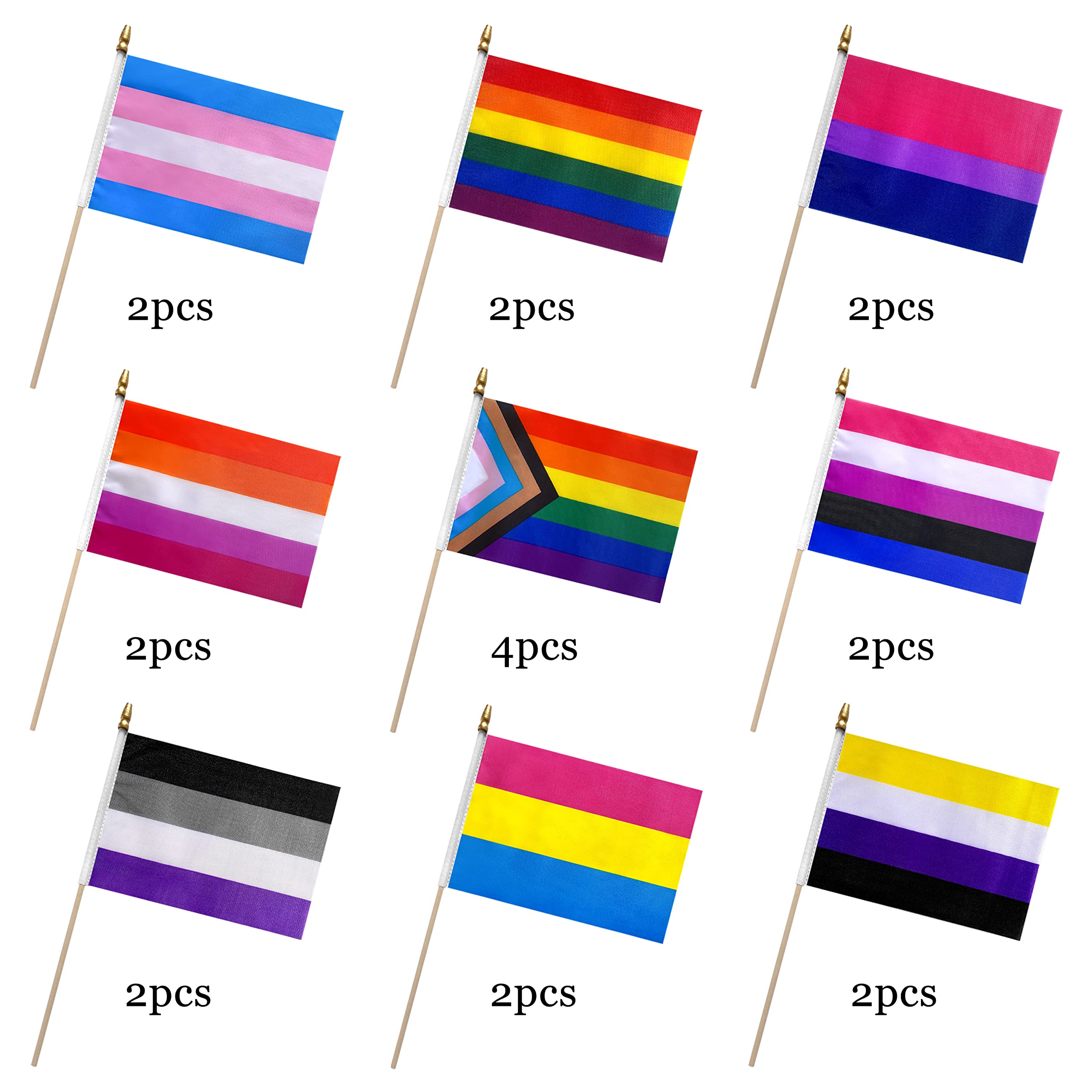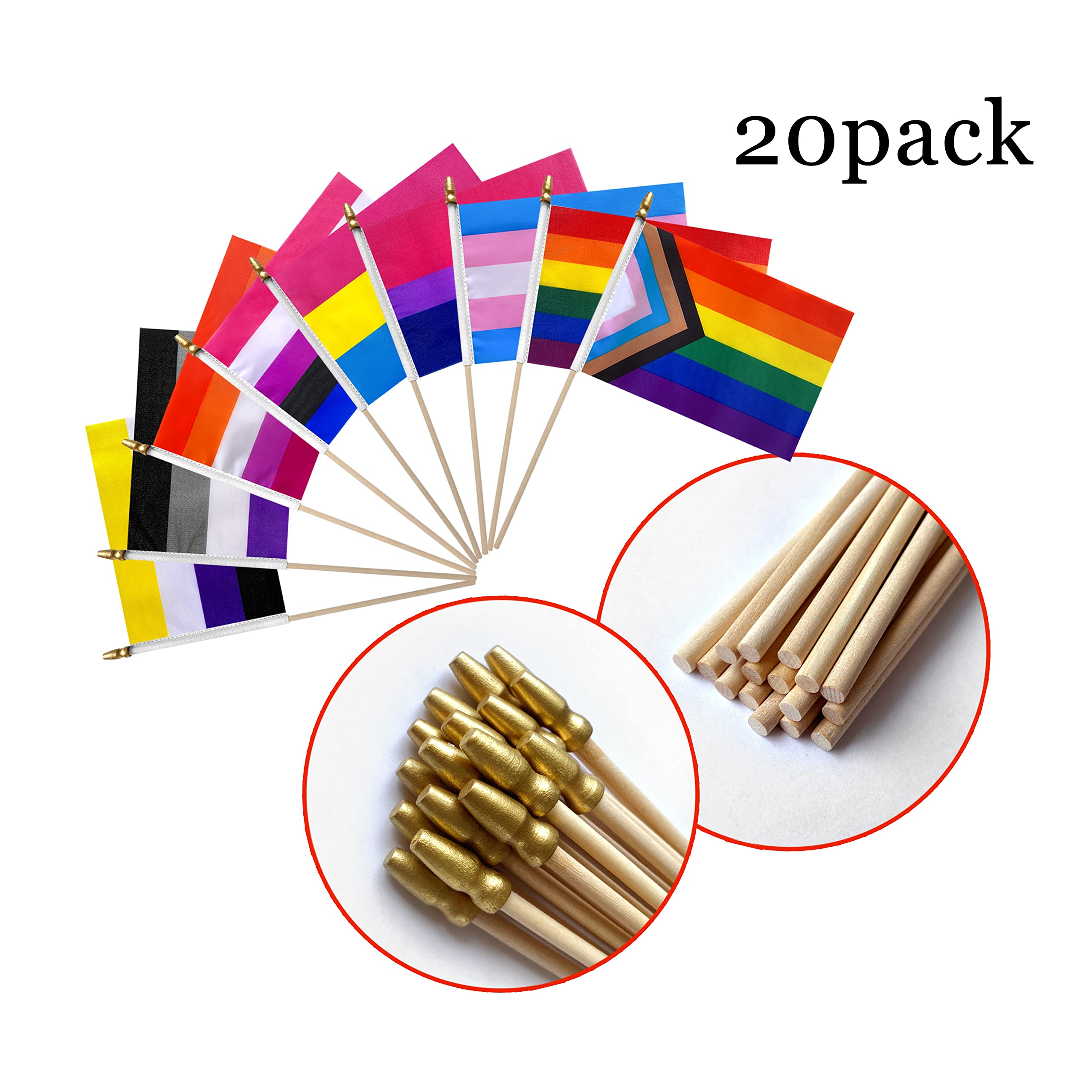LyButty Progress Rainbow Gay Pride Flags Set on Wood Stick Small Mini Hand Held LGBTQ Inlcusive Flags,5x8 Inch,20 Pack Package includes: 4 x Progress rainbow flags 2 x Rainbow flags 2 x Transgender flags 2 x Bisexual flags 2 x Pansexual flags 2 x Sunset Lesbian flags 2 x Asexual flags 2 x Non-Binary flags 2 x Genderfluid flags Commitment: If you have any problem please contact us, we will deal with it in time and give you a satisfactory answer.