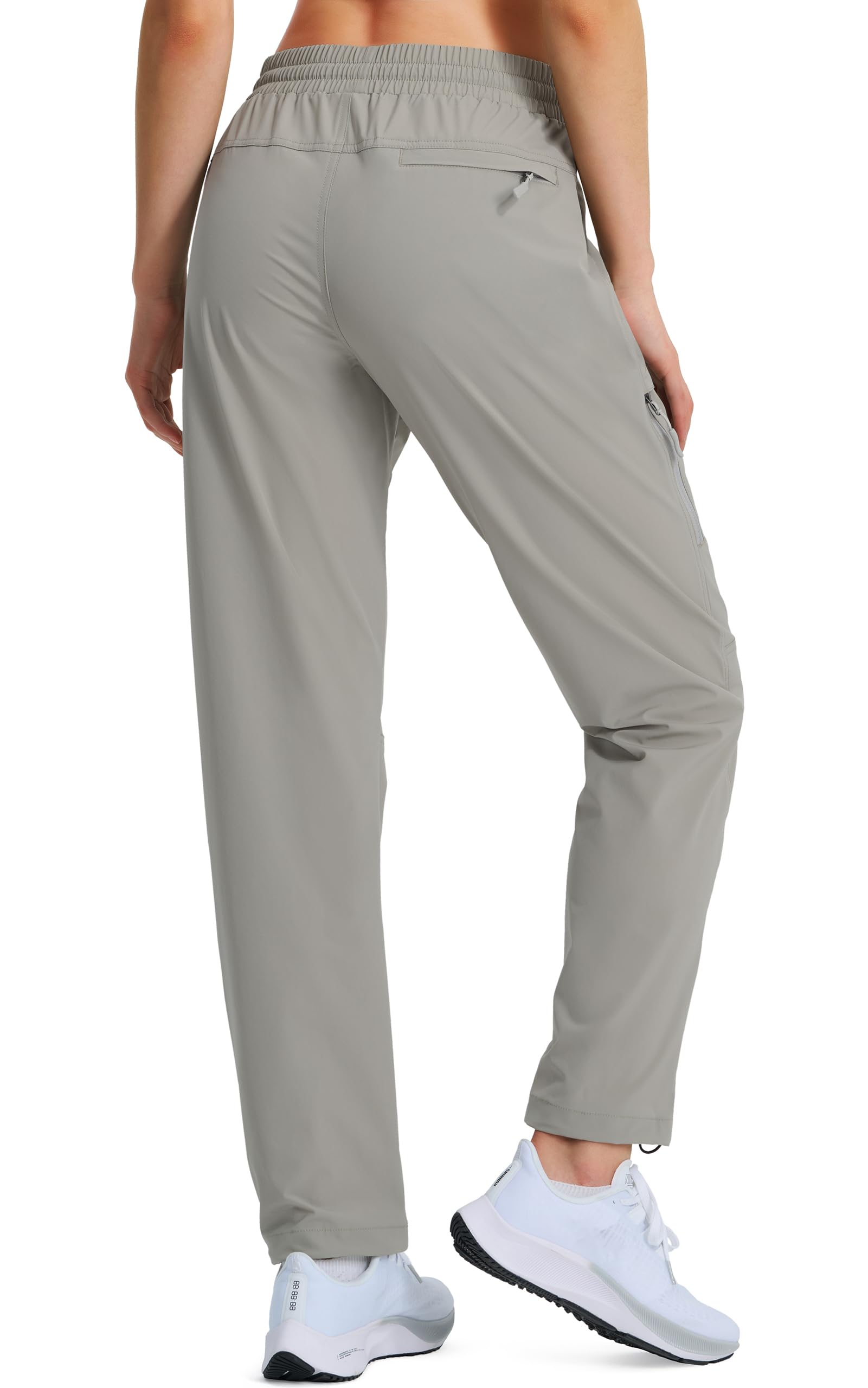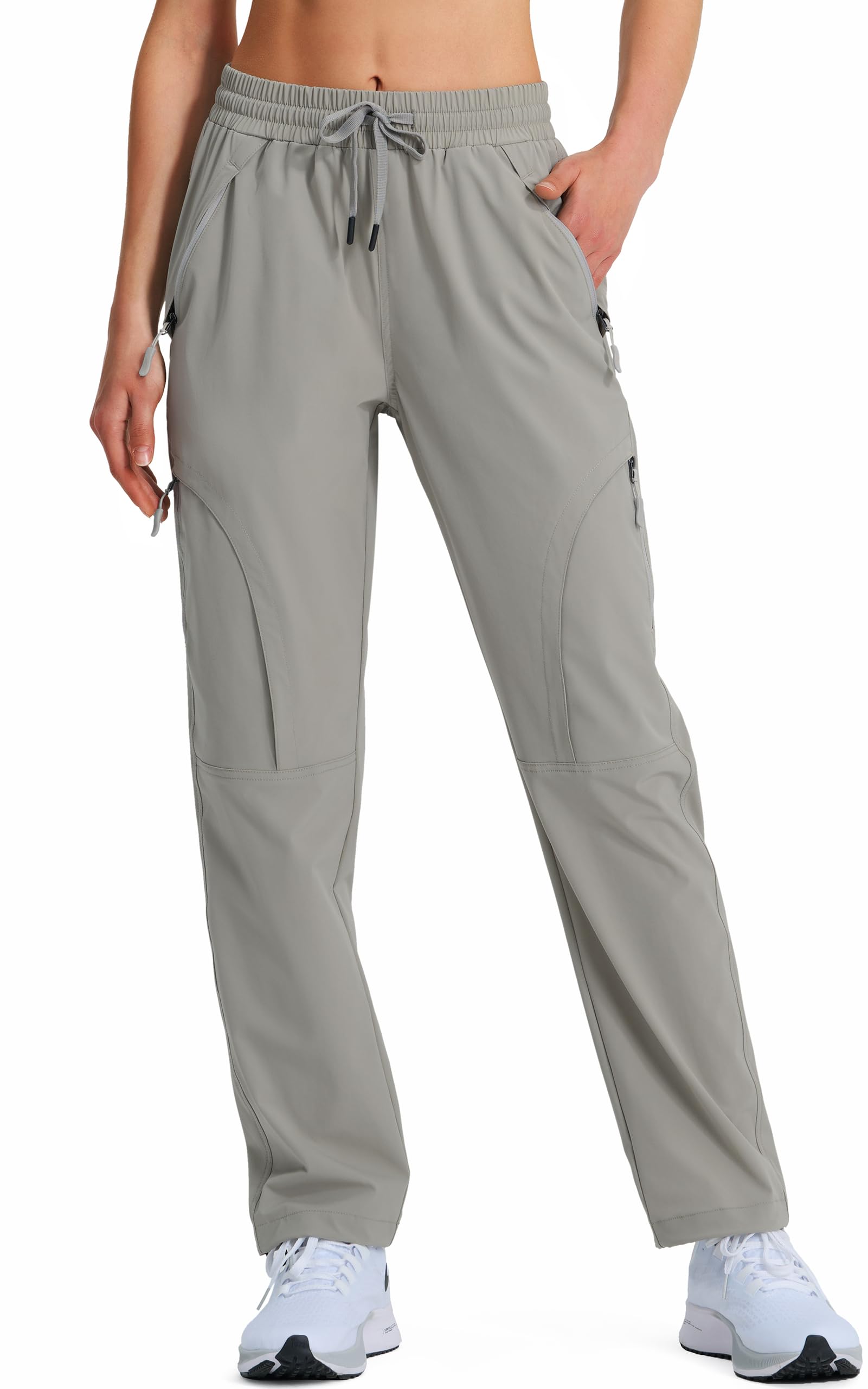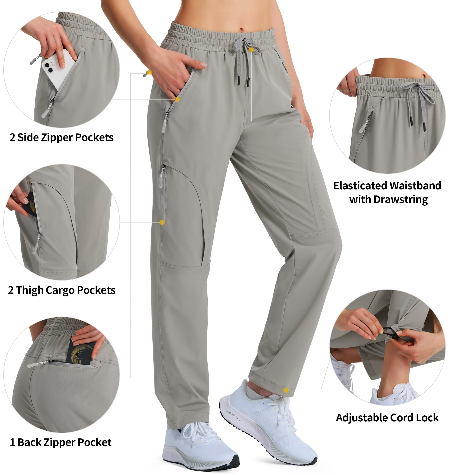 Description Women's Hiking Pants Quick Dry Lightweight Cargo Pants UPF 50 Water Resistant Zipper Pockets for Golf Travel Work Camping Designed for ultimate comfort and functionality, these women's hiking pants feature 5 zippered pockets. Made from lightweight, breathable, quick-drying, water resistant, 4-way stretch nylon fabric with UPF 50+ sun protection. Stay cool and comfortable all day long for freedom of movement. Fabric: Material: 90% nylon, 10% elastane. Lightweight, breathable fabric is designed to keep you comfortable during your adventure, while 4 way stretch fabric of the women's cargo pants provides flexibility and freedom of movement. UPF 50+ protection : UV protection is a priority when exploring the great outdoors, which is why our lightweight cargo pants for women offer UPF 50+ built-in to keep you safe from the sun's harmful rays. 5 Pockets: With 5 zippered pockets, including two side hand pockets, two large-capacity thigh pockets and a back pocket, these women's work pants provide plenty of storage space to keep your belongings safe and easily accessible while on the move. Water Resistant & Quick Drying: The quick dry hiking pants for women are treated with Durable Water Repellent (DWR) that dries quickly and repels water, helping you stay dry and comfortable. Adjustable Cord Locks around Cuffs: Adjustable drawcords around the cuffs allow for easy leg opening adjustment to keep bugs out and ensure the waterproof hiking pants for women fit perfectly, no matter what adventure you take them on. Elastic Waistband with Drawstring: Ensures a secure and personalized fit, adapting to different body shapes and providing maximum comfort and support. Various Occasions: These women’s quick dry cargo pants ae perfect for hiking, camping, travelling, athletic, fishing, climbing, golf, walking, running, jogging, outdoors or daily casual work wear.