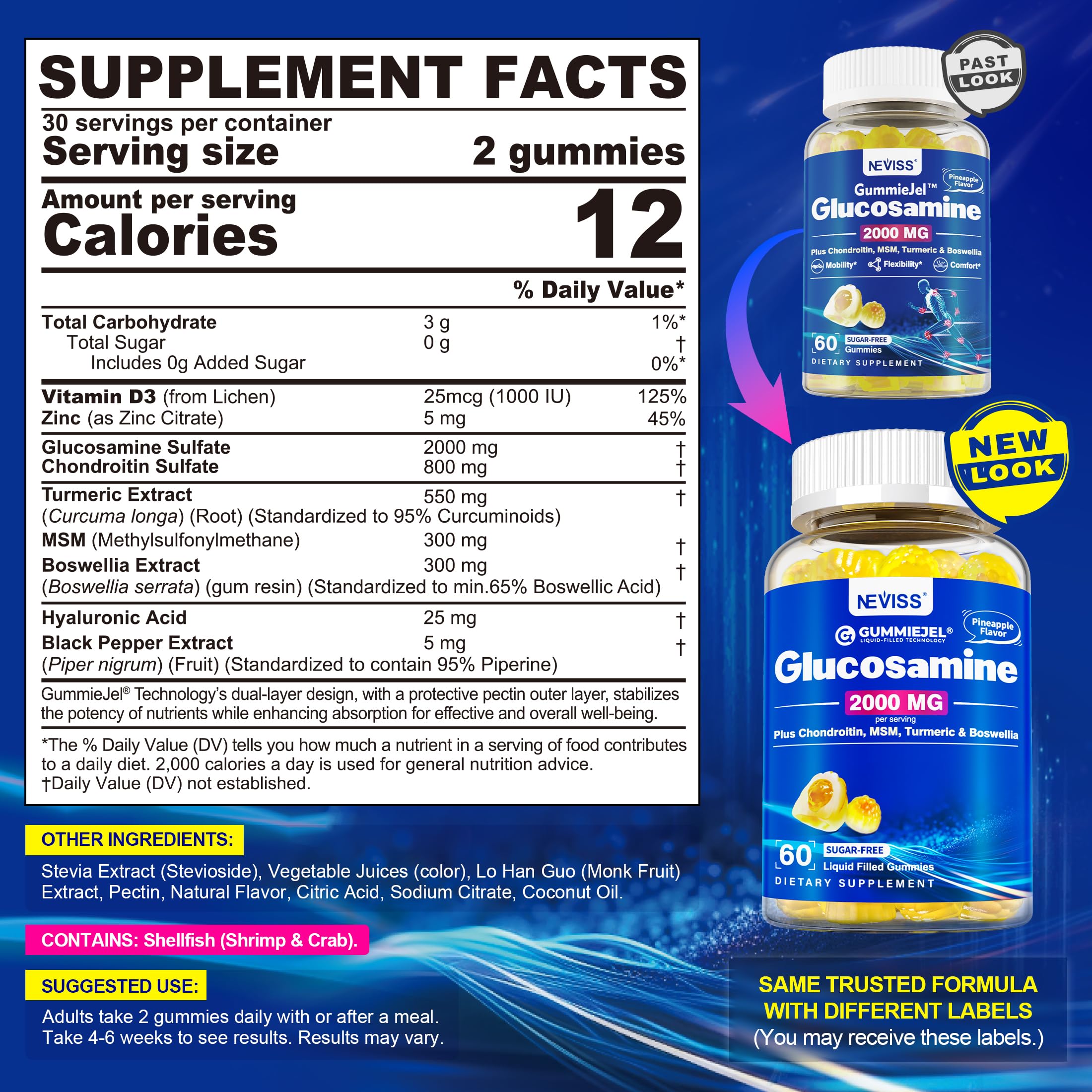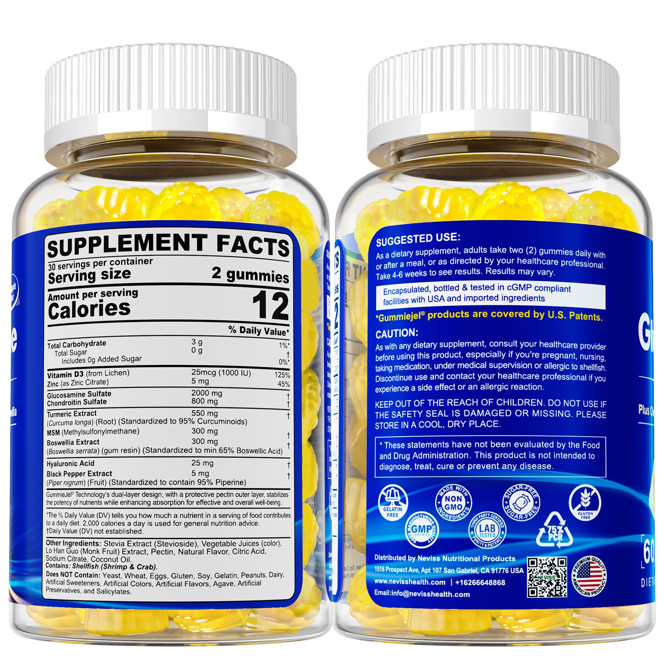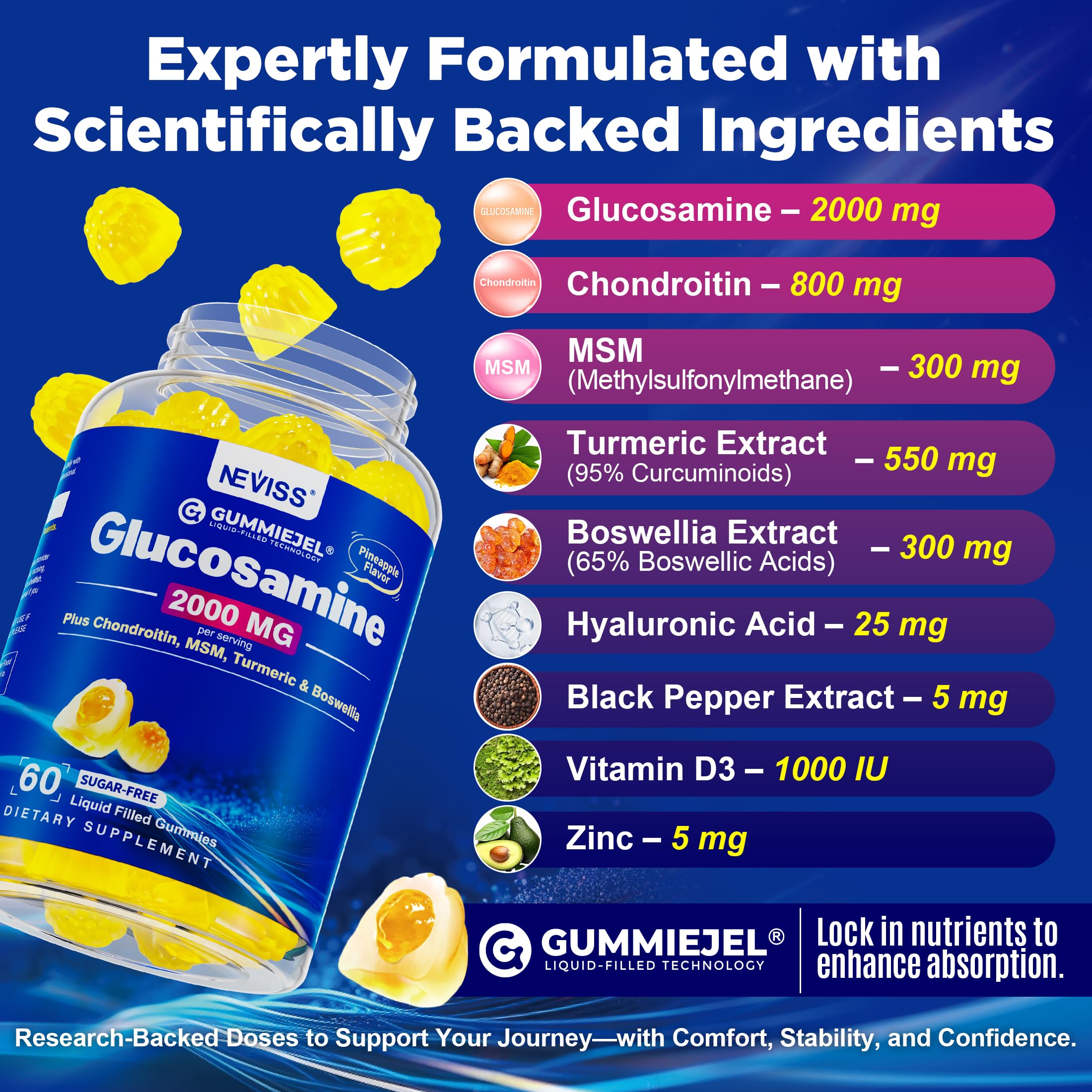 NEVISS Sugar Free Glucosamine Filled Gummies - Glucosamine Supplement Plus Chondroitin, MSM, Turmeric, Boswellia, Hyaluronic Acid, Vitamin D3 & Zinc, 120 Gummies, 60 Servings