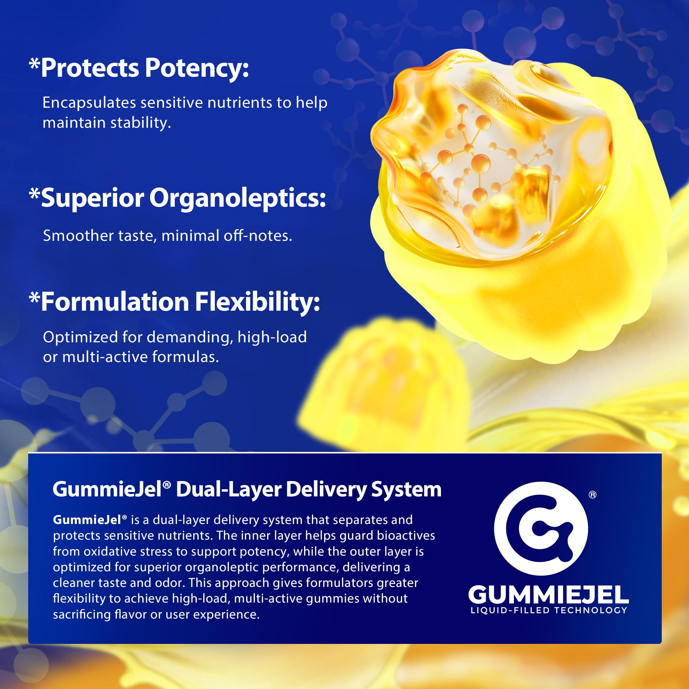 【THE FIRST GLUCOSAMINE LIQUID-FILLED GUMMIES】Our glucosamine liquid-filled gummies are adopted with advanced GummieJel gummy-filled Technology that locks active ingredients in the center, to ensure stability, absorption, and bioavailability.
