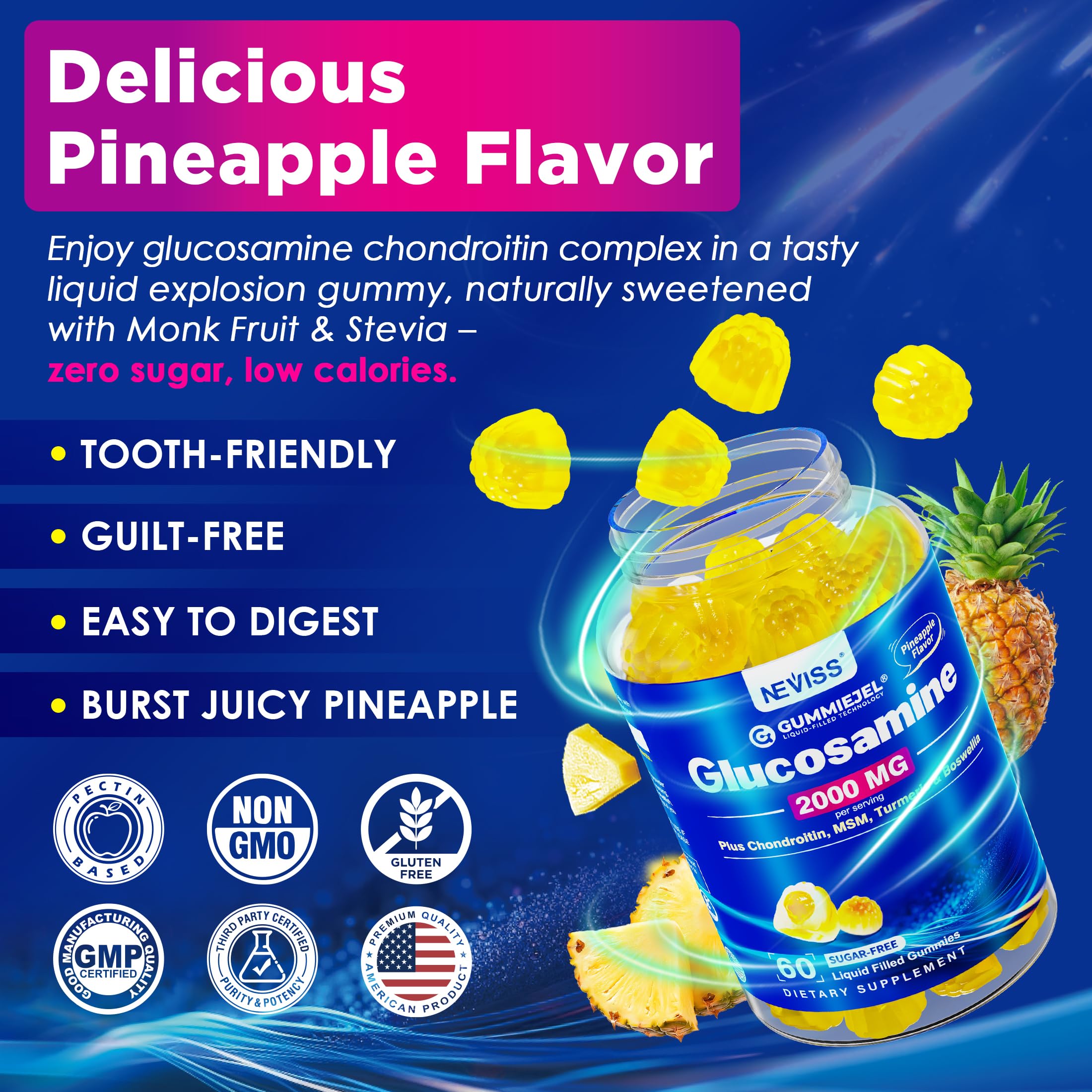 【DELICIOUS GLUCOSAMINE GUMMIES】Our pectin-based chewy gummies embrace a liquid-filled center that bursts with a delightful pineapple flavor, suitable for men and women.