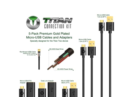 Titan Connection Kit for the Titan Two device, by ConsoleTuner 5-Pack Premium Gold Plated Micro-USB Cables and Adapters. Micro-USB Cable 1.8m (5.9 FT) Primarily to connect gaming controllers to the Titan Two device, can also be used to connect the programming port to PC or Mac for device configuration and GPC script development. Micro-USB Cable 1.0m (3.3 FT) Most users will find this the ideal length to connect the Titan Two to PC or Mac for device configuration and GPC script development. Micro-USB Cable 30cm (1 FT) The perfect length to connect the authentication controller or XIM4 to the Titan Two device. Micro-USB OTG Adapter Convert any of the back Micro-USB ports on the Titan Two device into an extra input port for controllers, keyboards, mice or any other compatible gaming device. Data Link Adapter If not using an external power supply, the Titan Two is powered by one of the back Micro-USB ports. The Data Link Adapter allows to manually select from which port the device should be powered. When the device have connections on both Micro-USB ports, the Data Link Adapter is suggested to be used on the one with the longest cable.