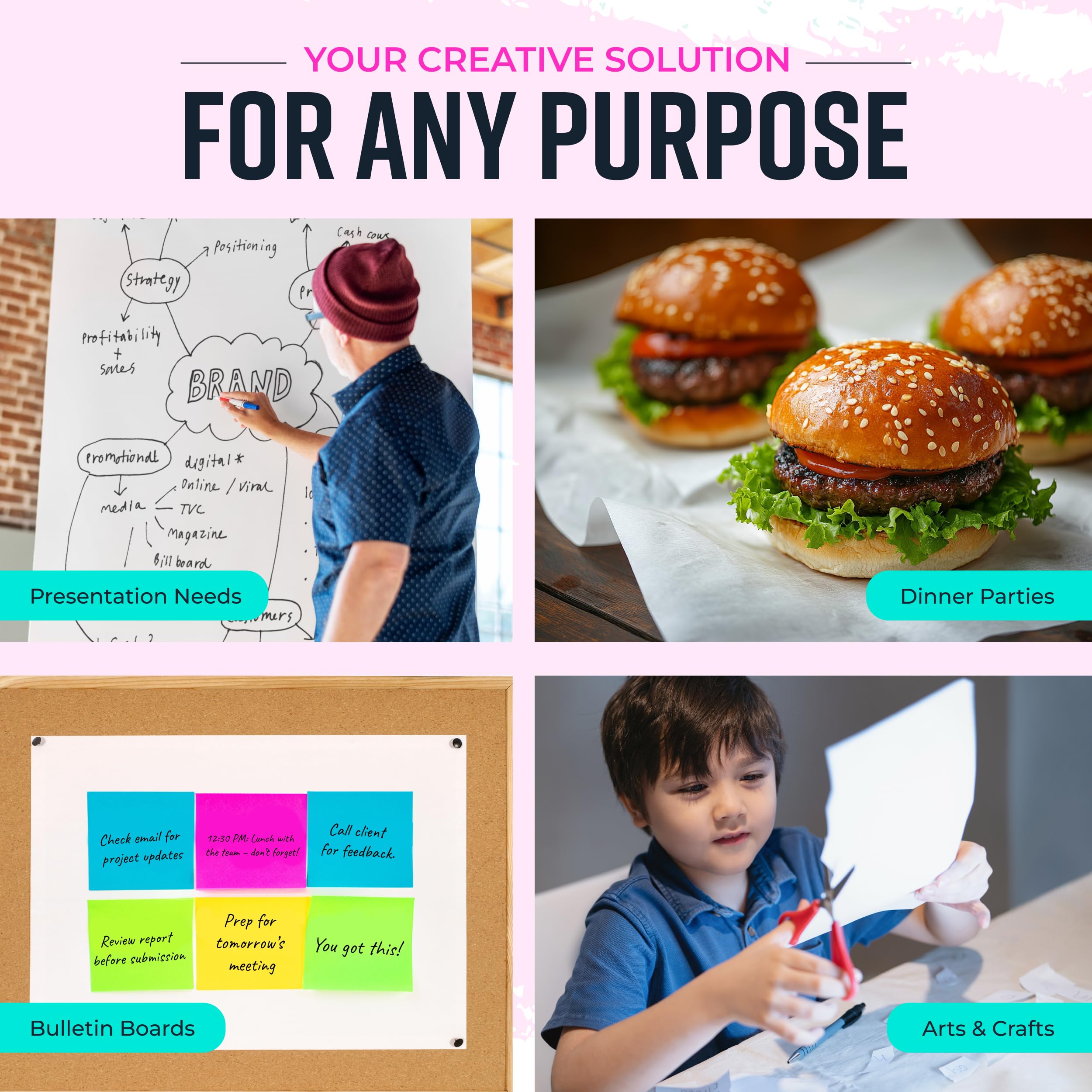 Easily Customizable Size and Shape; This big roll paper, an art easel in its own right, allows you to cut and shape the paper as required, transforming into your own art board or even bulletin board paper roll