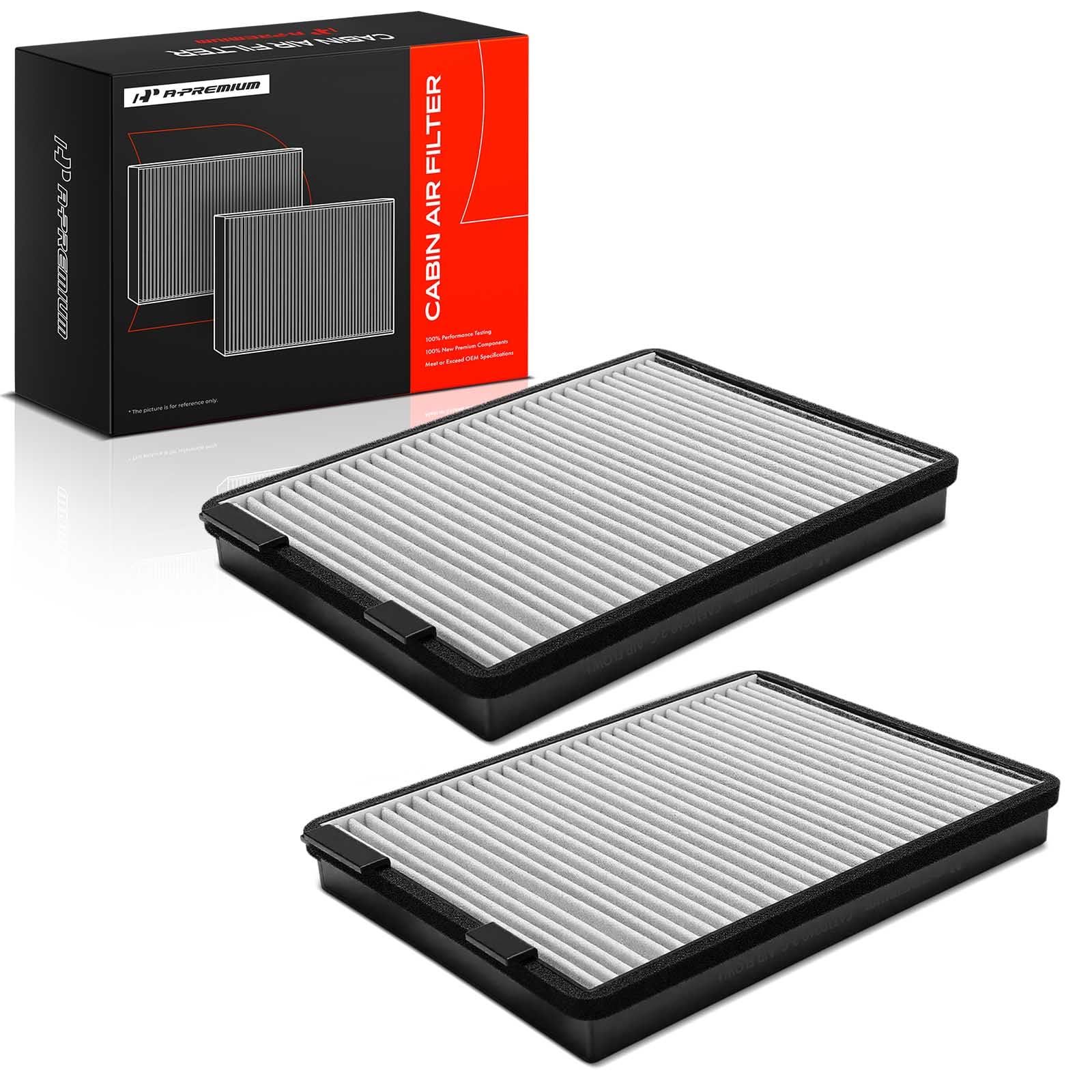 [Specifications]: ① Location: Front; ② Length: 10.83 inch; ③ Width: 8.19 inch; ④ Height: 1.38 inch; ⑤ Activated Carbon Included: Yes; ⑥ Washable: No; ⑦ Reusable: No; ⑧ Package Quantity: 2; ⑨ Packaging Type: Box