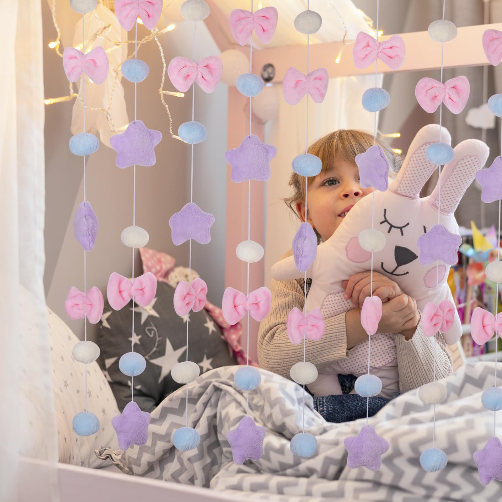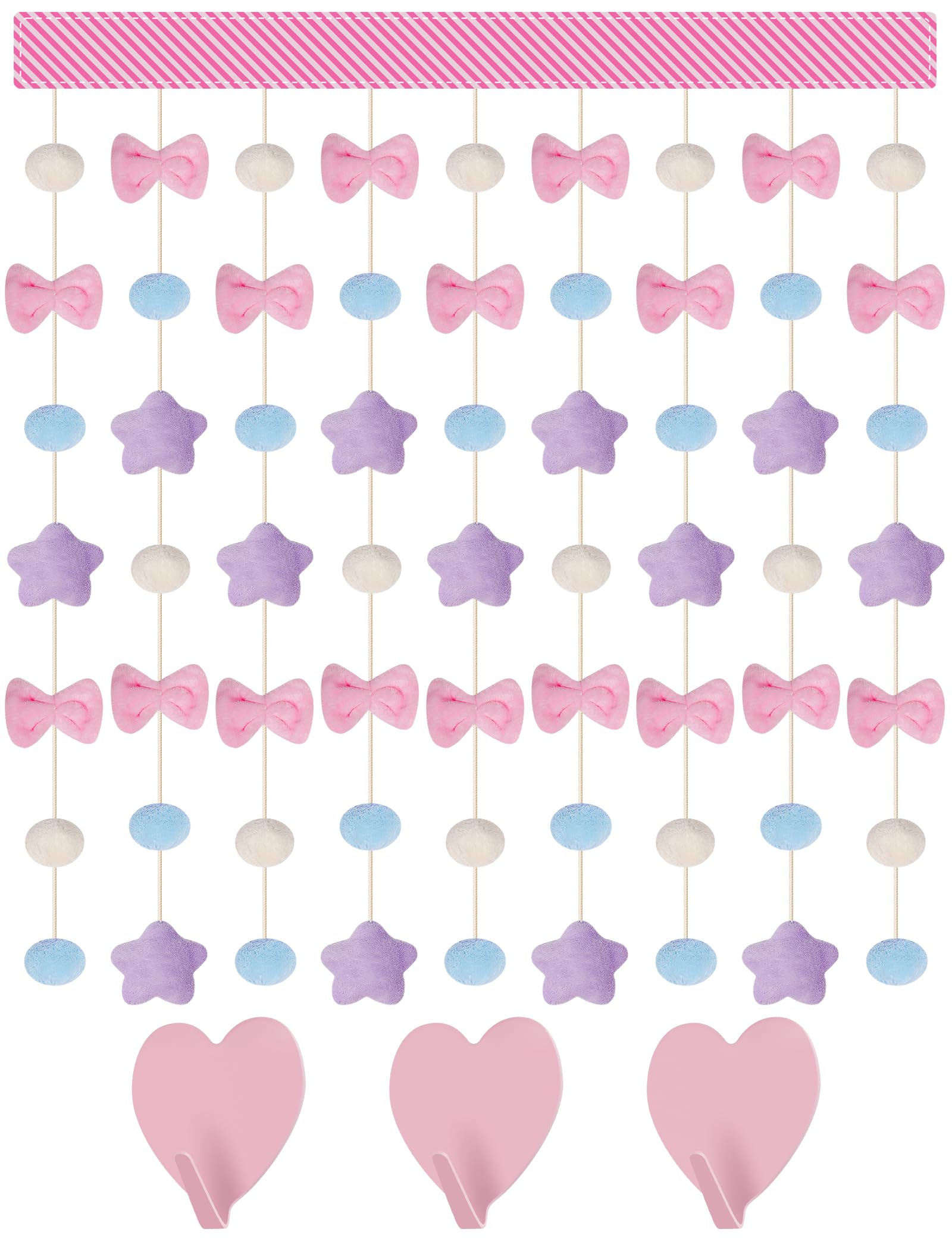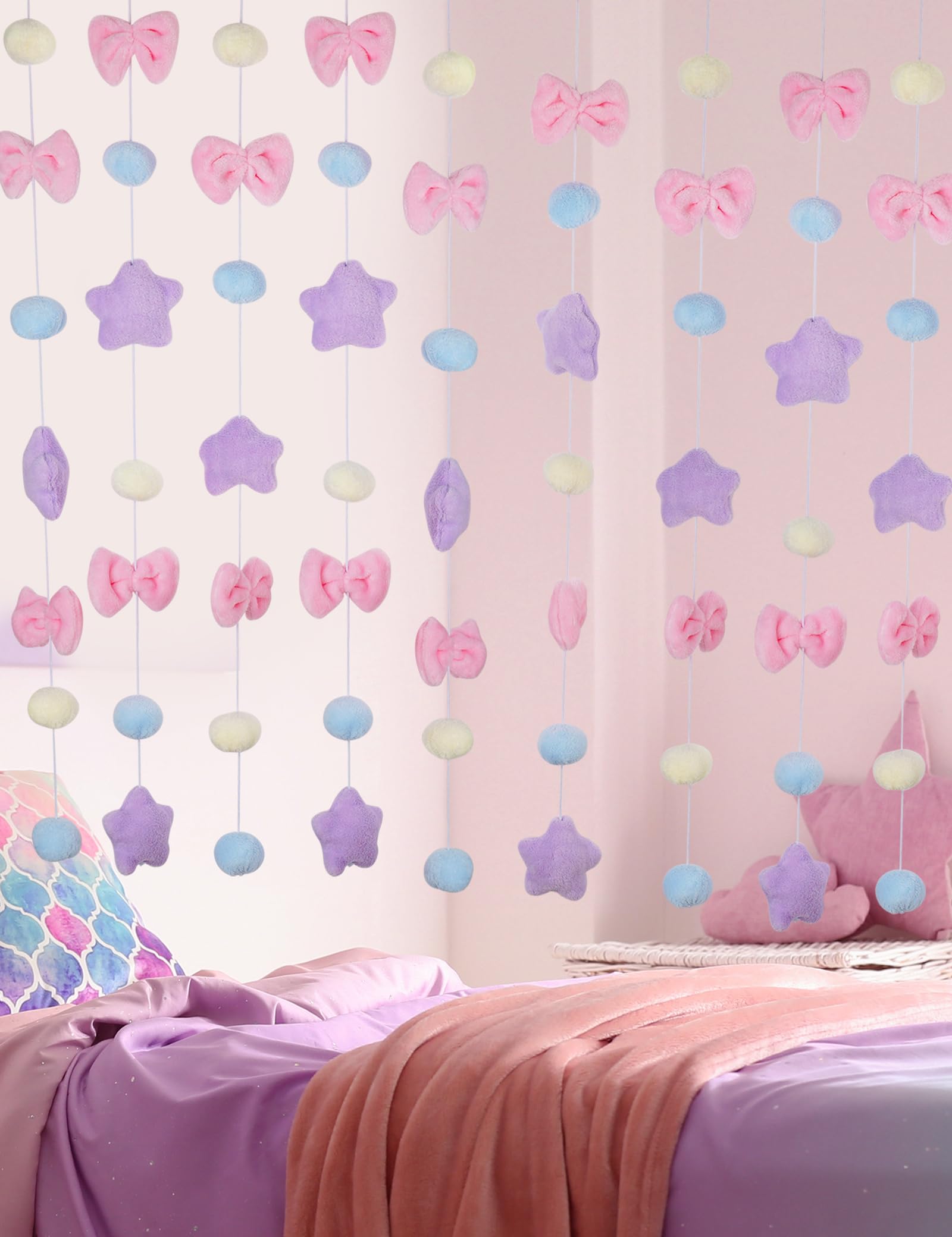 NiHome Fluffy Plush Doorway Curtain, Cute Hanging String Garland Kawaii Wall Hanging Home Decor for Girl Baby Room,Plush Bowknot Pentacle Garland Curtain with Hooks & Adhesive Velcro, 9 Strings