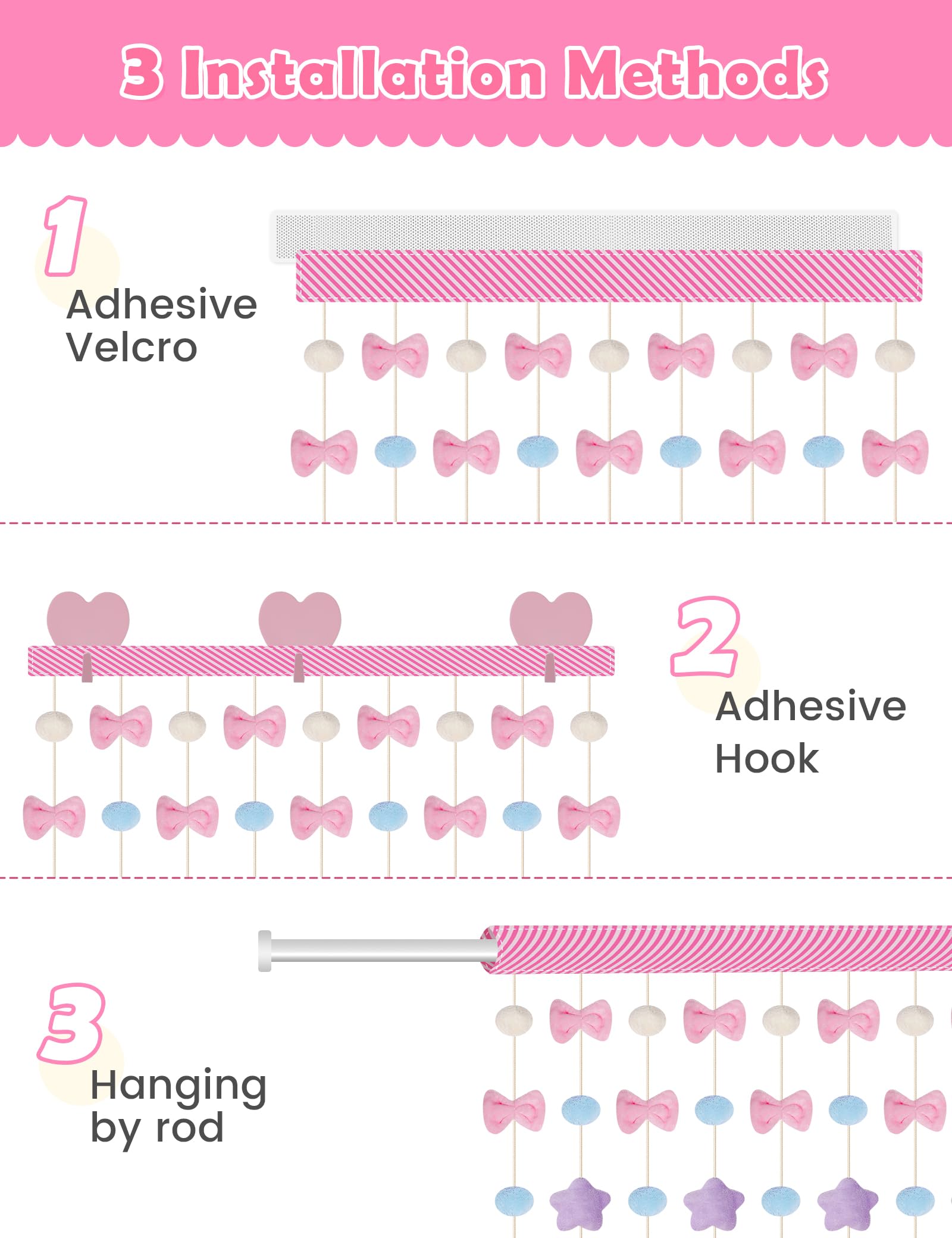 ★【Three Versatile Installation Options】: This door curtain offers a range of possibilities for placement, whether it's on doors, walls, windows, or even as a decorative accent for shelves or cribs. With three convenient installation methods - Velcro, hooks, and pole - you can easily choose the option that best suits your space.