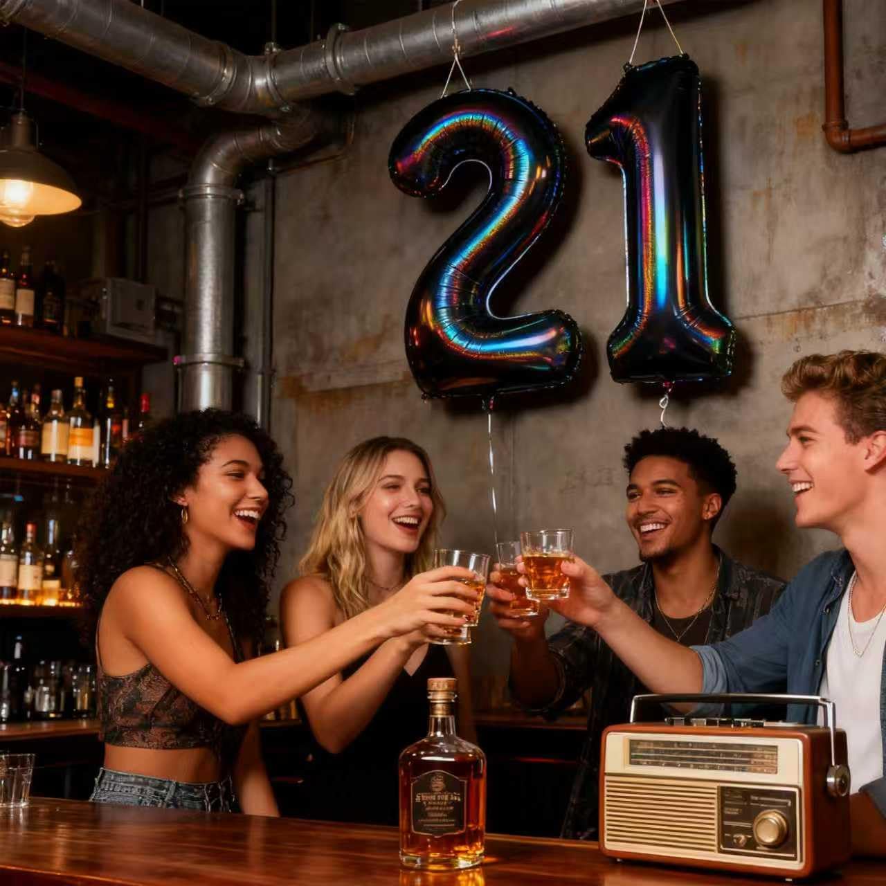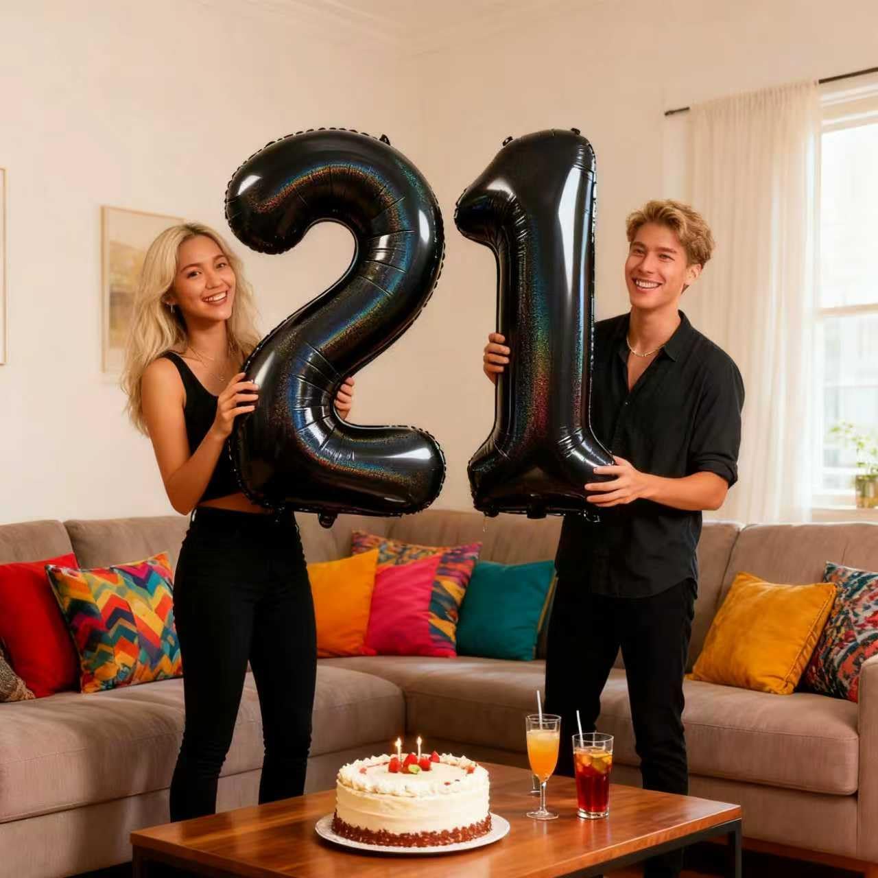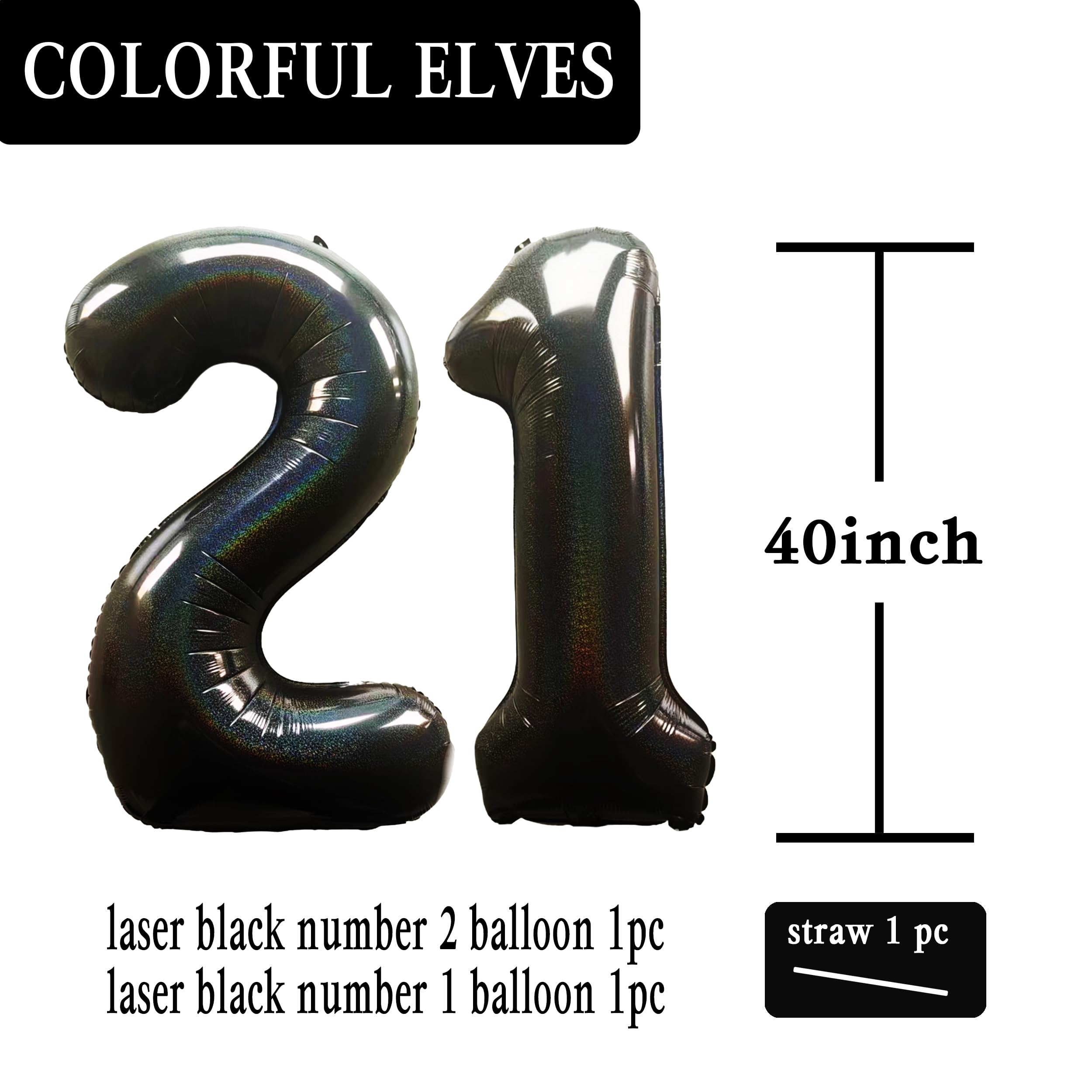 CHOOSE THEM: The Black number 21 balloons are made of aluminum foil, and the size of the balloons is 42 inches, which is 40 inches when filled with helium or air. Please use the straw in the balloon set to inflate it slowly.