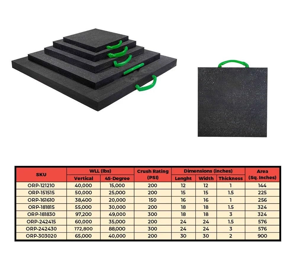 Pack Size: 2 Pack Get Outrigger Pads safety tool for your vehicles’ outriggers, down jacks, or stabilizers. This efficient tool of high-density offers safe operations on various surfaces, preventing vehicle disbalance. If you put your outriggers directly on the ground, there are chances that the ground underneath may shift, be displaced, or collapse. Prevent accidents during crane operations and use our outrigger pads as a safety pad between your vehicle outriggers and the ground. Learn more about it below:- Measurements: The size and thickness of our outrigger pad are 12" (Length) x 12" (Wealth), and 1" (Thickness), respectively. The black and square-shaped outrigger pads are compatible with outriggers, down jacks, and stabilizers to maintain stability and ensure a safe working environment. Durable Material: We’ve engineered our outrigger mats from Ultra-high molecular weight polyethylene (UHMWPE). The material ensures the following features: strength, stiffness, and reliability. Use our robust pads in any lifting and rigging setup and place them under the RV tires, tongue jacks, scissor jack stabilizers, and so on. The high tolerance against acids and alkalis makes it perfect for outdoor use. Anti-Slip & Wide Surface Adaptability: The outrigger pads offer compatibility with various surfaces and grounds, distributing the weight evenly. It prevents cranes from sinking and disbalancing soft ground. You can have secure footing with our anti-slip crane pads, prioritizing safety and environment-friendliness. Easy-to-Use Design: You’ll find a heavy-duty handle in our outrigger pad, which ensures easy transportation and carrying. You can easily carry the outrigger pad following its user-friendly design, thus making it a practical choice for heavy operations. High Performance: Our crane pads have a maximum allowable load crush rating of 200 PSI, ensuring good impact intensity and breaking elongation. Additionally, it has a super compression strength with a great 45-degree load limit of 15,000 lbs and a vertical load limit of 40,000 lbs. Expect high performance from our non-conductive crane pads. Usage: Give your heavy equipment like a support-leg Truck Crane, Crawler Crane, Rough Crane, Boom Pump, Concrete Pump, Fire Truck, etc., an easy-to-use foundation. It also offers a stabilizing setup for small aerial work platforms. **Load-bearing capacity is subject to ground conditions.