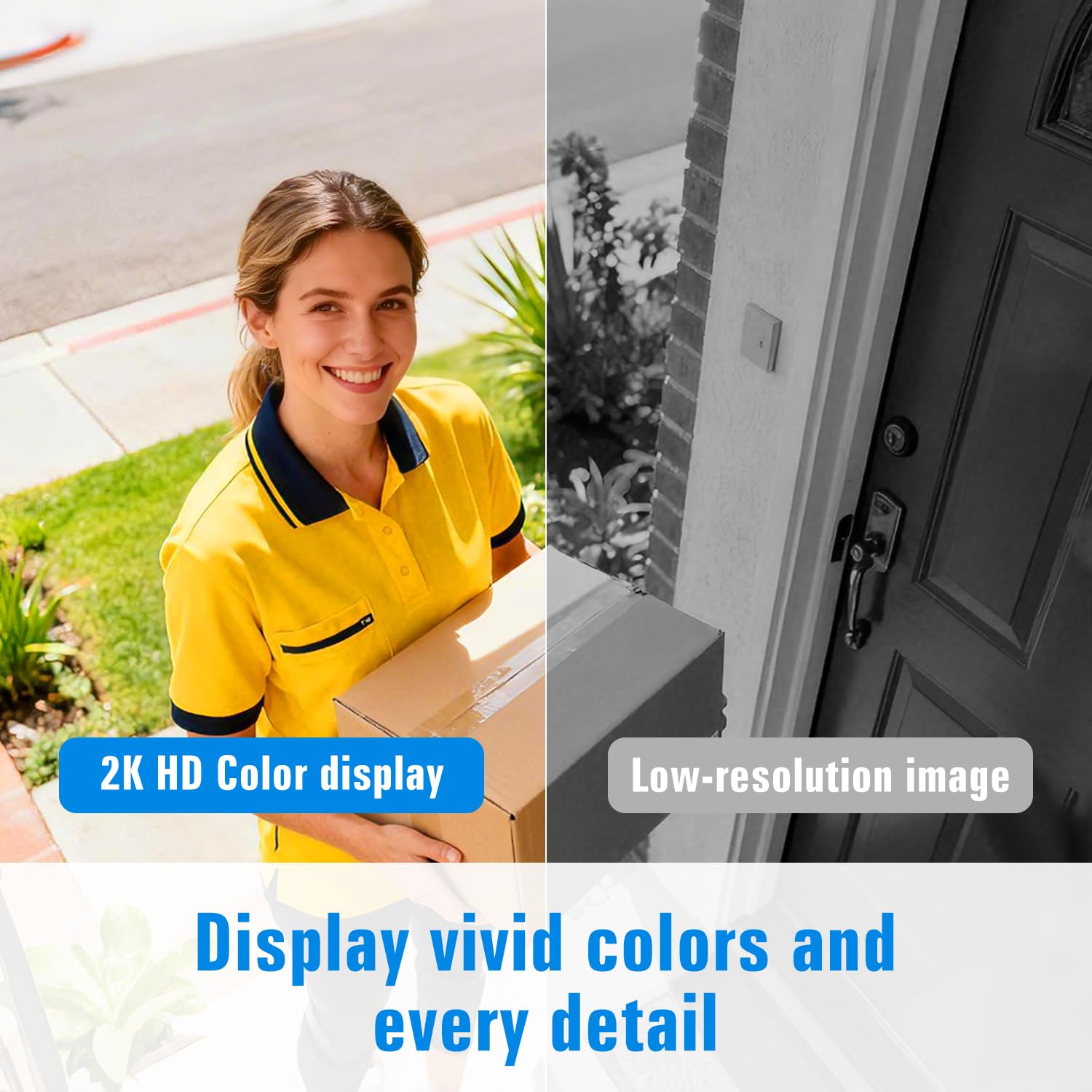 【2K FHD Clarity & Color Night Vision】Cameras for home security delivers 2304×1296 resolution—4x sharper than 1080P—with a wide viewing angle for 2K HD live streaming. It features dual night vision modes (full-color & infrared) with a 33ft range, ensuring clear footage day or night. Access real-time or recorded videos remotely via the mobile app.
