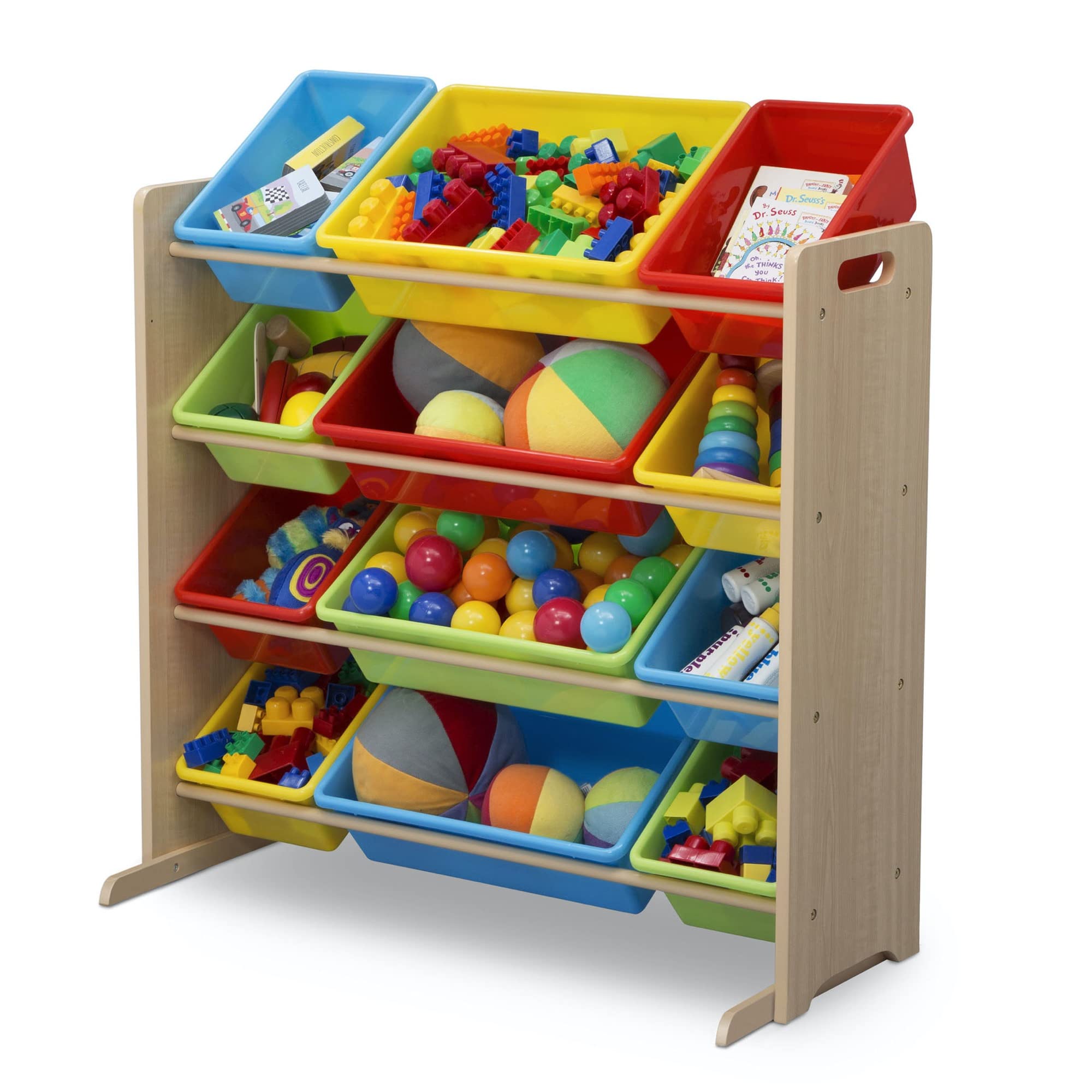 The Delta Children Kids Toy Storage Organizer with 12 Plastic Bins gives you everything you need to create a cute, clutter-free space!The 12 plastic bins are easy to remove and rearrange, and come in two sizes-eight standard size toy bins and four large toy bins that provide enough storage space for toys, games, dress-up clothes, books and more.The sturdy wood frame with four tiers holdsThe bins securely in place, and it'sThe perfect kid-sized height to allow children (ages 3+)The ability to see and access allTheir favorite toys.The brightly colored plastic storage bins can help build your little one's cognitive skills, too!They can explore color identification and sorting, which drives your child to think, learn remember and pay attention. This toy storage organizer comes in multiple color options that will look great in any room of your house, and coordinates with other products in Delta Children's line of kids' furniture. Color options include Natural with Primary Colored Bins, White with Pink Bins and Grey with Blue Bins. Delta Children was founded aroundThe idea of making safe, high-quality children's furniture affordable for all families.They knowThere's nothing more important than safety when it comes to your child's space. That's why all Delta Children products are built with long-lasting materials to ensureThey stand up to years of jumping and playing. Plus,They are rigorously tested to meet or exceed all industry safety standards.