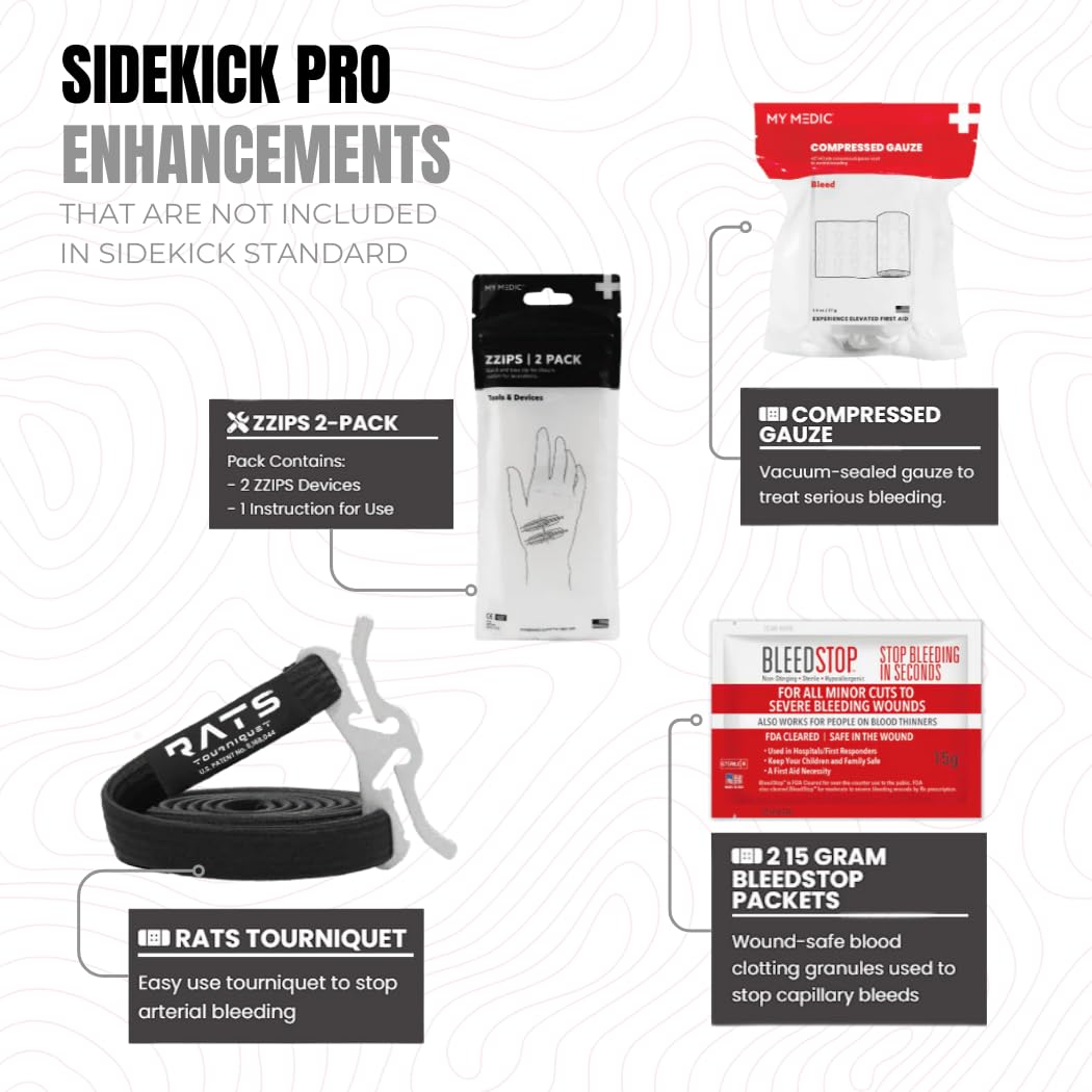PRO KIT INCLUSIONS - Our PRO Kit includes space blanket, tourniquet, gauze, gloves, bandages, blister, mini burn aids, and hydration tools, and more. Can be your personal mini med kit or an addition to you hiking or camping essentials.