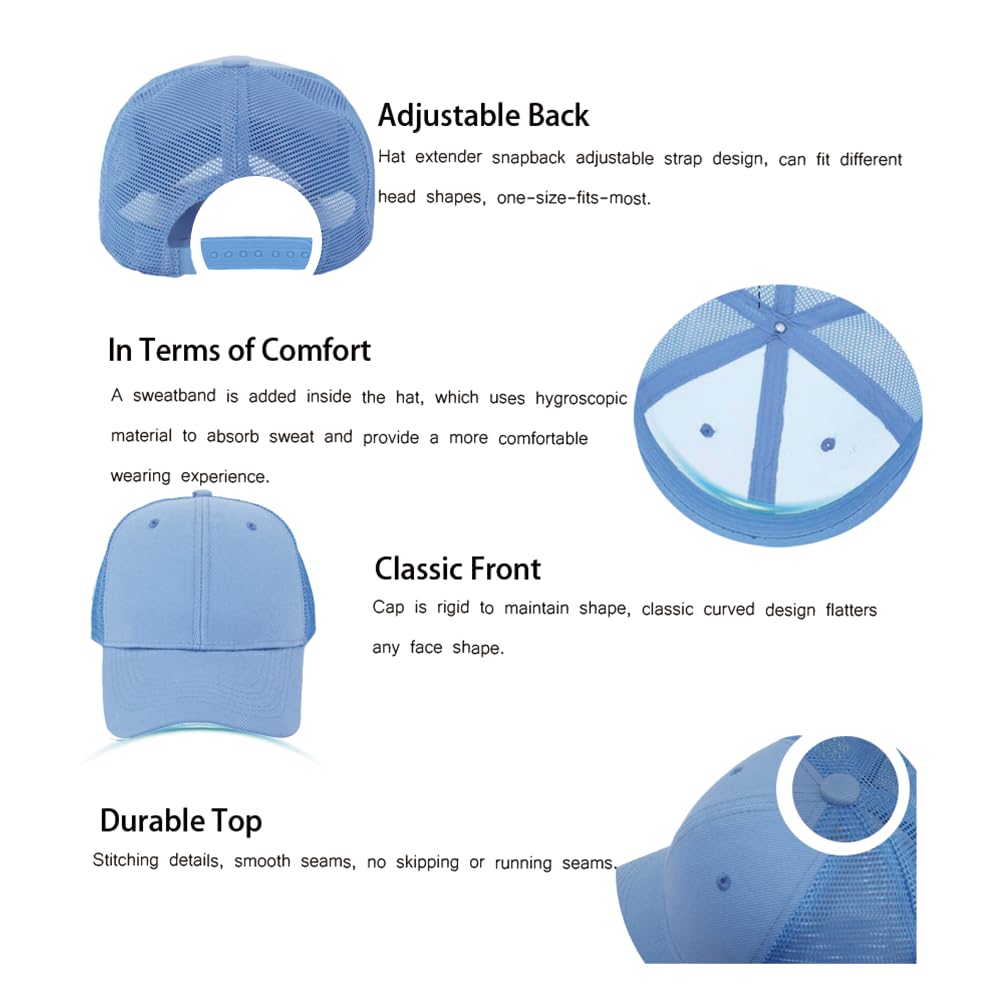 [Comfortable & Lightweight ]: Made from a durable blend of polyester and mesh fabric, our hats are lightweight and comfortable. The front panel and breathable mesh back ensure excellent ventilation , while the brim offers UV protection, making them ideal for outdoor activities.