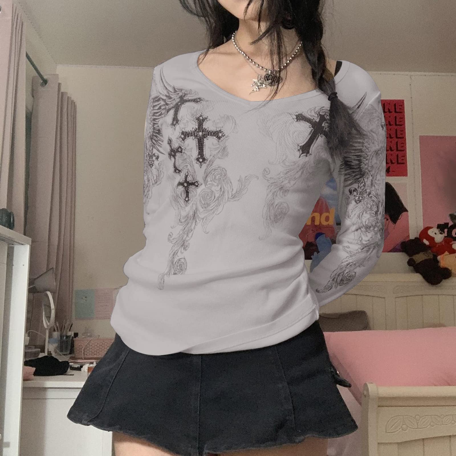 FEATURES: Women's t-shirt, cross, wings print design, long sleeve shallow v neck, simple, comfortable and versatile, smooth and comfortable.