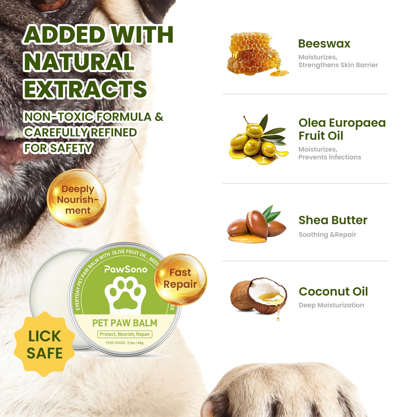 【Lick-Safe Natural Blend】Our dog paw balm is made with food-grade ingredients, safe even if your pup licks it. Enriched with Coconut Oil for deep hydration, Shea Butter to soothe, Olive Oil to soften, and Beeswax to lock in moisture and create a protective barrier against harsh surfaces