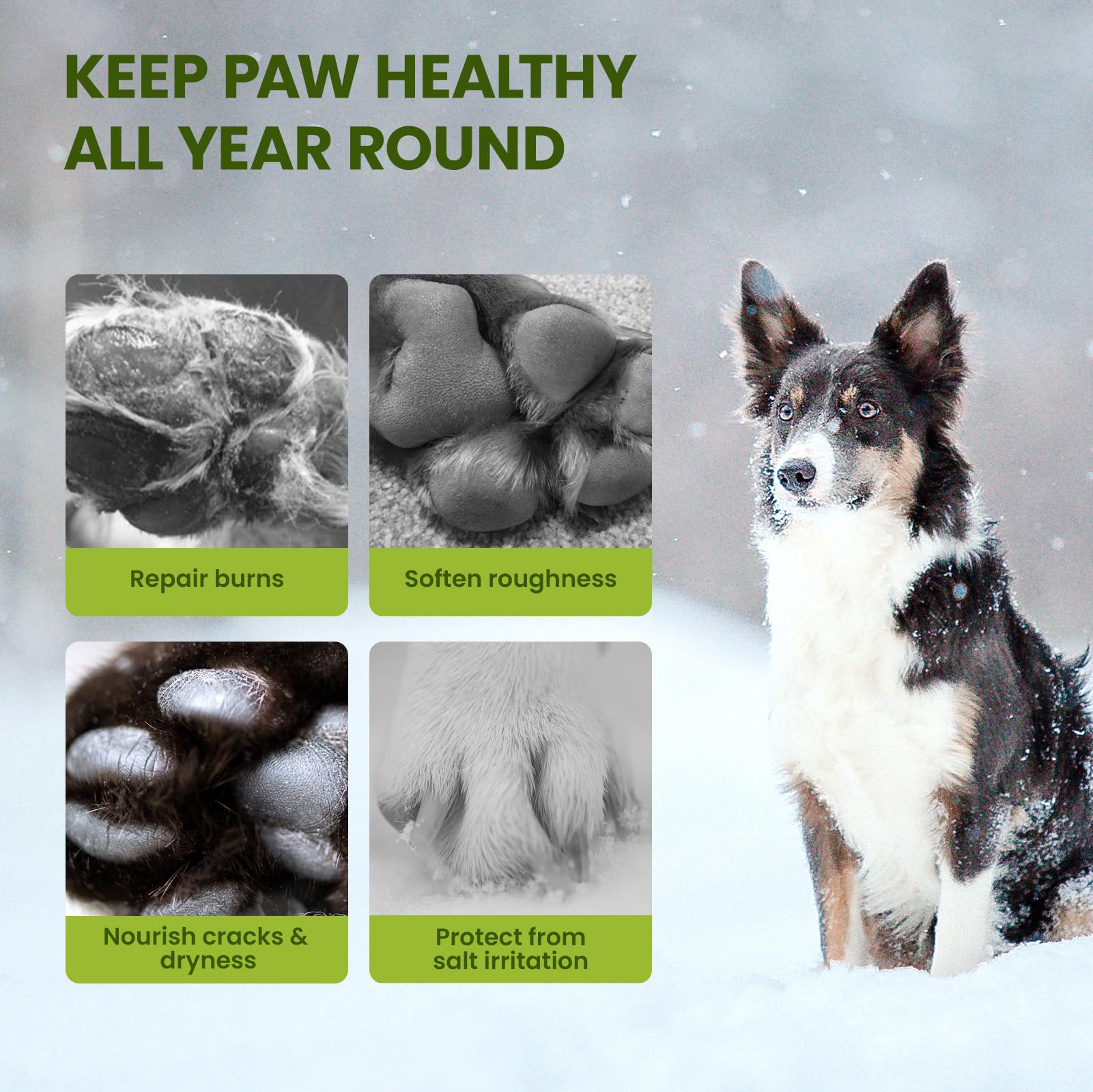【All-Season Paw Protection for Dogs】 Keep your pet’s paws protected in every season! Our paw balm for dogs forms a durable barrier against hot pavement, snow, ice, salt, and rough surfaces. It helps prevent dryness, cracking, and irritation caused by extreme weather, harsh surfaces, and environmental stress. Your dog’s paw pads stay soft, supple, and healthy year-round, providing all-season paw protection for dogs. This is a must-have in your dog's winter accessories collection.