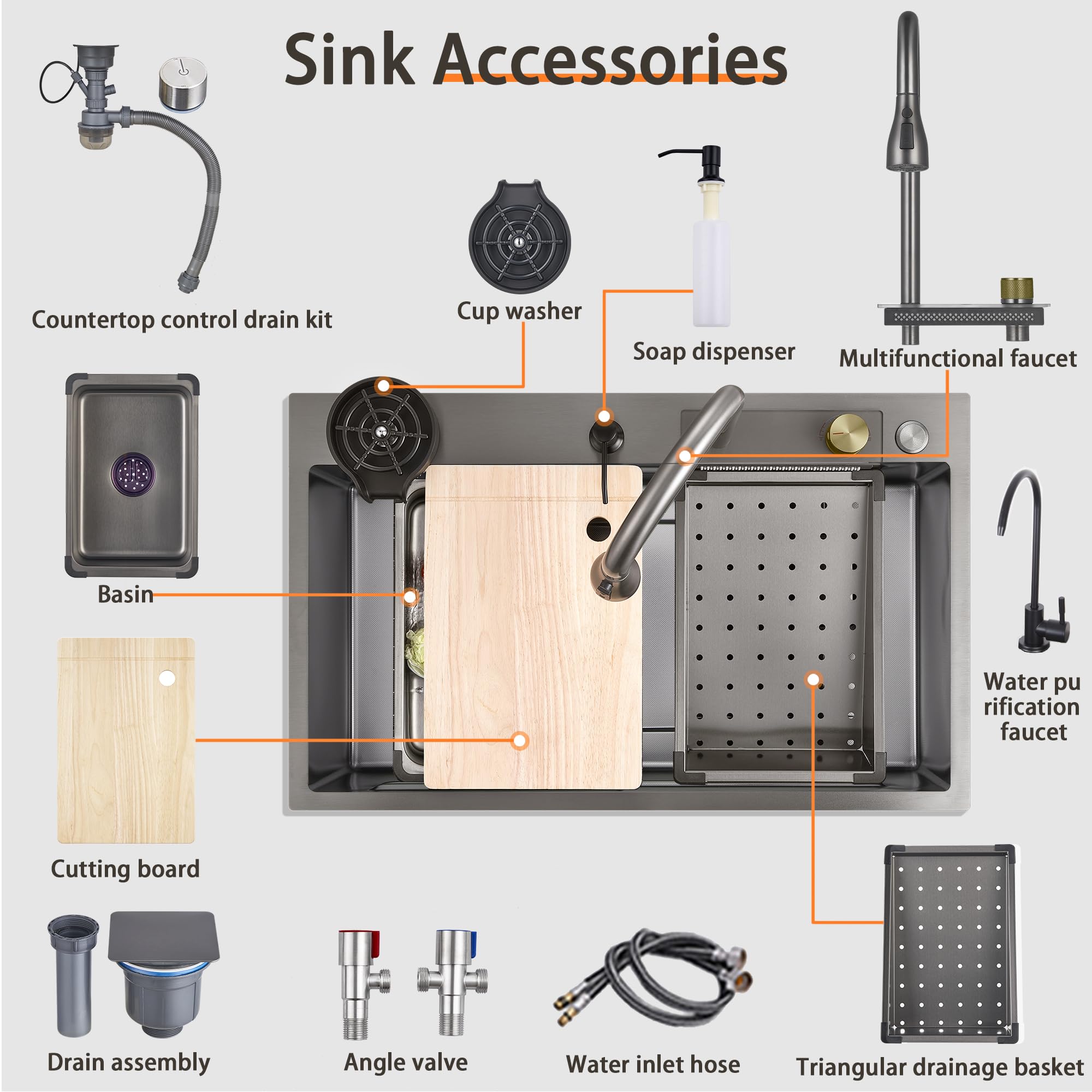 【The package includes】Nano Sink, Water Drainer Set, Flying rain pull-out faucet, Basin, Triangular Drain basket, Water Purification Faucet, Cup Washer, Cutting Board, Angle valve, Water Inlet Pipe. This accessory set is tailored for your daily needs. We take responsibility for the quality of the sink. If you have any questions, feel to contact us!