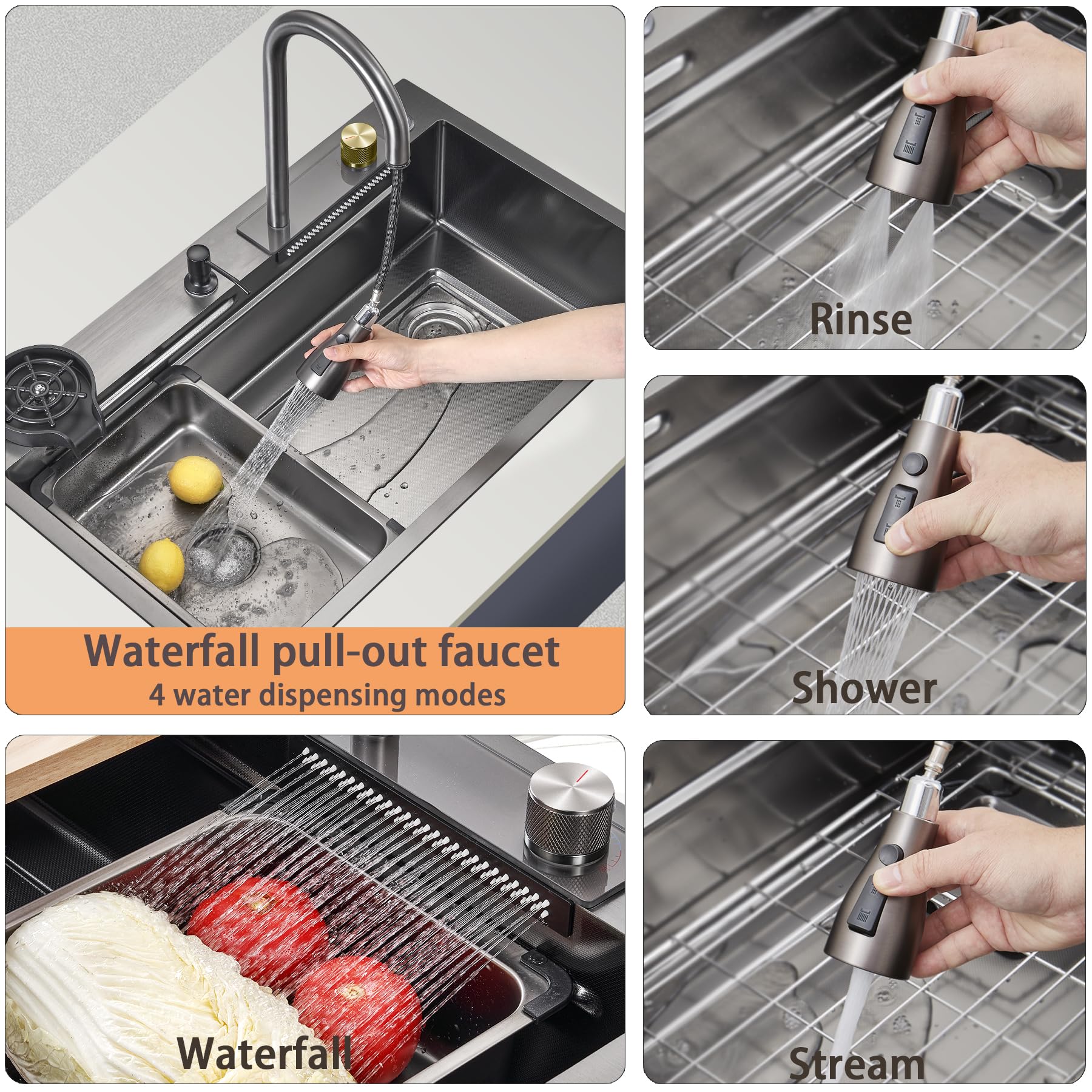 【Unique Faucet Design】The waterfall kitchen sink comes with a dedicated pull-out faucet, allowing easy operation within a flexible range of 60 cm extension. Four cleaning modes (stream, spray, rinse, waterfall) cater to various water usage needs. A knob switches between faucet and waterfall modes, ensuring simple and convenient operation.