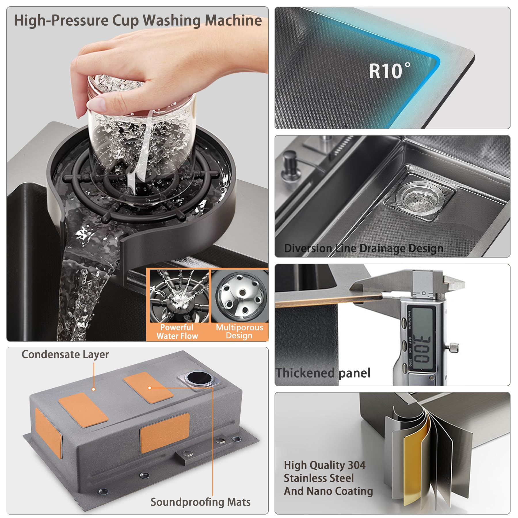 【High-Quality Material】Crafted from premium 304 stainless steel, this sink boasts corrosion resistance, high-temperature resistance, and rust ion. The built-in nano-technology coating s the condensation of oil and water, making cleaning easier