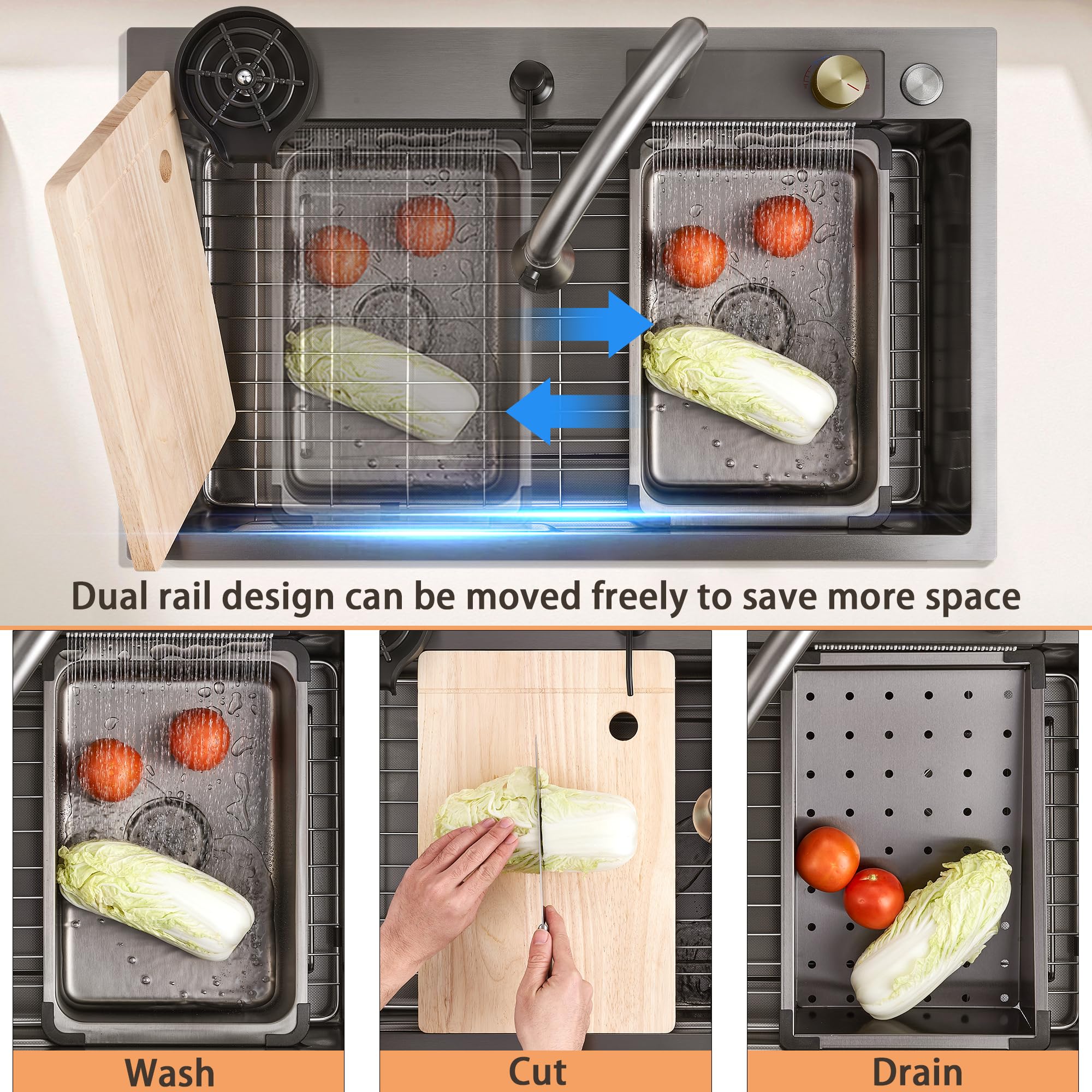 【Multi-functional Area】Featuring a dual-layer sliding design that can be moved left or right, equipped with a movable basin, draining basket, and cutting board. Easily achieve partitioned operations by flexibly moving these accessories, making tasks like chopping, thawing, and washing a breeze.