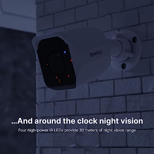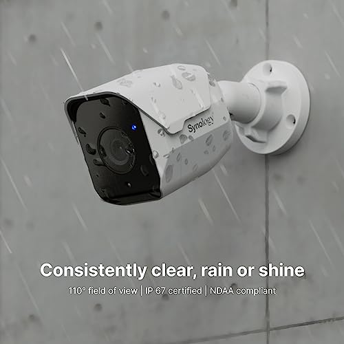 Synology cameras are designed to pair with Surveillance Station, providing unparalleled ease of use thanks to quick and easy setup, batch configuration, and seamless firmware updates. They feature camera-based AI that enhances Surveillance Station deployments with smart capabilities. The BC500 is a versatile IP67-rated 5 MP wide-angle AI camera suitable for both indoor and outdoor use. Boasting a high resolution of 2880x1620 @ 30 FPS, 110° horizontal wideangle view, and night vision capability, the BC500 captures all the details you need.