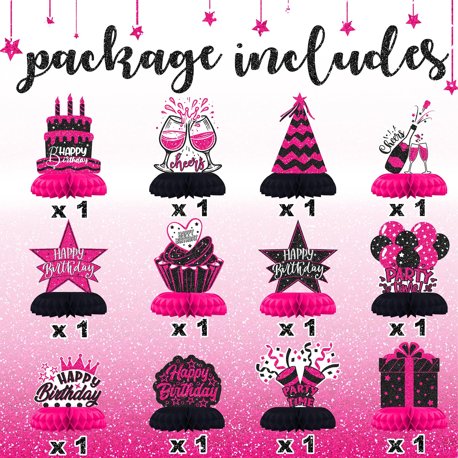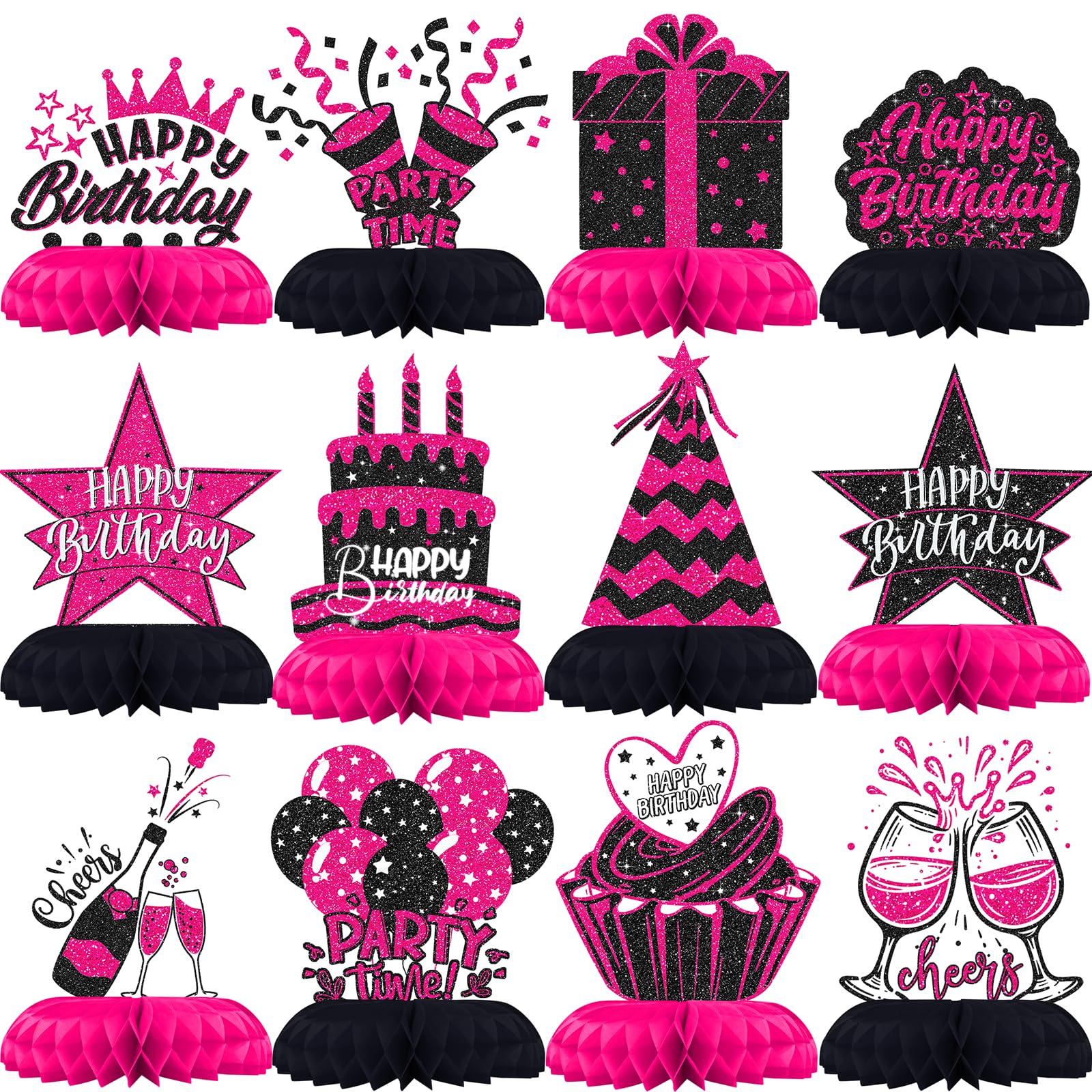 12PCS Happy Birthday Table Centerpieces – Features 12 honeycomb cutouts including birthday cake, stars, balloons, and more – perfect for fun and energetic birthday table decorations.