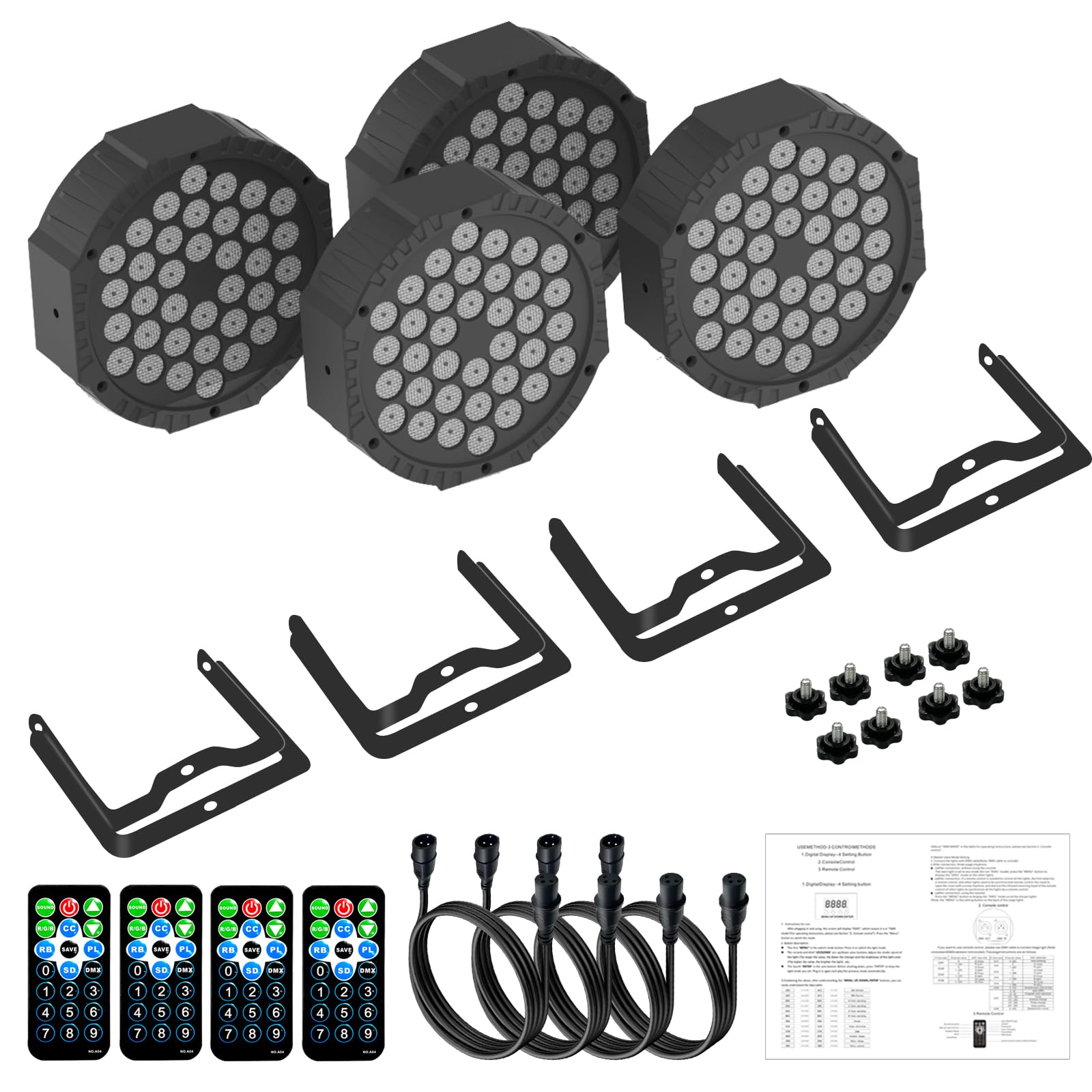 What you get: 4 x par lights, 4 x remote control, 4x1m (3.28 ft) DMX cable, 1x user guide. Simple to install and easy to use.If you have any questions, please feel free to contact us and we will reply within 24 hours.