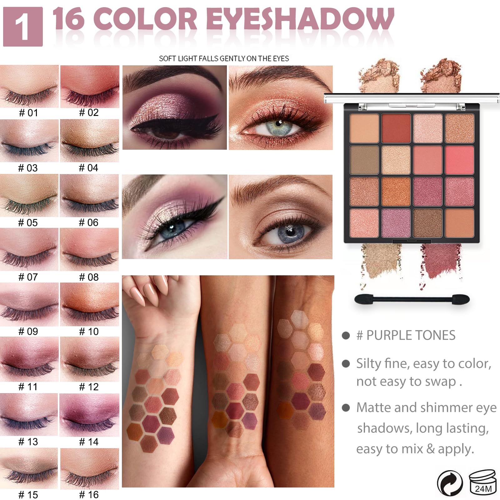 💄ALL IN ONE MAKEUP KIT FOR GIRLS - This makeup kits for women contains: 1 x 16 colors purple tone eyeshadow palette, 1 x waterproof and smudge-shield mascara, 1 x waterproof and smooth liquid eyeliner, 1 x tri-color eyebrow powder, 1 x corgi waterproof material cosmetic bag, 1 x 7pcs Soft Makeup Brush Set. The simple make up set is perfect for makeup artists or starters and beginners achieving a full-face flawless, natural and nude eye makeup effects.