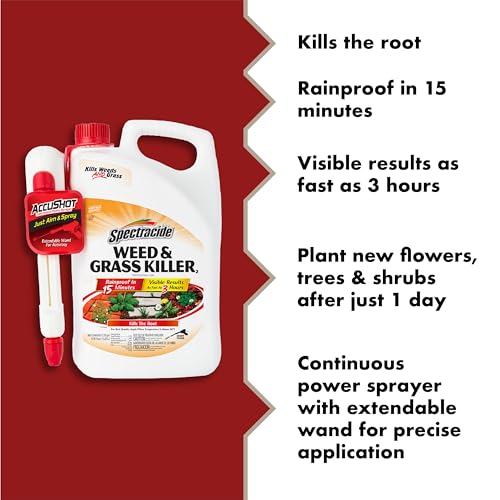 What makes Spectrum Brands' Spectracide Weed and Grass Killer stand out from comparable products is its AccuShot sprayer. Adding a continuous power sprayer with an extendable wand to your fight against grasses and weeds places all the power in your hands, so you're guaranteed visible results in as little as three hours. Battery power provides the magic behind the constant flow of spray and also eliminates the bothersome need for pumping. And because the wand is adjustable, you're not limited in where you can spray or reach. This non-selective herbicide will terminate any vegetation it comes in contact with, and enters plants through their leaves and moves down to the root. This is the best way to ensure the entire plant is destroyed, and how the effective blend mercilessly terminates the root. The spray works great around trees, shrubs, in flower beds, on patios and walkways. It's rain-proof within only 15 minutes, leaves no residue, and you can even replant flowers, trees and shrubs in the same weekend. Do keep in mind that as you use Spectrum Brands' Spectracide Weed and Grass Killer, and you accidentally spray your desirable plants with the herbicide, immediately wash them with water.