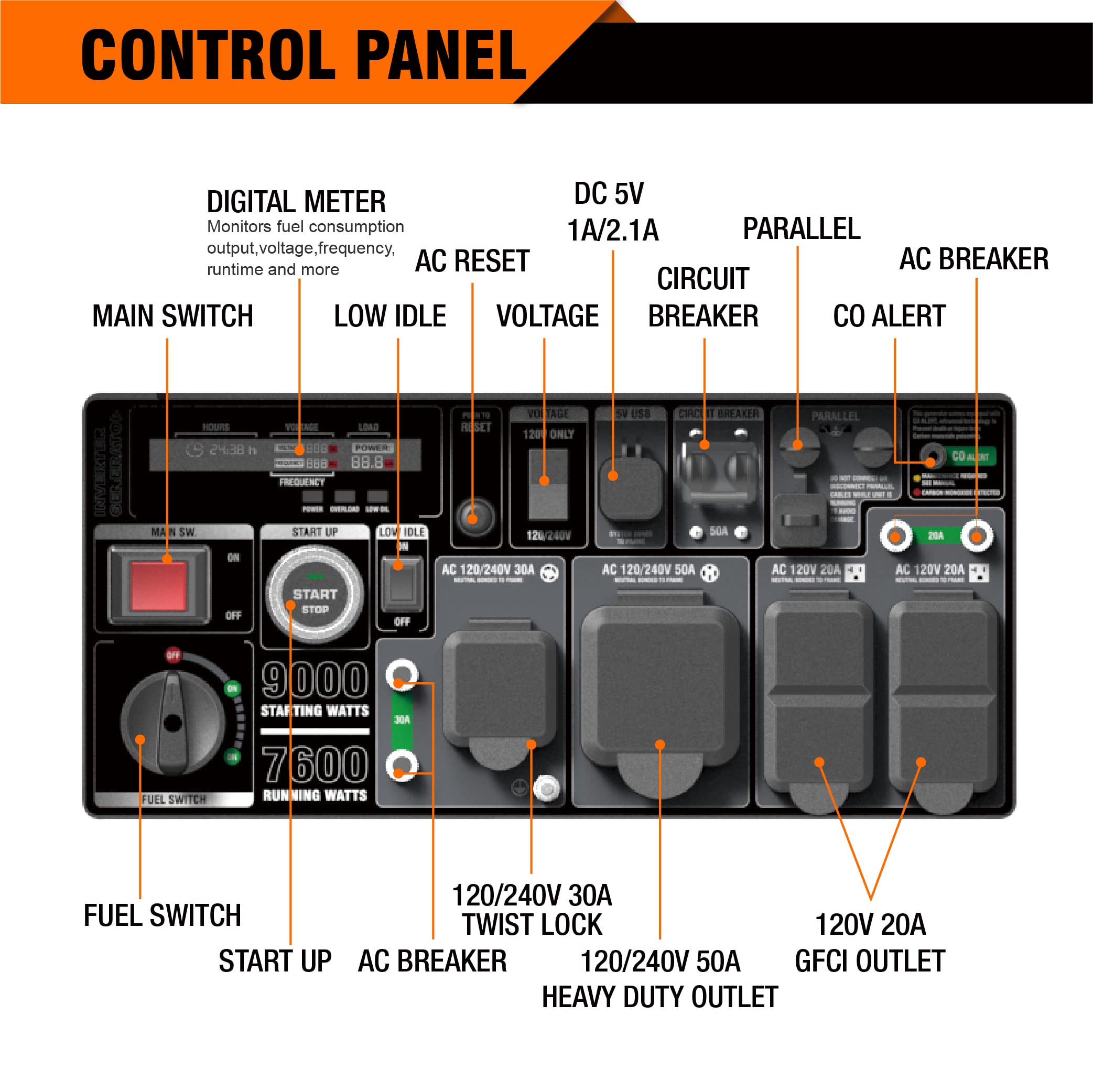 【Powerful Control Panel】The control panel includes a wide selection of outlets for maximum compatibility in your applications including: 4 120V household GFCI outlets, 1 120V 30A twist lock outlet, 1 120V/ 240V 50A outlet. lt also includes a dual 5V 1A/2.1A DC USB posts, voltage switch, low idle switch and one key start button