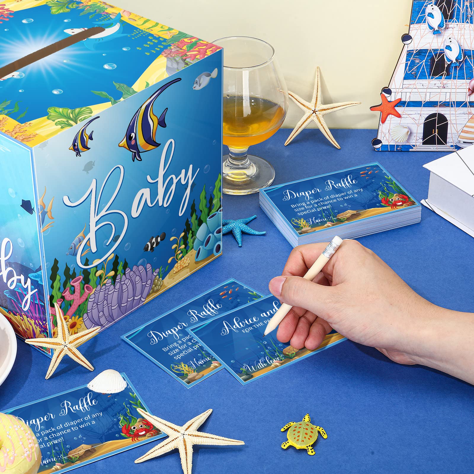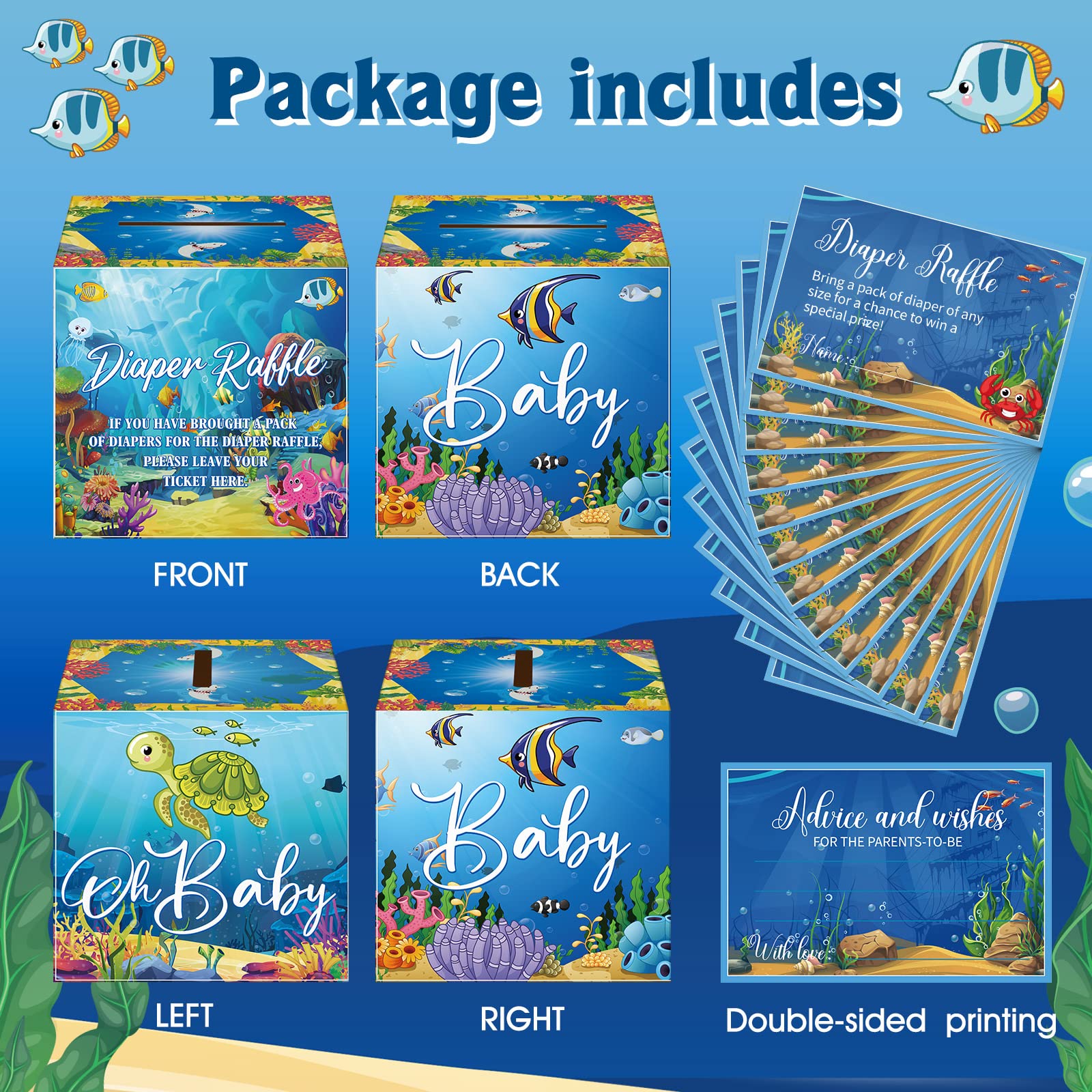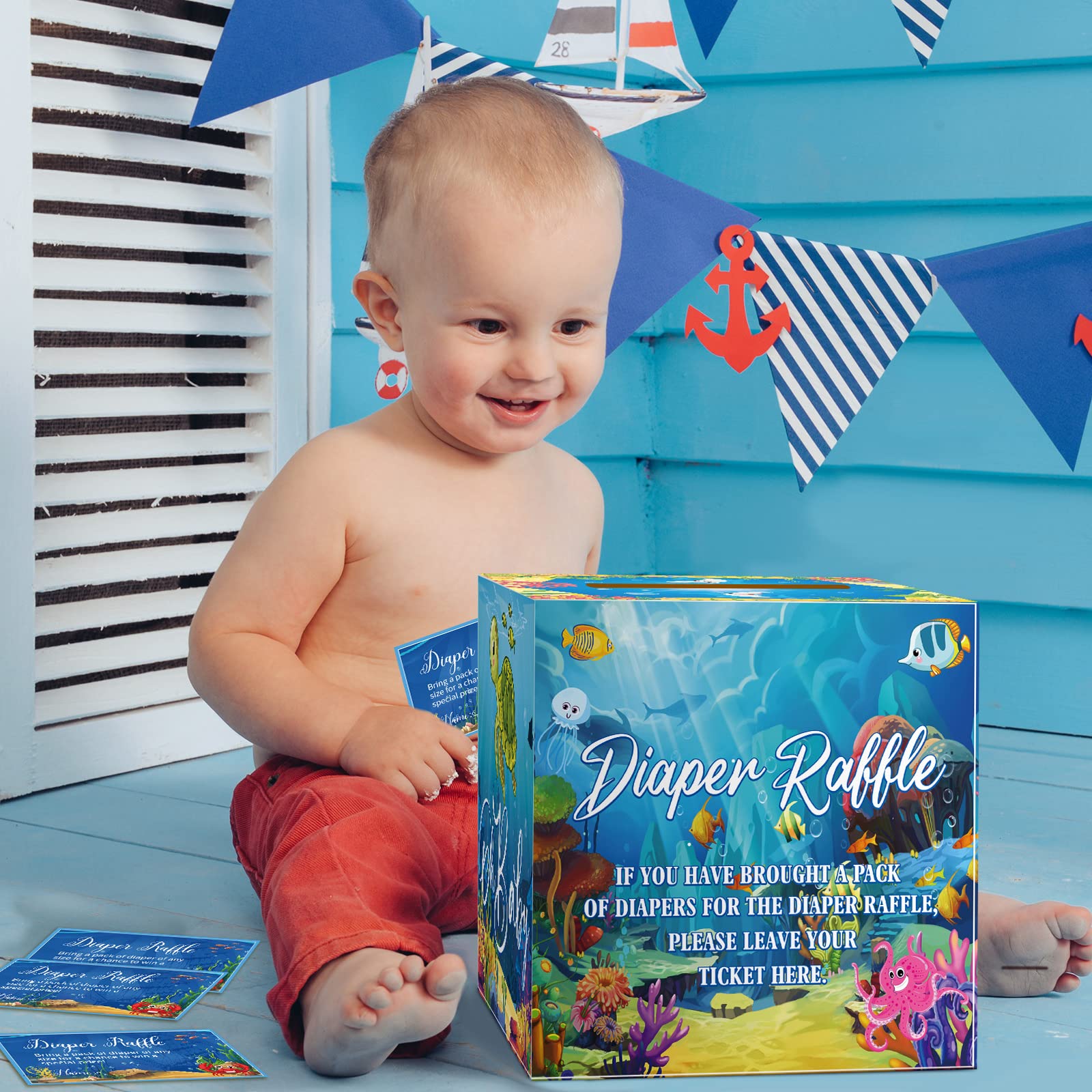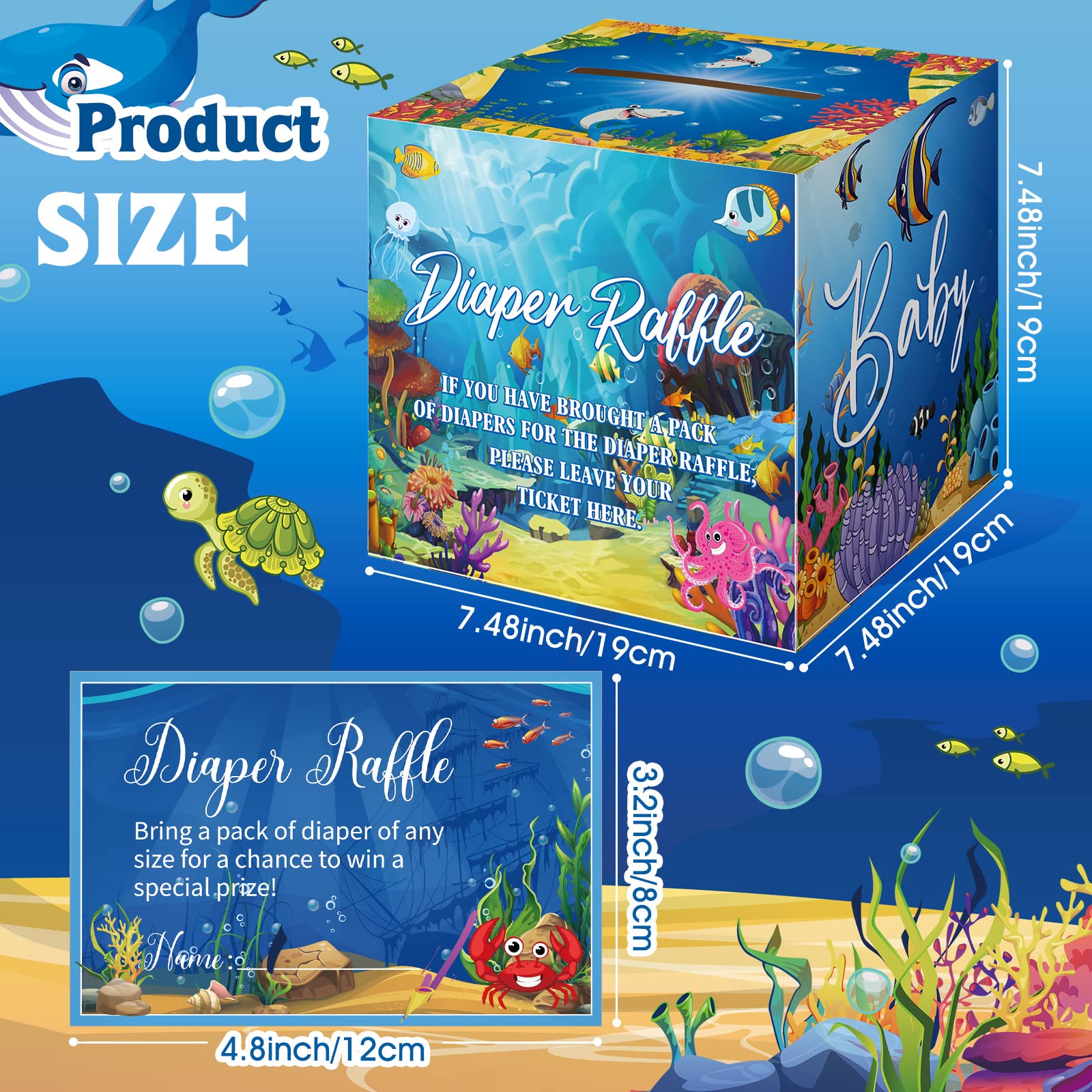 Under the Sea Themed Design: the under the sea shower decorations are designed in the theme of ocean diaper raffle, and printed with relative words and patterns, such as turtle, crab, fish and more, delicate and adorable, creating a warm and joyous atmosphere