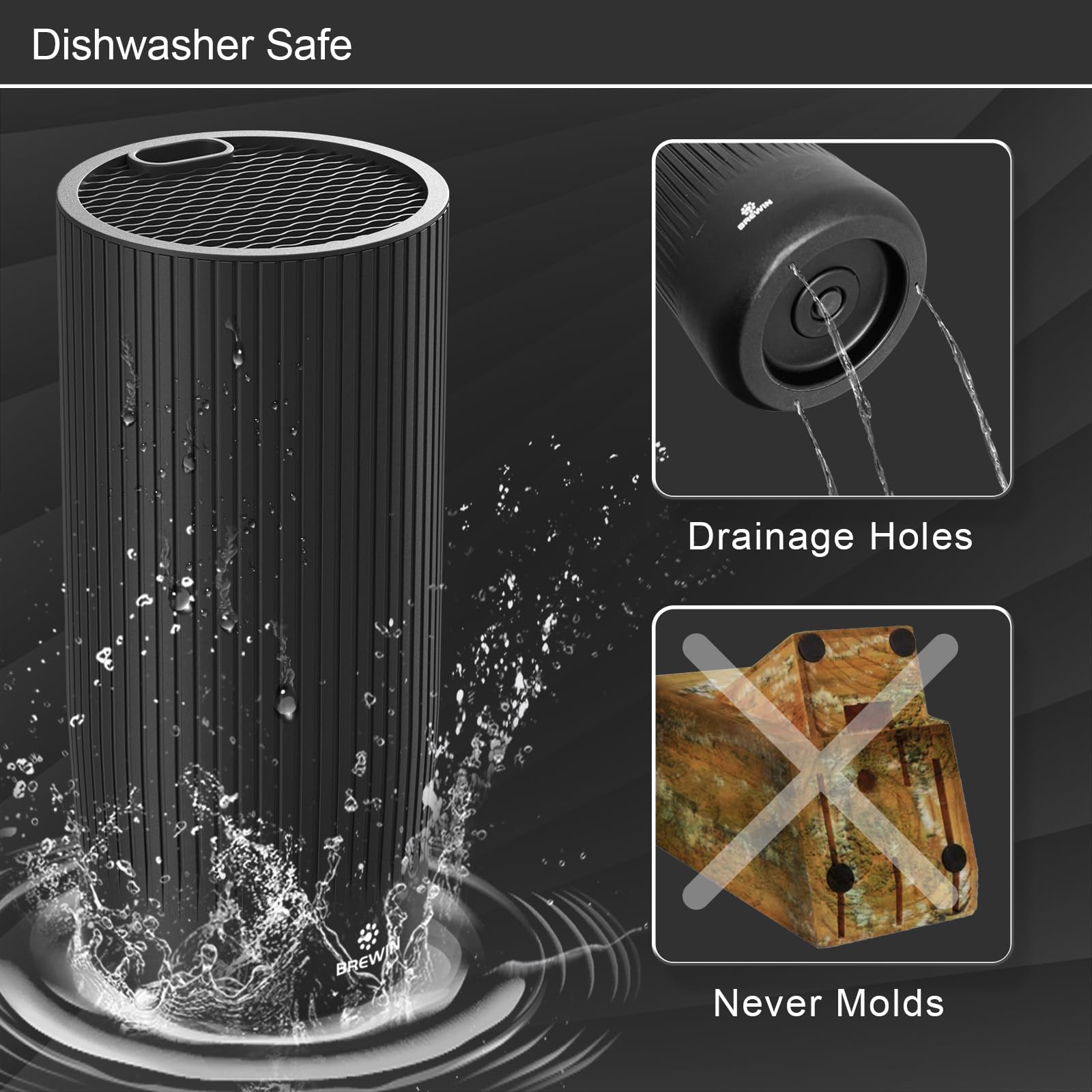 DISHWASHER SAFE - Our aesthetic knife block is made of high density polypropylene, with drainage holes at the bottom. Both knives and block are dishwasher safe.