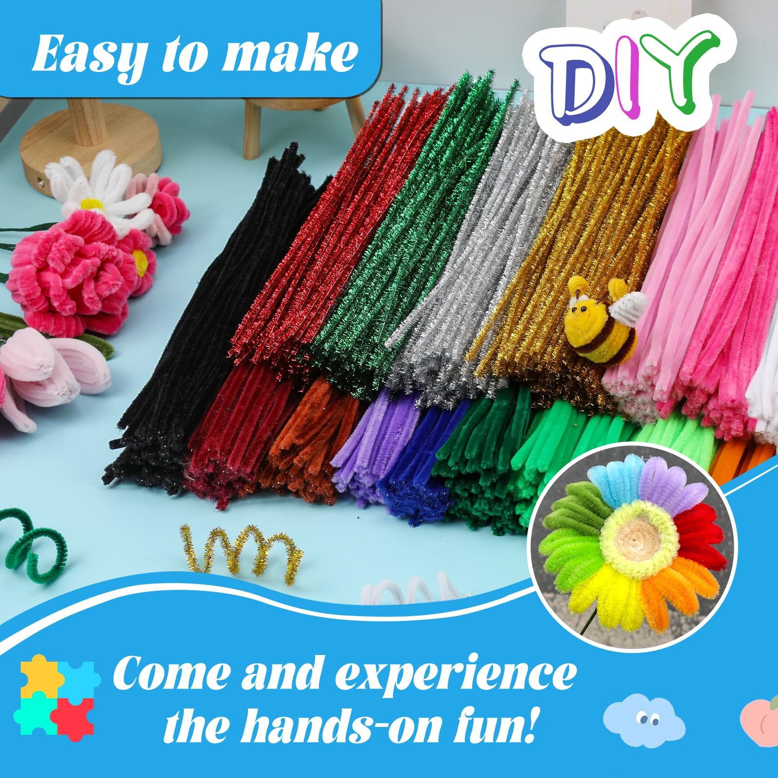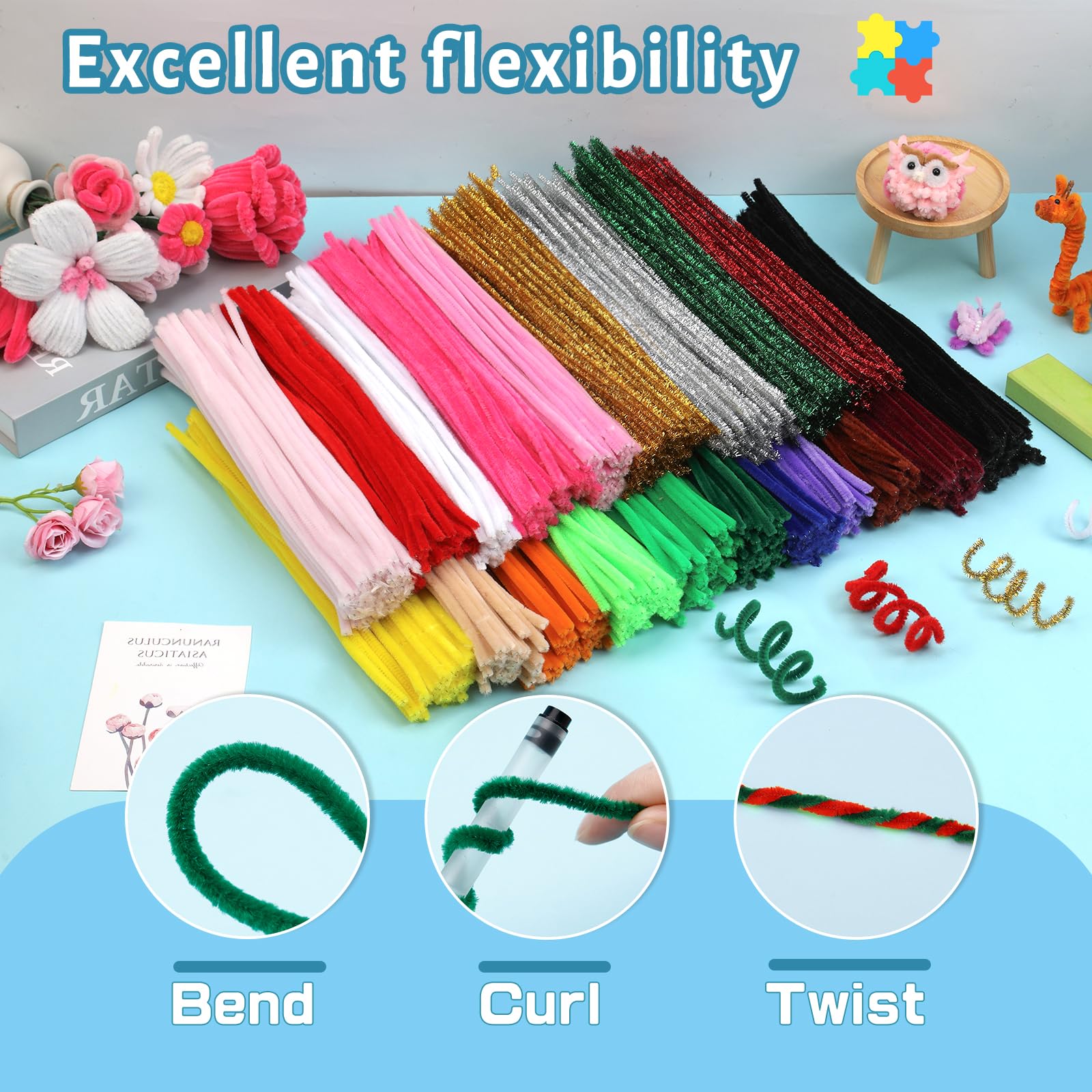 Soft and Flexible: This fuzzy pipe cleaners craft is soft and flexible, made of chenille stems material, and is very easy to shape and bent, twisted or rolled into various shapes, and can also be used to make unique animal or flowers crafts. Whether it is creative handicrafts or other craft projects, it can easily meet your diy needs
