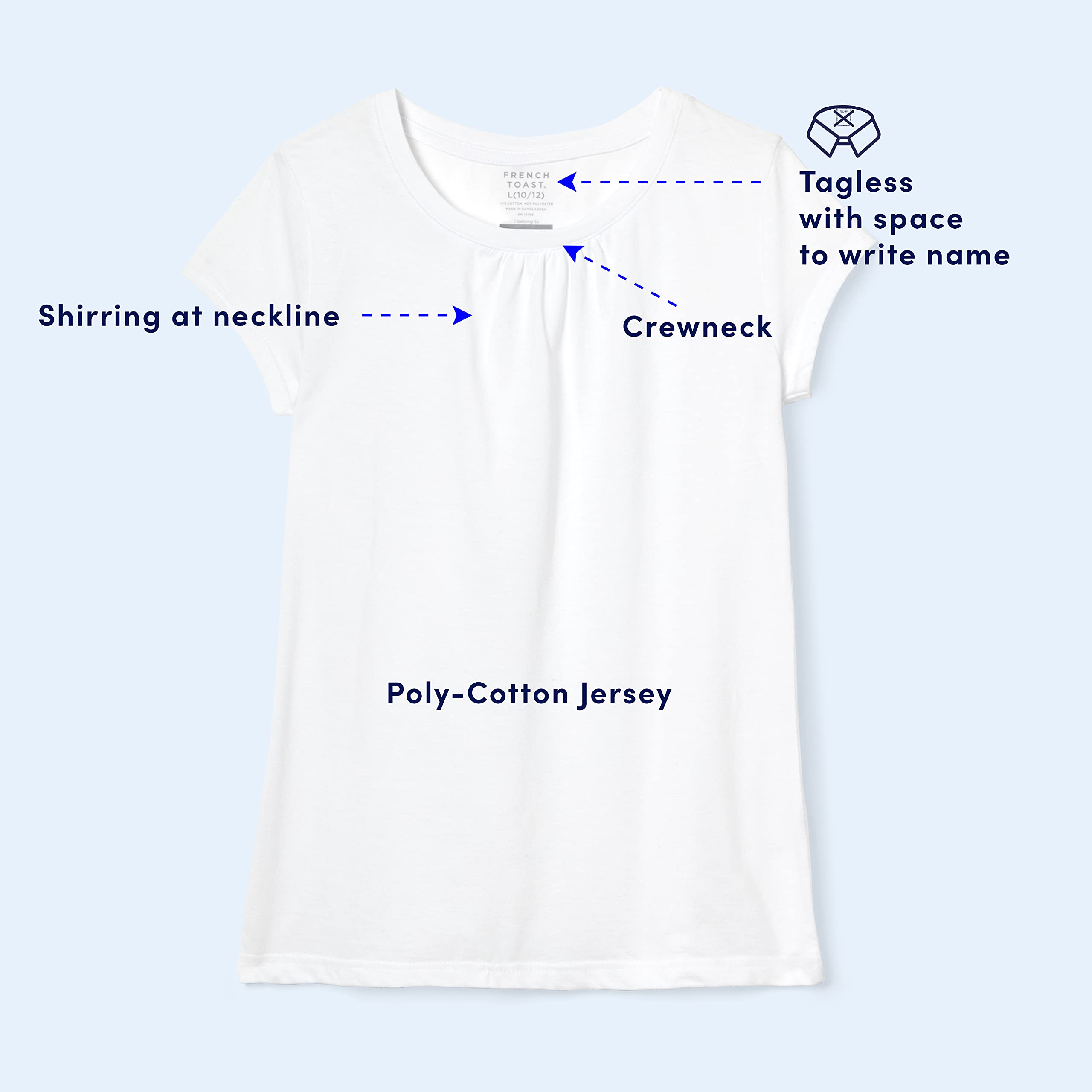 Description A simple twist to a classic tee, she'll be comfortable, casual and stylish. This tee features beautiful gathers along the neckline that add a sophisticated touch. A kids-centric, national brand, French Toast delivers comfort that lasts. We do this with great versatile basics and casual styles that every kid needs every day. With the costs of school clothing for children on the rise, French Toast offers clothing that was designed to stretch the dollar and made with quality that lasts.