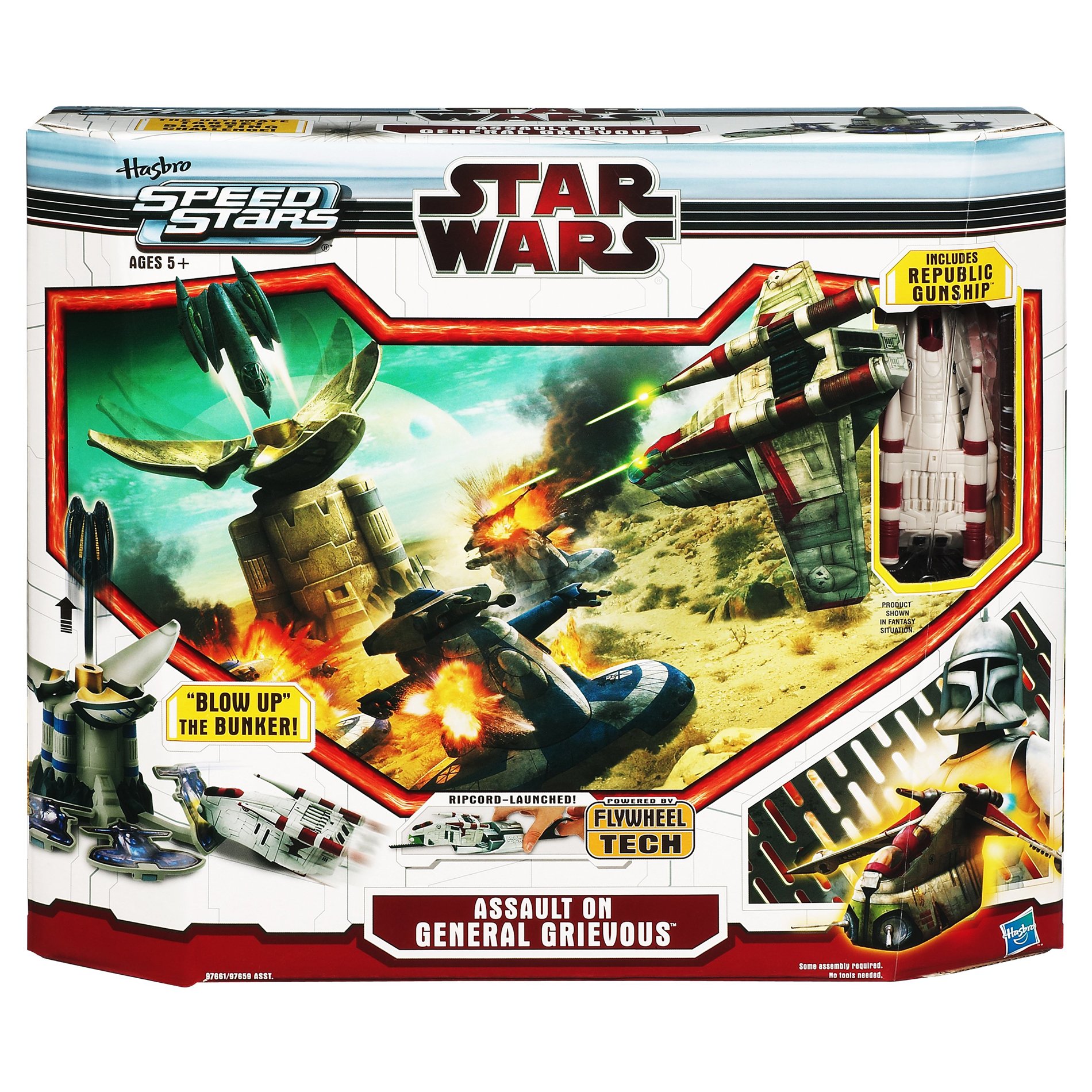 This target-blasting set challenges you to get past the Separatist Tank targets with your ripcord-launched Republic Gunship vehicle and blow up the base. The set features three Separatist Tank targets and an escape shuttle that launches.